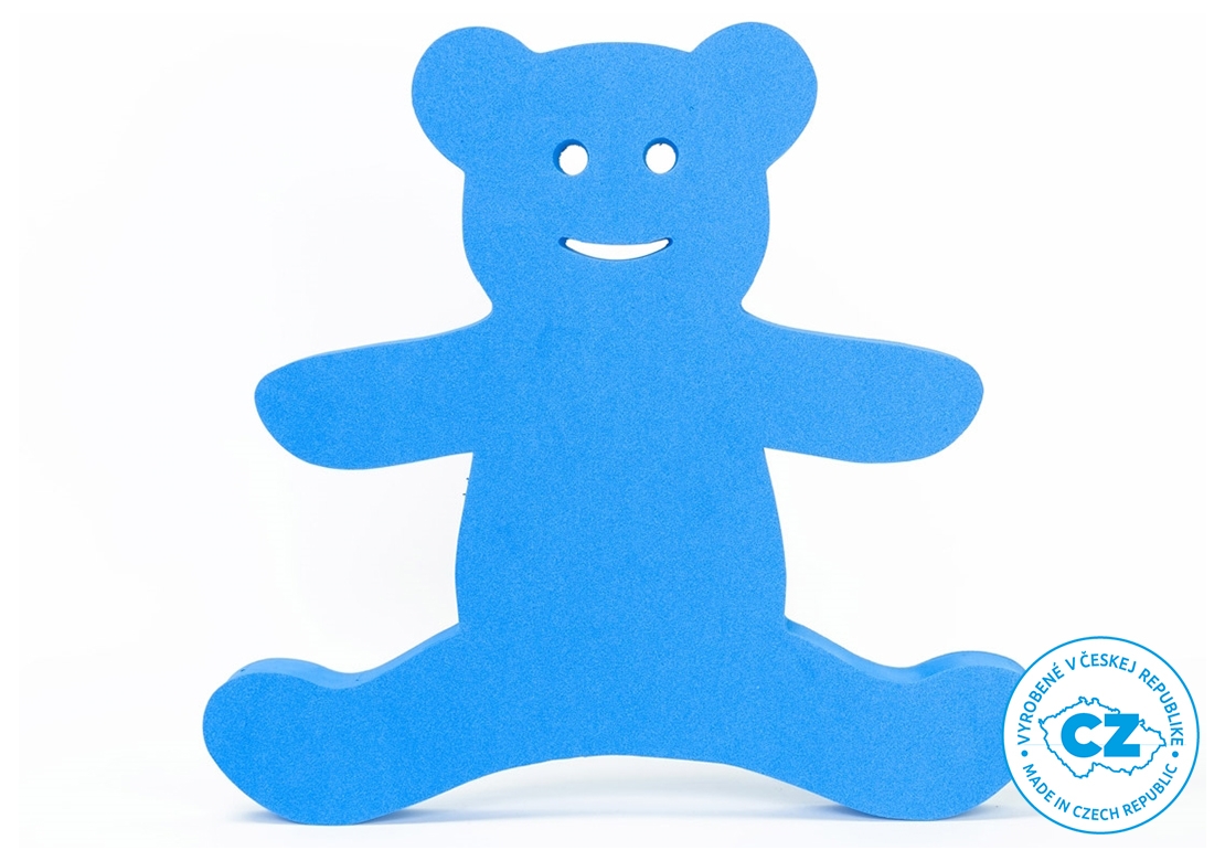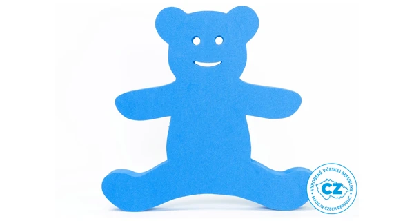 Plavecká doska v tvare medvedíka, v modrej farbe. Je ľahká, s otvormi pre jednoduché uchopenie dosky.