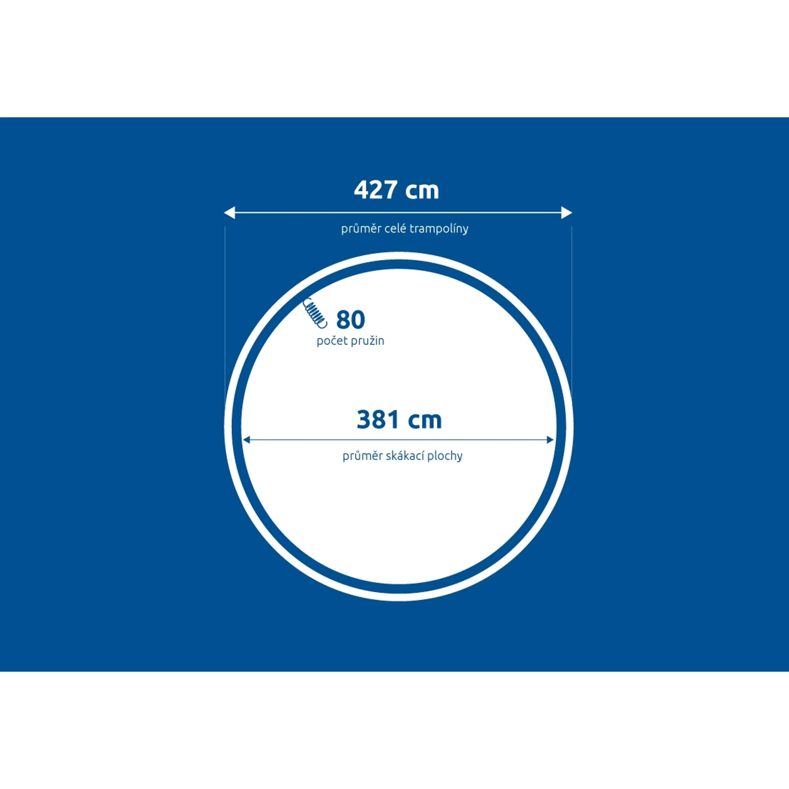 Priemer skákacej plochy: 381 cm (Meria sa po vlákne tkaniny - od jedného okraja k druhému cez stred, tolerancia rozmeru ± 2 cm).