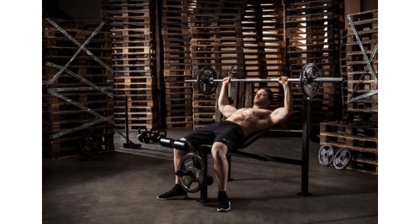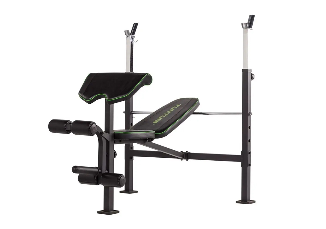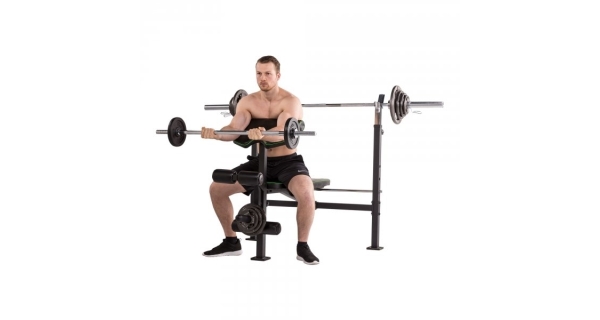 Posilňovacia lavica so stojanom na olympijskú činku a bicepsovým pultom