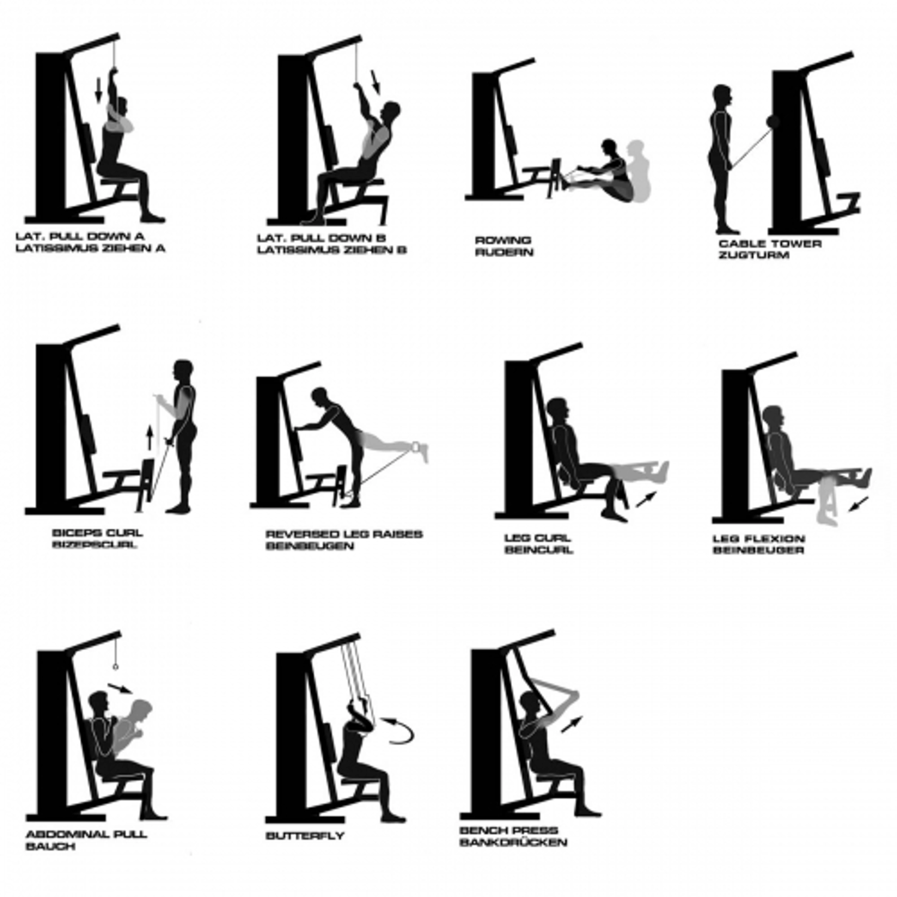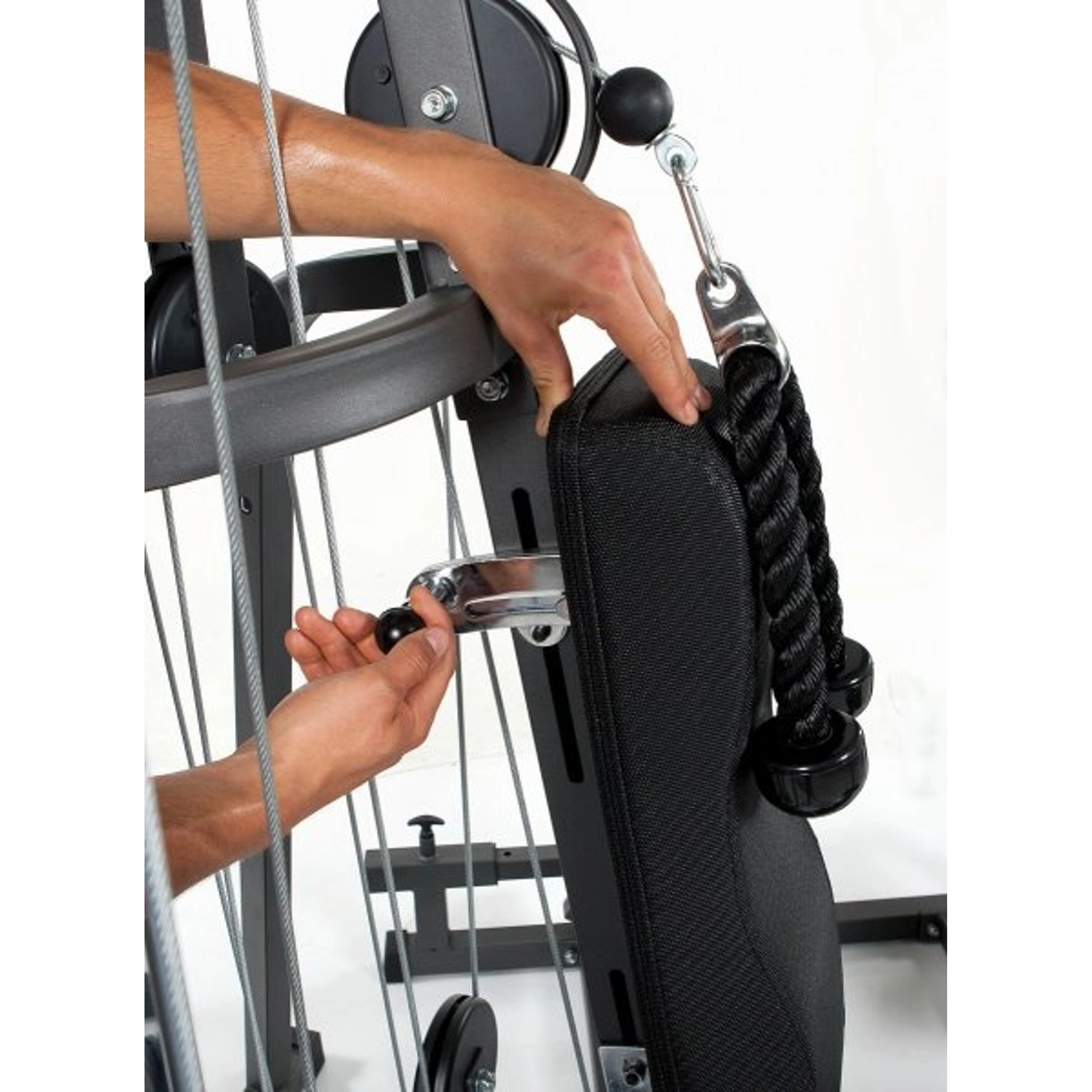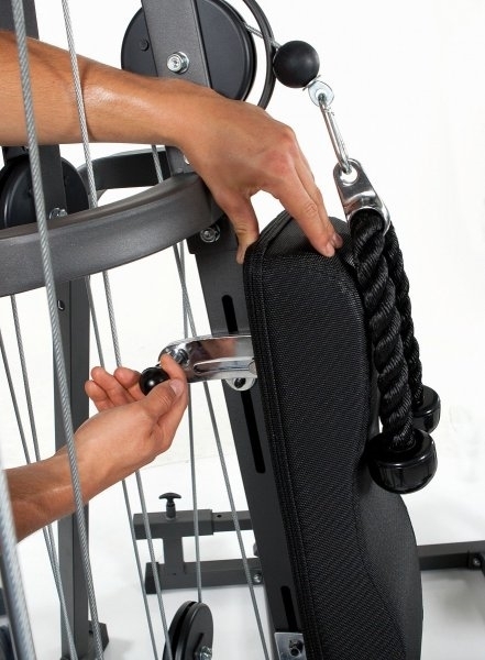 Konštrukcia disponuje hornou kladkou na sťahovanie (tricepsu, širokého svalo chrbtového, bicepsu a pod.), ďalej spodnou kladkou na veslovanie (chrbtové svaly), bicepsových zdvihov, príťahov na ramená a mnoho ďalších. Adaptéry majú protišmykový povrch pre pevný úchop a protišmykové nášľapy pre maximálnu stabilitu. Samotná konštrukcia je z masívnych hrubostenných štvorcových profilov pre maximálnu stabilitu.