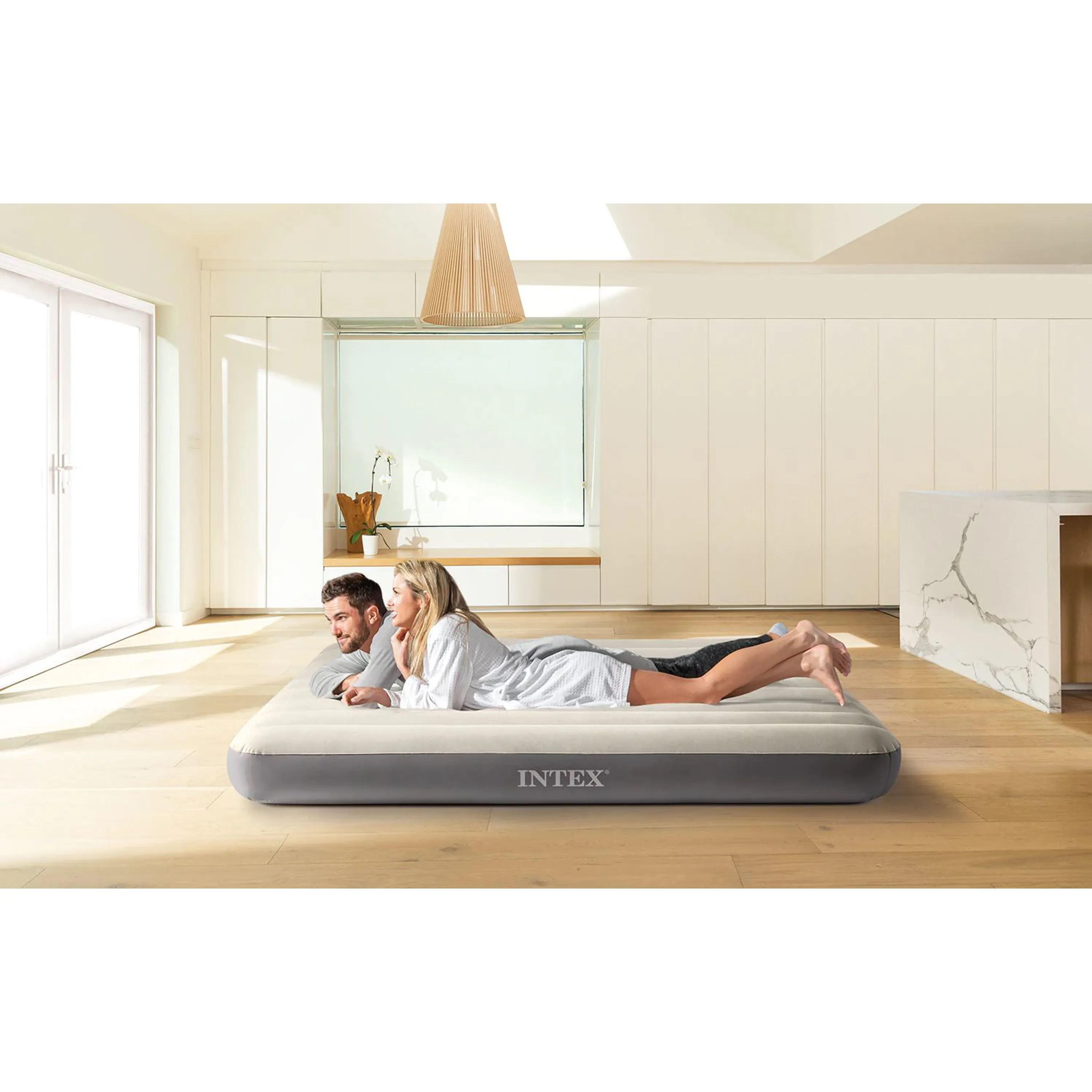 Nafukovacia posteľ vhodná pre 2 osoby, s integrovaným nafukovacím ventilom 2v1. Hrúbka steny je 0,53 mm, má kvalitné, príjemný semišový povrch. Posteľ je bez obsahu ftalátov. Špeciálne PVC s vonkajším semišovým poťahom zaručuje väčšiu odolnosť proti prepichnutiu postele. Pozdĺžne výstuhy zaručujú vyššiu pevnosť, tuhosť a pohodlie pri ležaní. Technológia výstuh Dura-Beam.