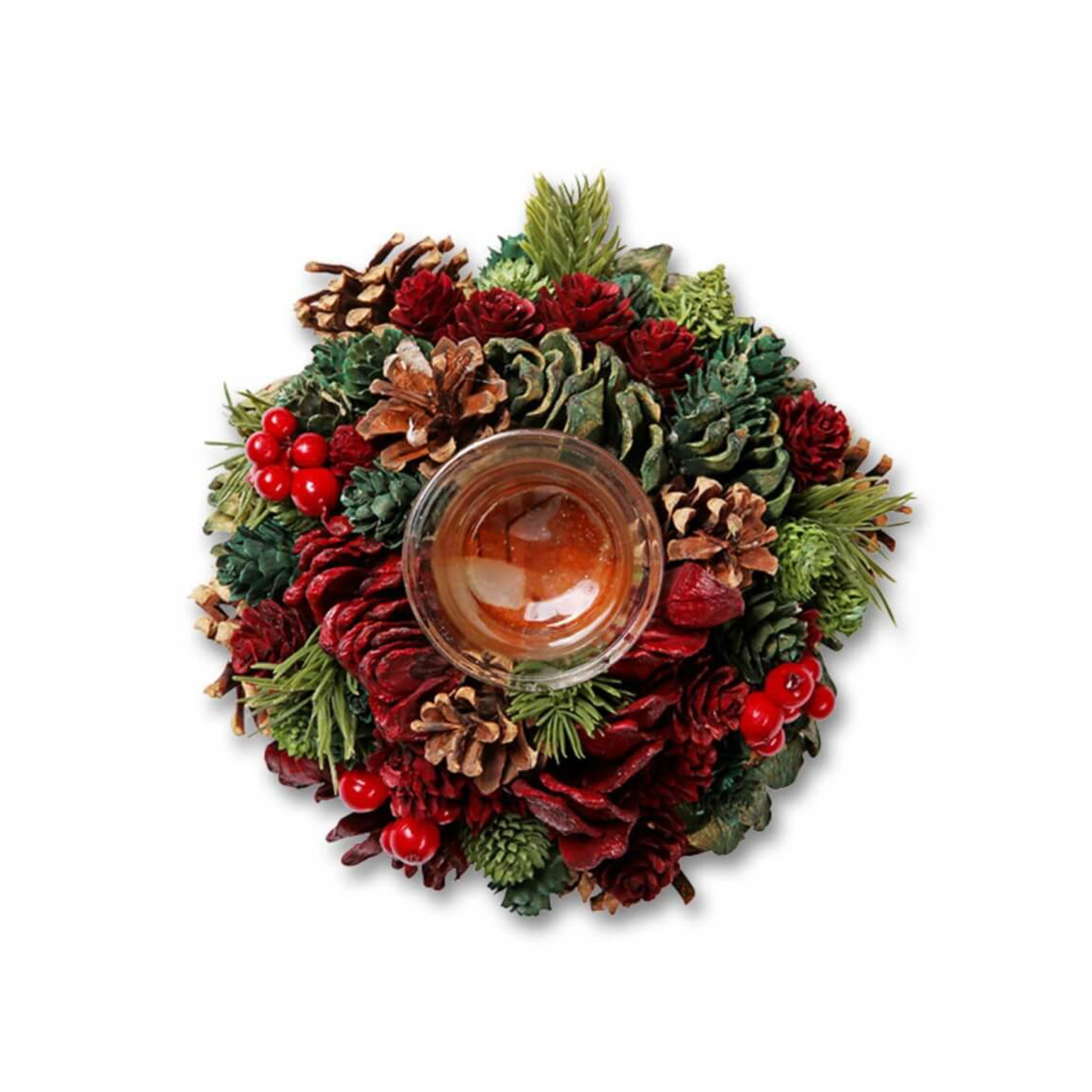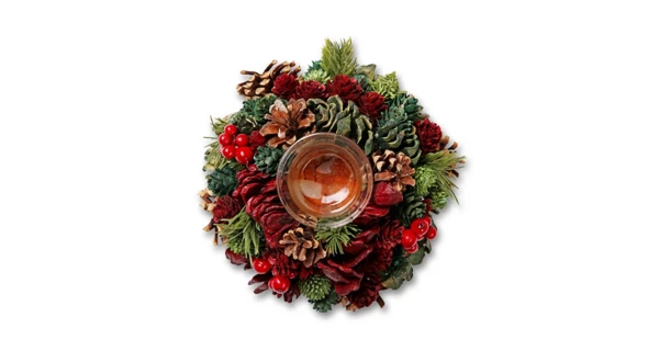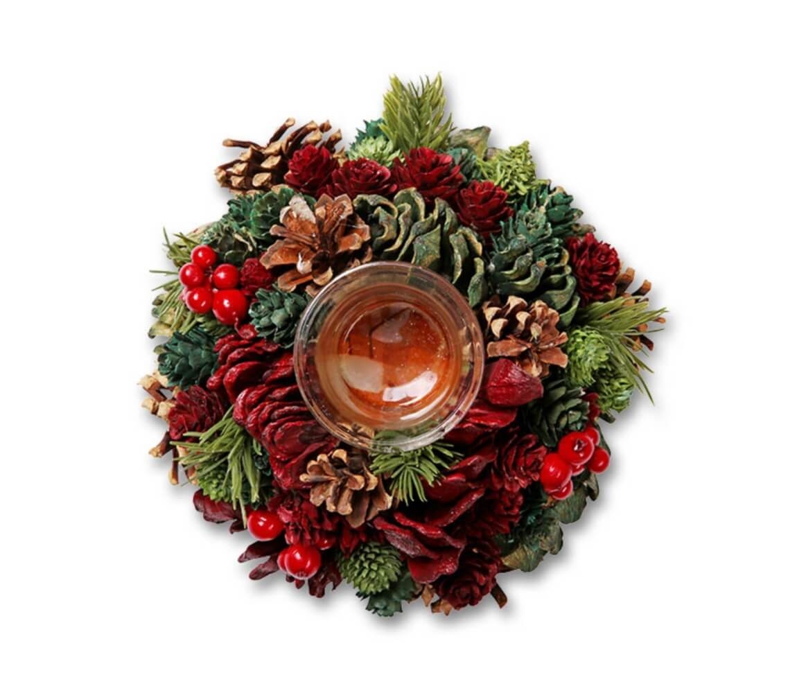 Stojan na sviečku v tradičnom poňatí kombinuje červenú a zelenú farbu. Je ozdobený šiškami, vetvami a červenými plodmi. Stojan na sviečku je sklenený.