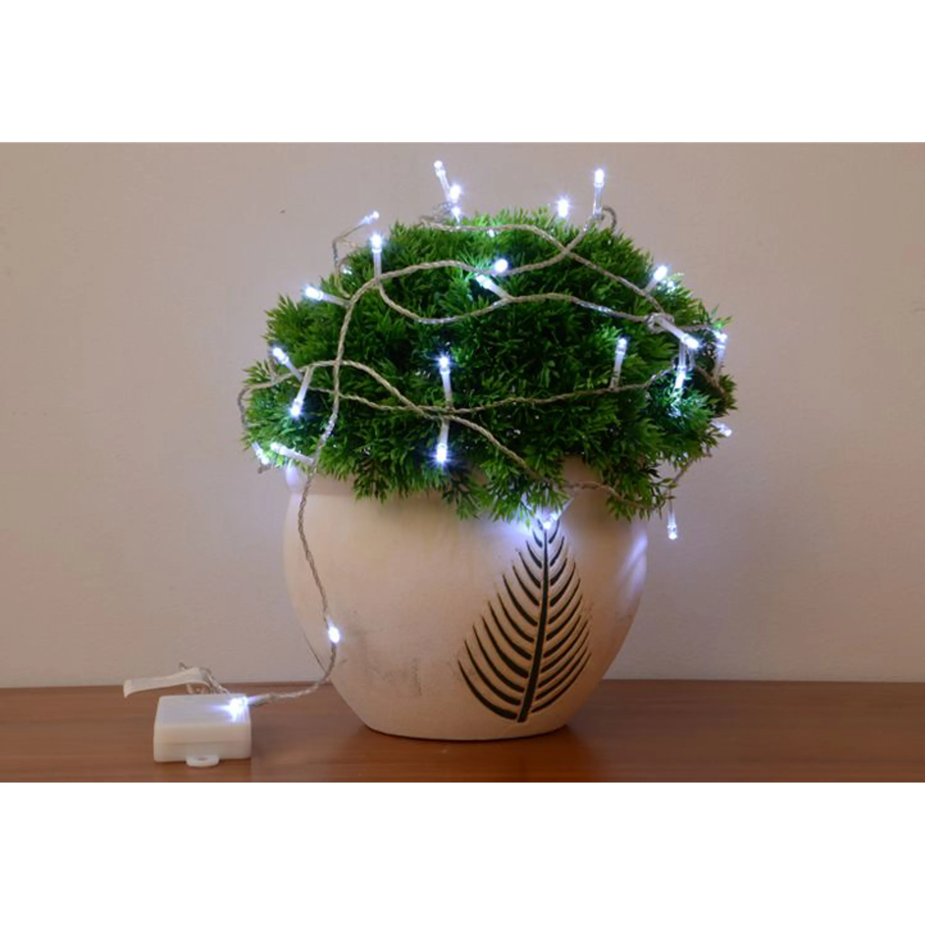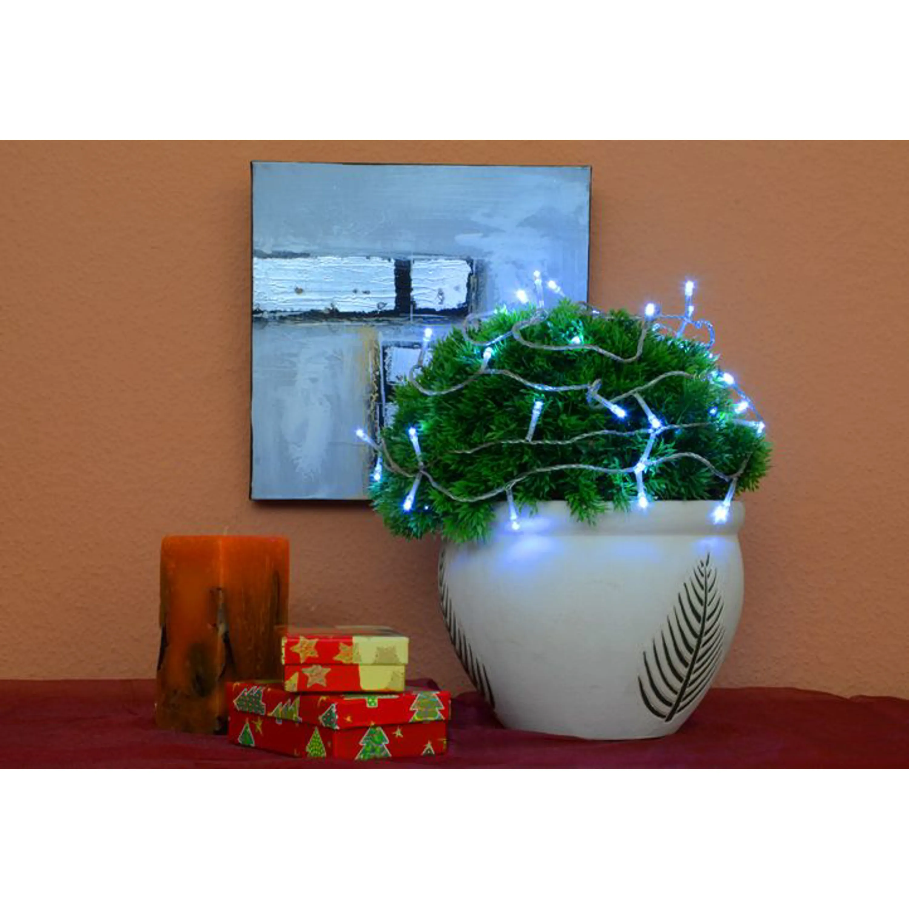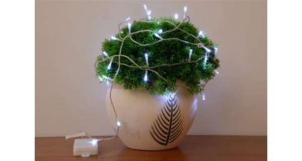 Svetelná reťaz so sto studeno bielymi diódami je určená pre vonkajšie, a tiež vnútorné použitie. A že túžite po rozžiarení tmavých kútov, ktoré ale nemajú zásuvku? Ani to nie je problém. Táto svetelná reťaz je napájaný prostredníctvom batérií.