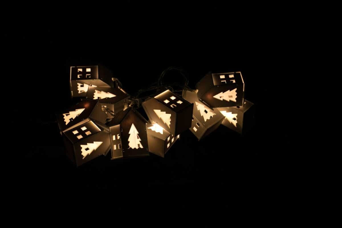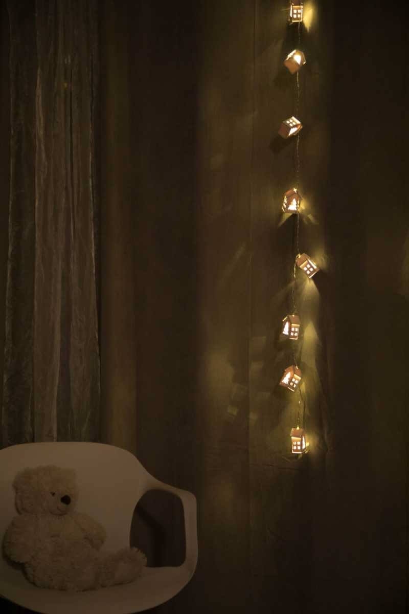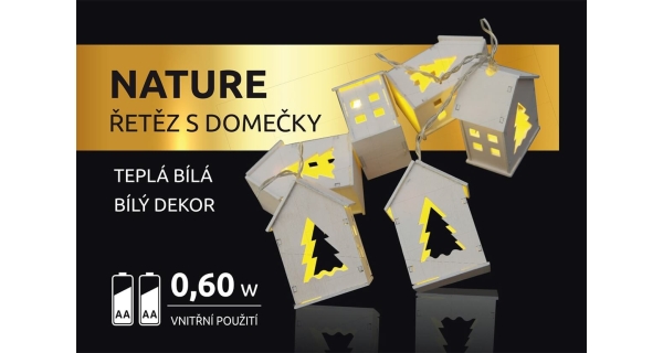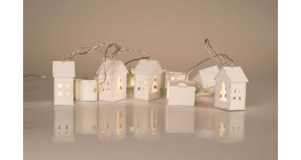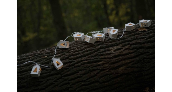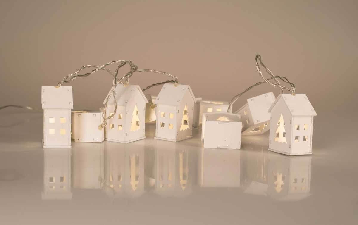 Drevená reťaz s domčekmi v bielom dizajne. Vďaka zabudovaným diódam priamo v domčekoch rozjasní táto krásna reťaz Vašu miestnosť. Reťaz má 10 domčekov, ktoré žiaria teplou bielou farbou.