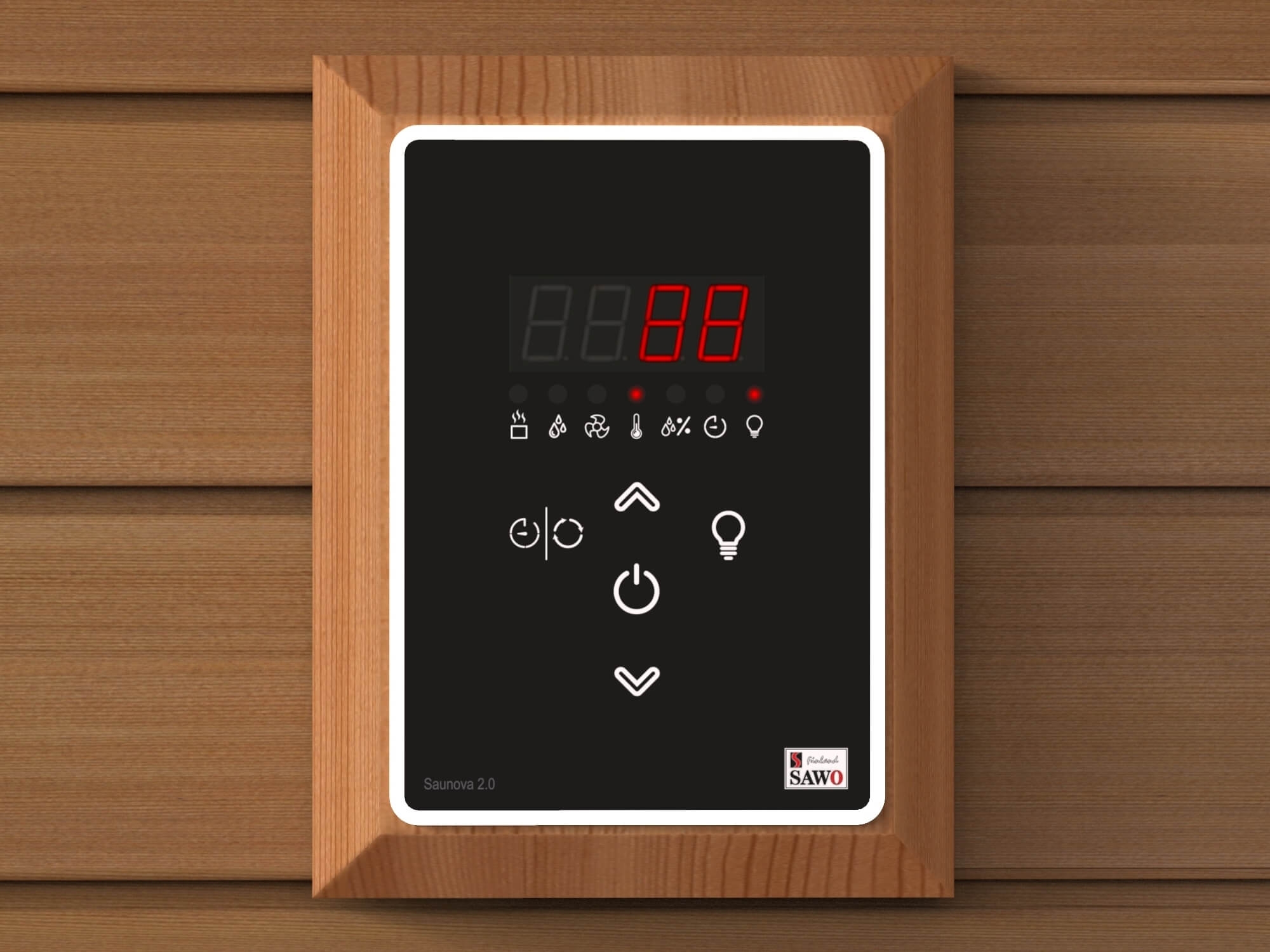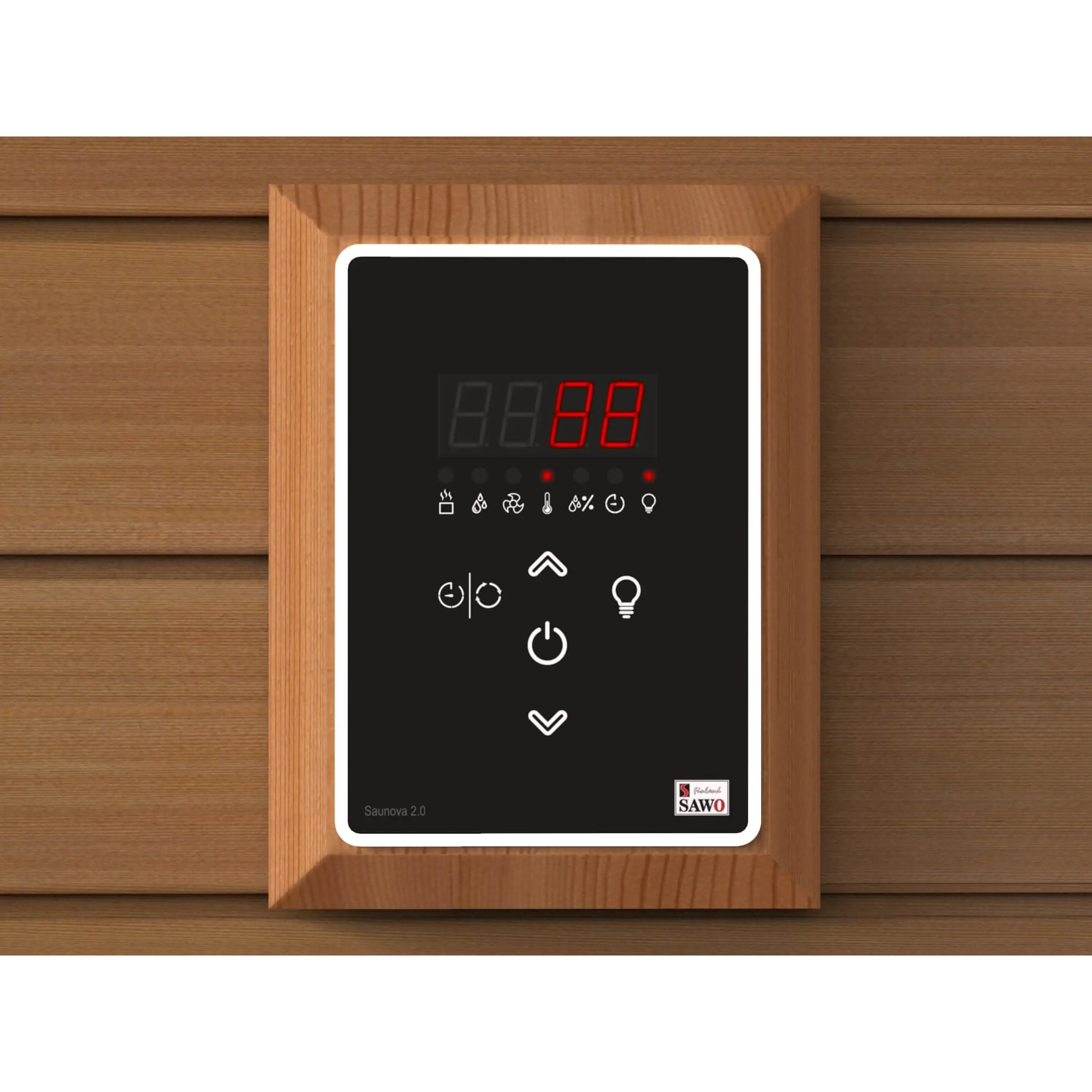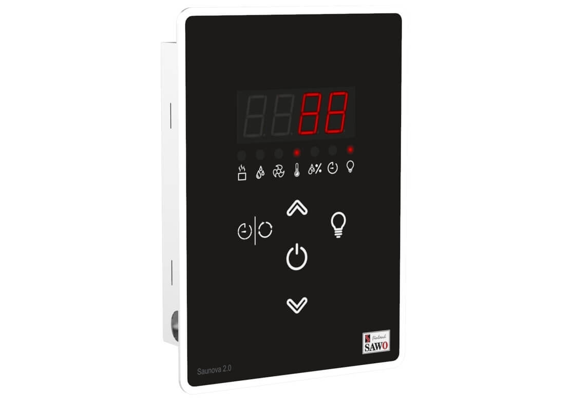 spríjemnila vaše saunovanie radom rôznych funkcií. Dokáže vo vašej saune nastaviť teplotu, vlhkosť, vetranie a osvetlenie. Používa sa v kombinácii s pecou Nordex Plus NS do výkonu 9,0kW. K výrobku je potrebné dokúpiť napájanie k riadiacej jednotke - Saunova 2.0 power control .