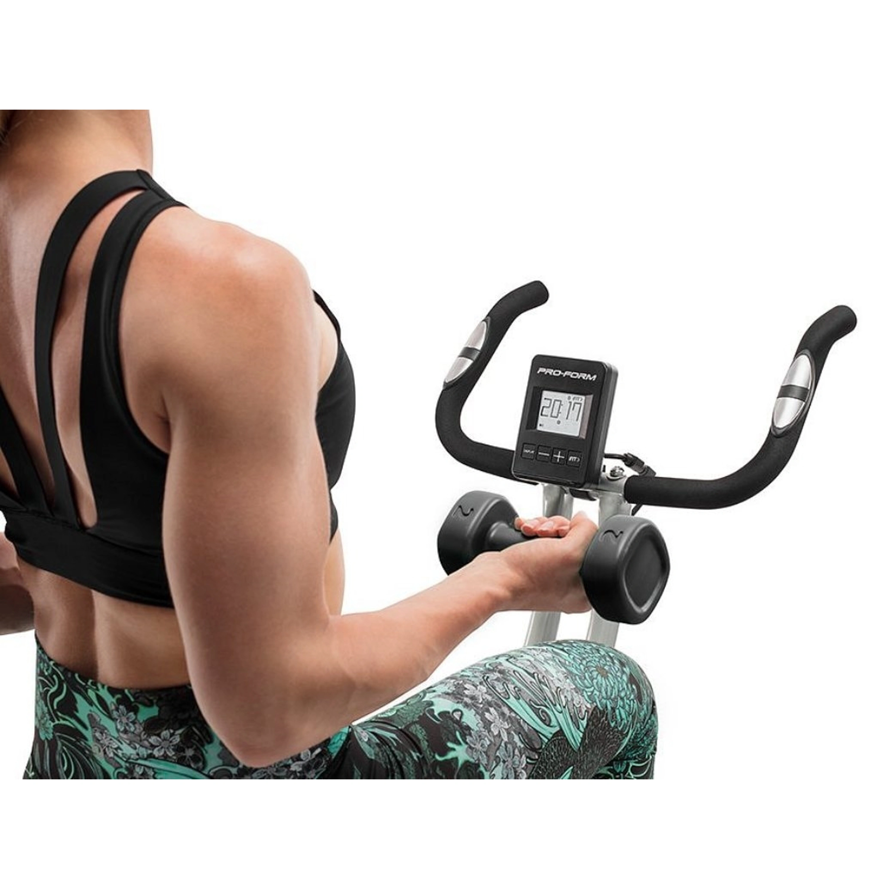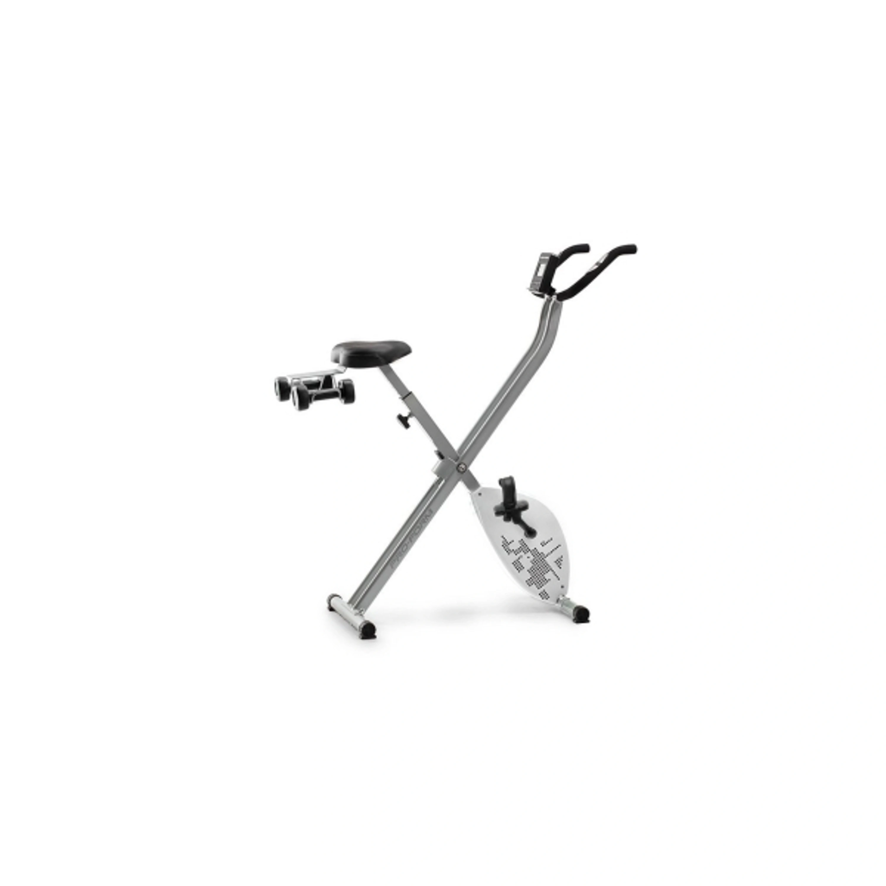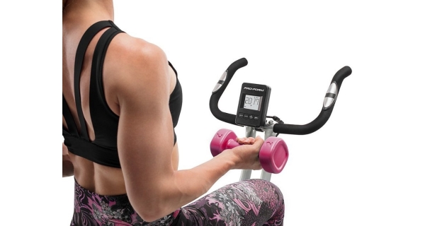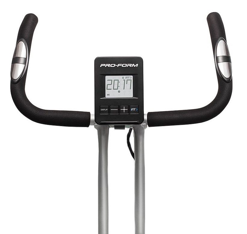 PRO-FORM PF X-Bike je vybavený podsvieteným 3“ LCD displejom, ktorý prezentuje všetky dôležité tréningové informácie ako je dĺžka cvičenia, rýchlosť, spálené kalórie, prejdená vzdialenosť, frekvencia otáčok a tepová frekvencia, ktorá je snímaná cez tzv. „hand pulzy“, alebo dlaňové senzory umiestnené na madlách. Na oživenie monotónnej jazdy je stroj vybavený aj párom kilogramových činiek, vďaka ktorým posilníte, pretiahnete alebo prípadne len podporíte správnu funkciu paží.