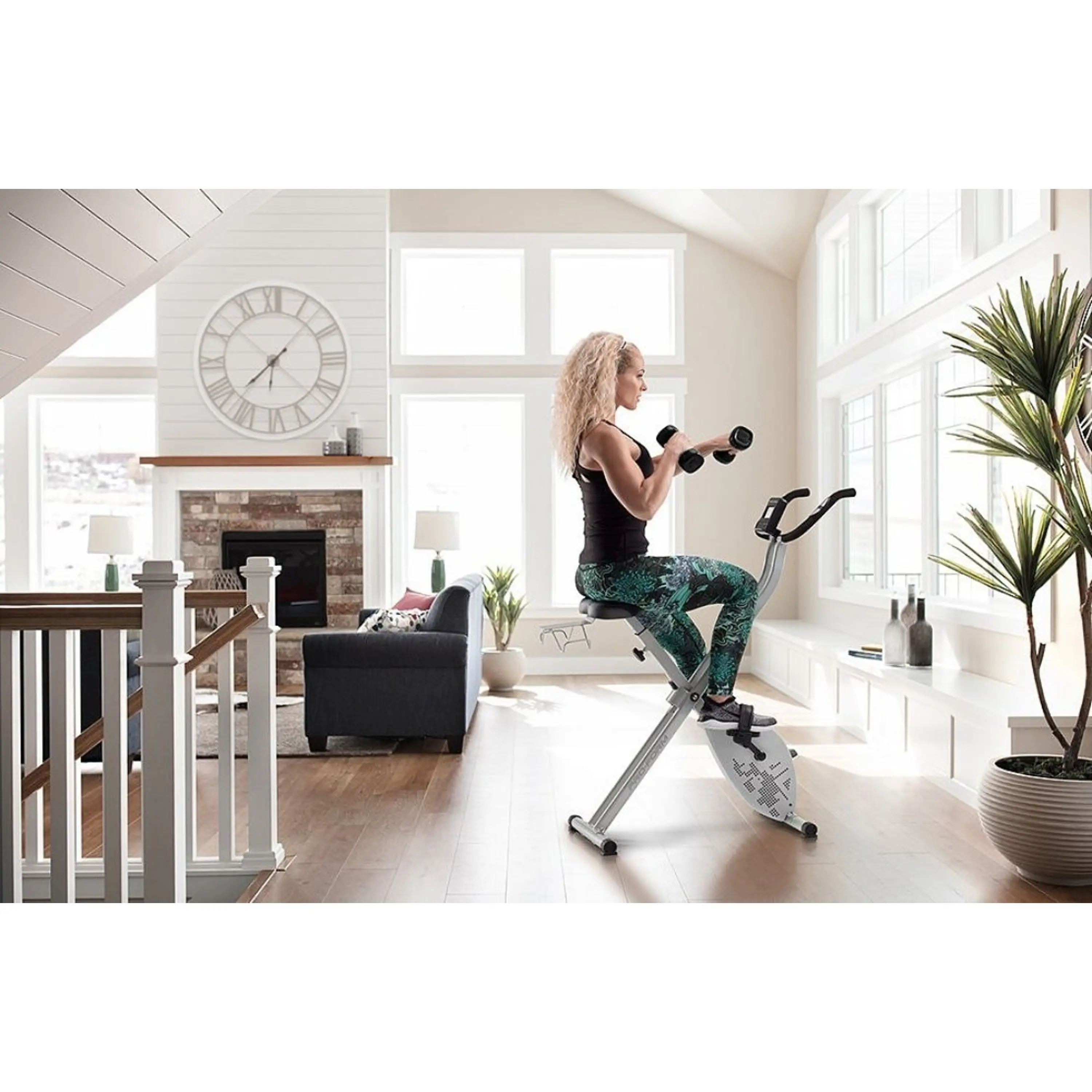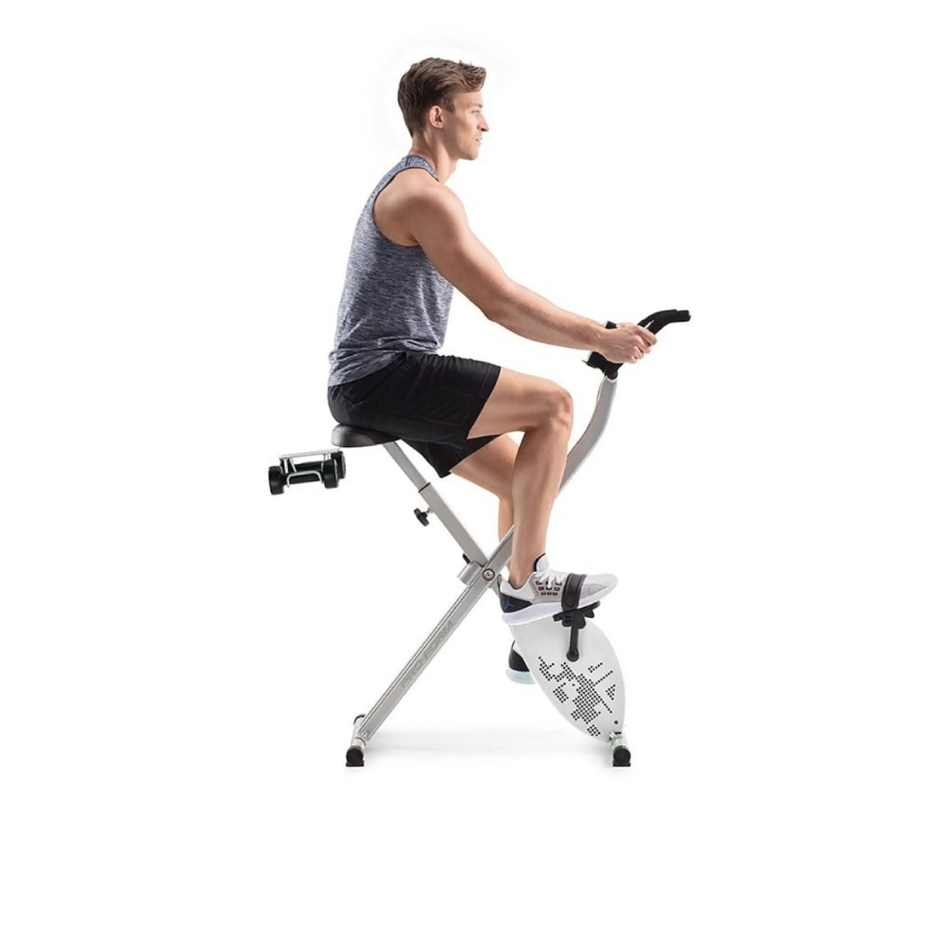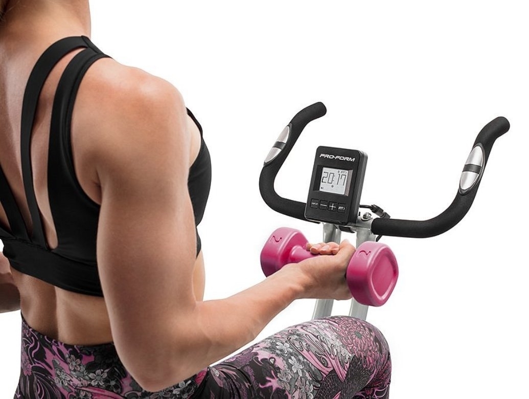 PRO-FORM PF X-Bike je vybavený podsvieteným 3“ LCD displejom, ktorý prezentuje všetky dôležité tréningové informácie ako je dĺžka cvičenia, rýchlosť, spálené kalórie, prejdená vzdialenosť, frekvencia otáčok a tepová frekvencia, ktorá je snímaná cez tzv. „hand pulzy“, alebo dlaňové senzory umiestnené na madlách. Na oživenie monotónnej jazdy je stroj vybavený aj párom kilogramových činiek, vďaka ktorým posilníte, pretiahnete alebo prípadne len podporíte správnu funkciu paží.