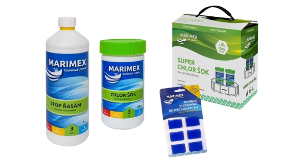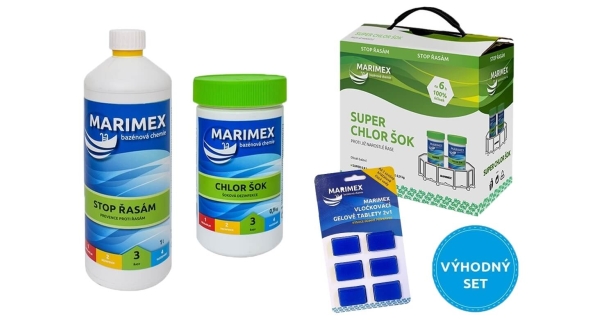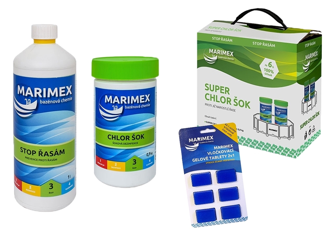 Bojujte proti riasam komplexne s našou sadou chémie a výhodne. Vďaka Super Shocku zlikvidujete rýchMarimexlo zelené riasy v bazéne, Algaestop pomôže v prevencii proti rastu rias a ak sa náhodou premnožia, potom nastúpi Chlor Shock a následne vločkovacia tableta.