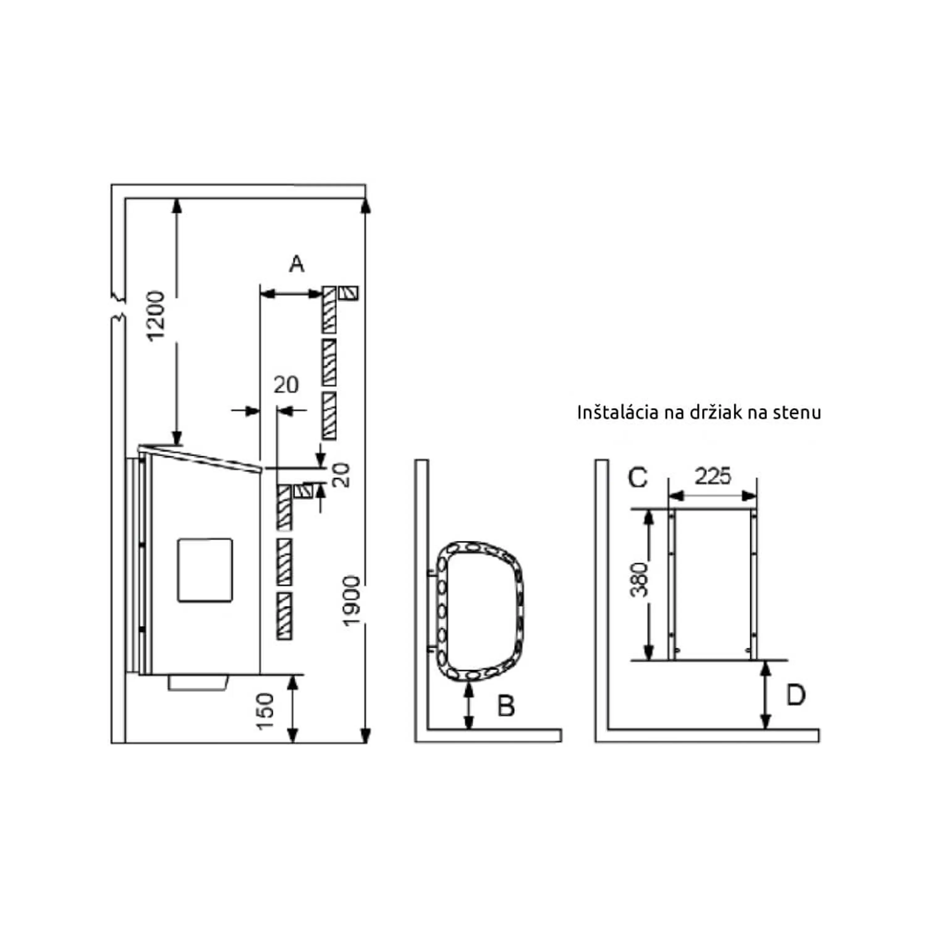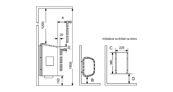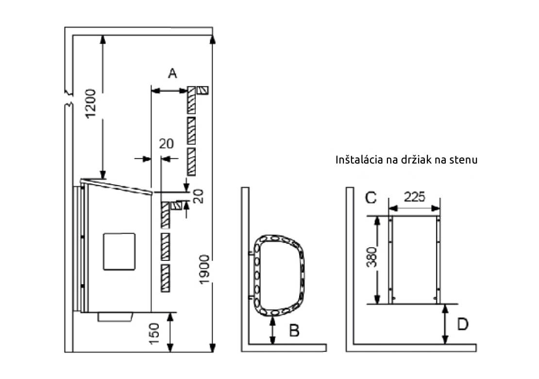 - Bezpečnostná vzdialenosť B od steny: 100 mm