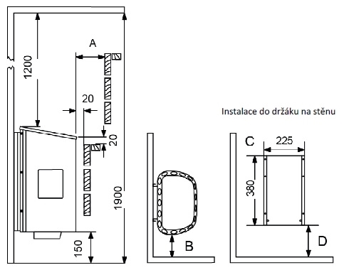 - Bezpečnostná vzdialenosť B k stene: 100 mm