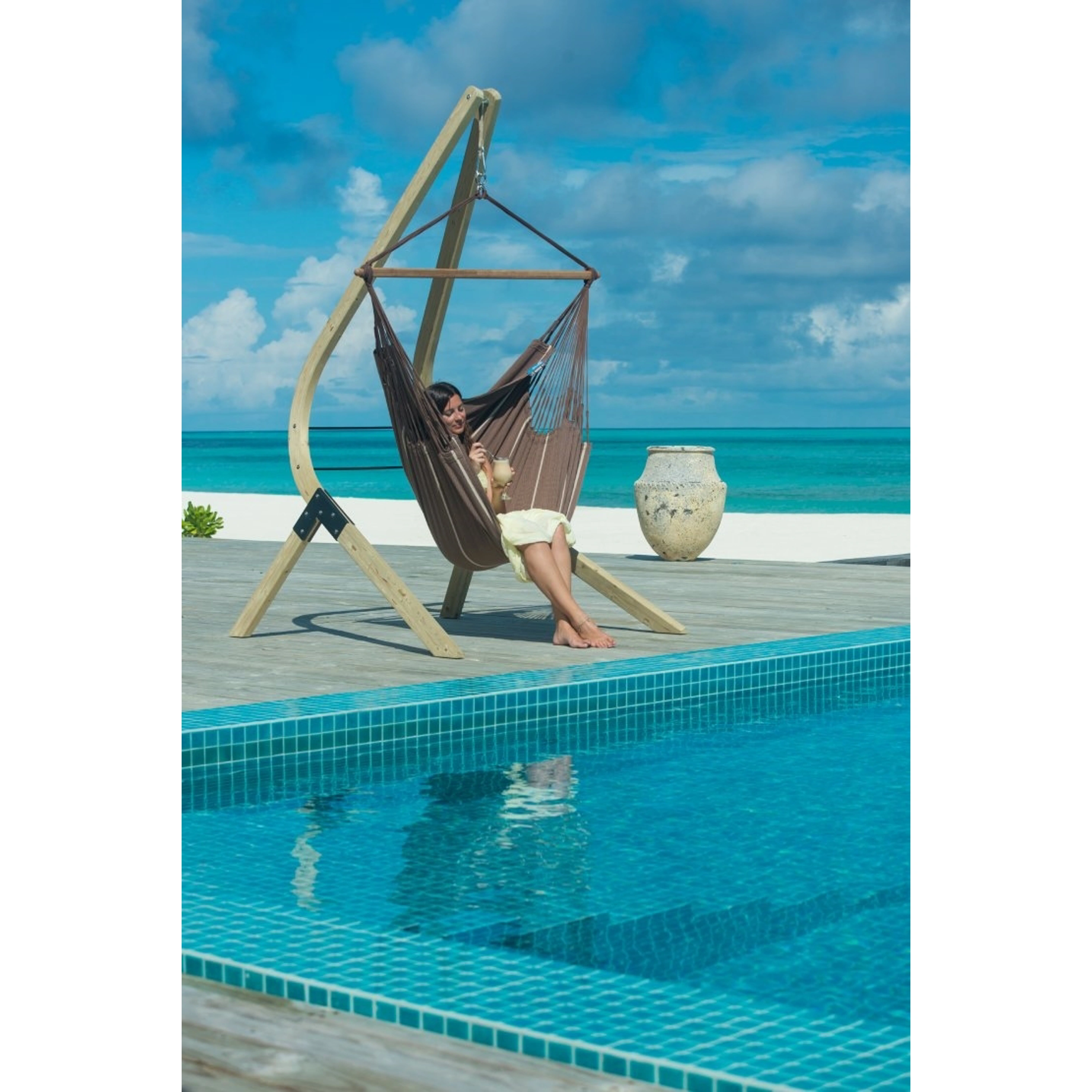Jej veľkorysé rozmery, 210 cm na dĺžku, pozývajú k odpočinku v sede aj v ľahu a svojim pohodlím sa vyrovná hojdacím sieťam. Kvalitná látka je vďaka dlhým vláknam mimoriadne hebká a výnimočne trvanlivá. Zdvojené útky na jej okrajoch zabraňujú roztrhnutiu. Certifikácia GOTS zase zaručuje, že aj farbivá spĺňajú najprísnejšie environmentálne kritériá. Tiež rozperná tyč je vyrobená z kvalitného bambusového dreva pochádzajúceho z udržateľného lesného hospodárstva. Vďaka špeciálnej technológii spracovania má príjemne hladký povrch a taktiež jej odolnosť proti poveternostným vplyvom je mimoriadna.