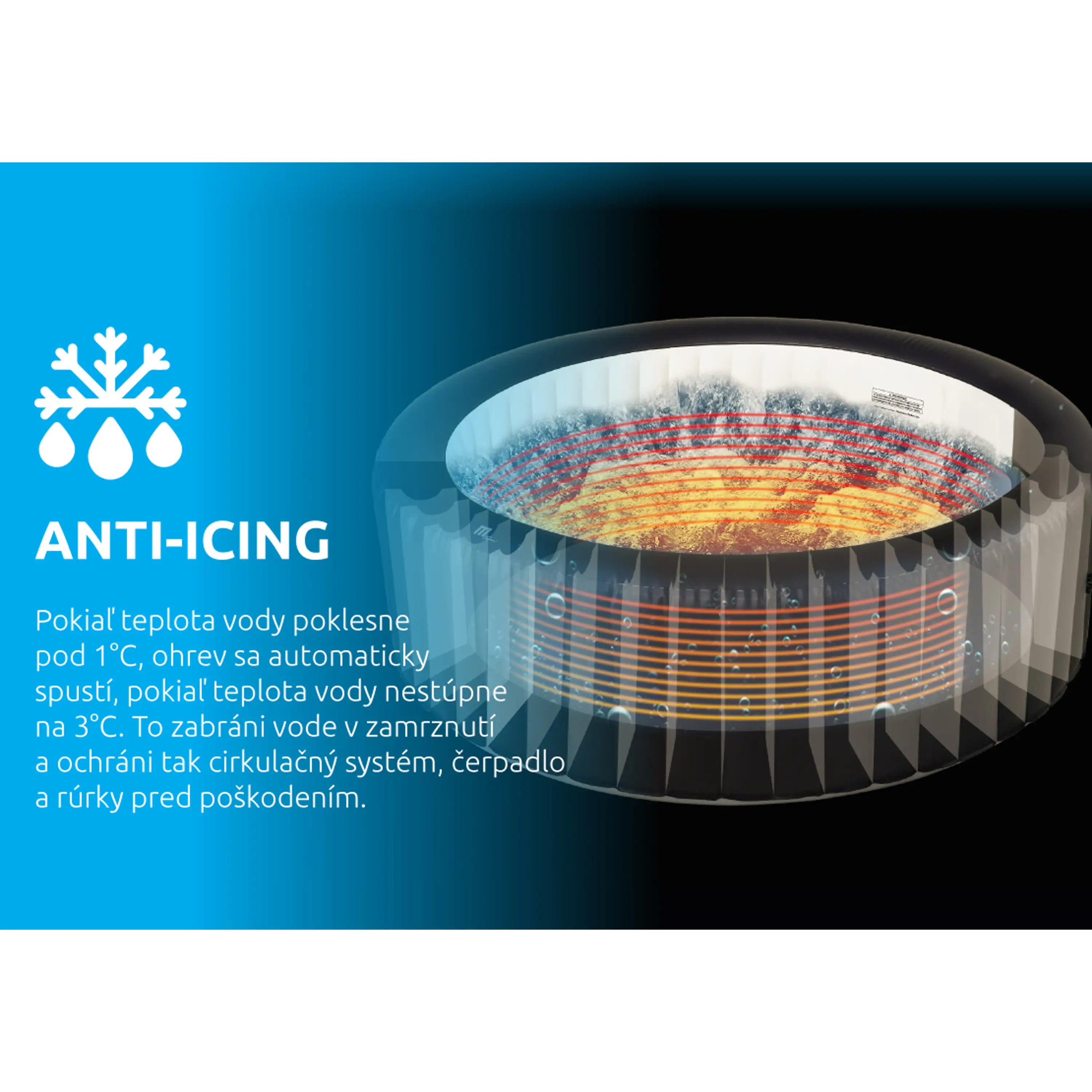 Systém ANTI-ICING bude neustále dohliadať na vašu vírivú vaňu a strážiť bezpečnú úroveň teploty. Pokiaľ teplota vody poklesne pod 1°C, ohrev sa automaticky spustí, pokiaľ teplota vody nestúpne na 3°C. Toto zabráni vode v zamrznutí a ochráni tak cirkulačný systém, čerpadlo a rúrky pred poškodením.