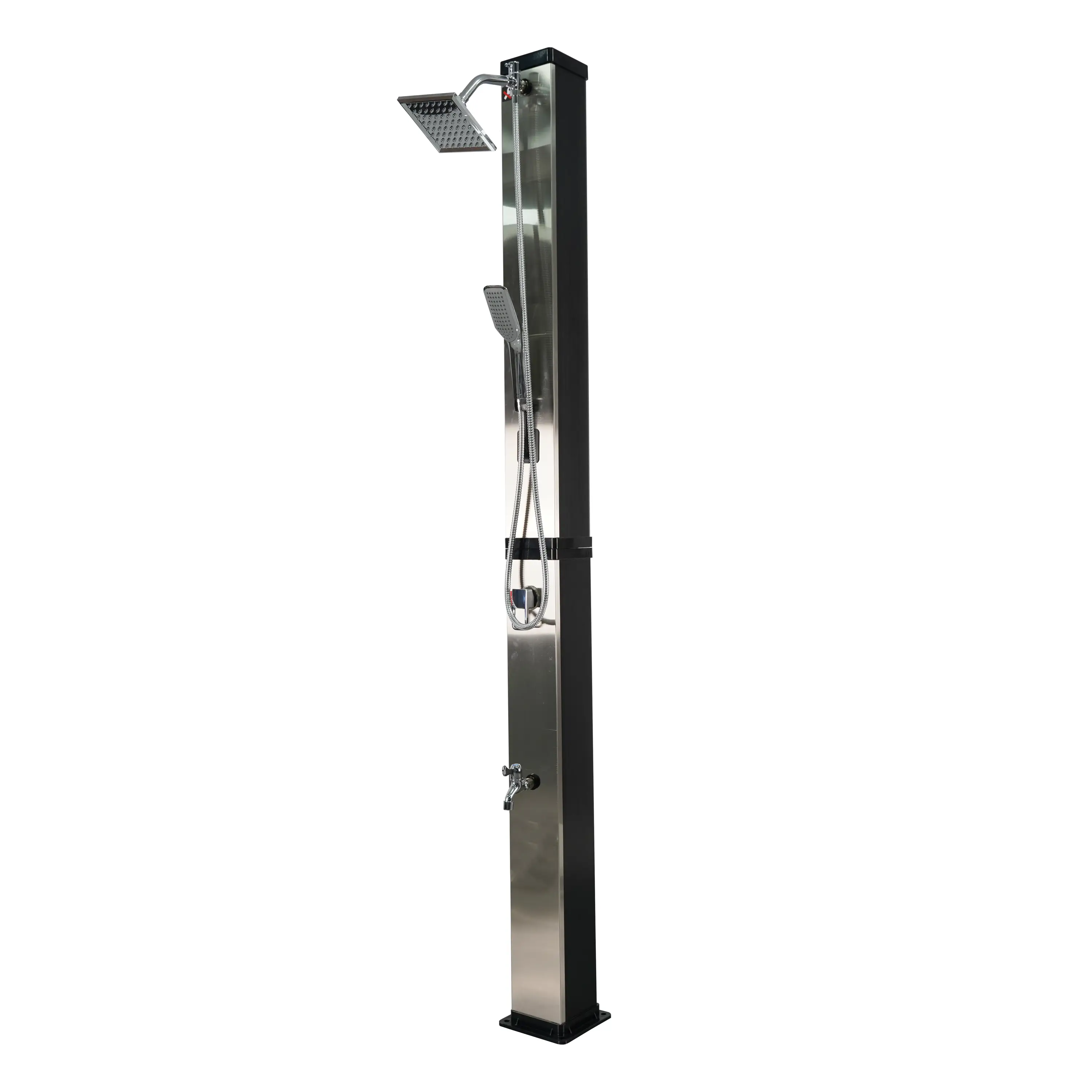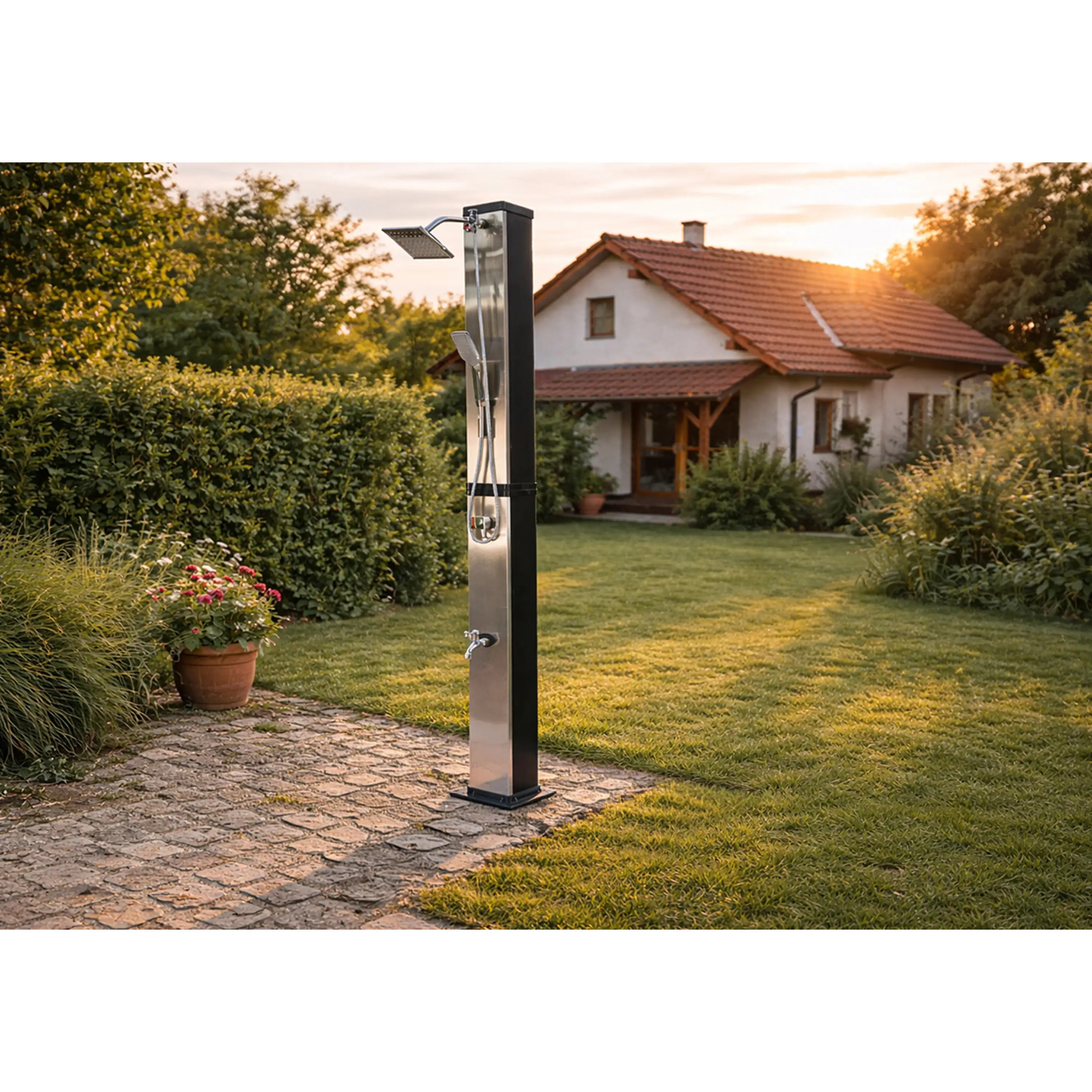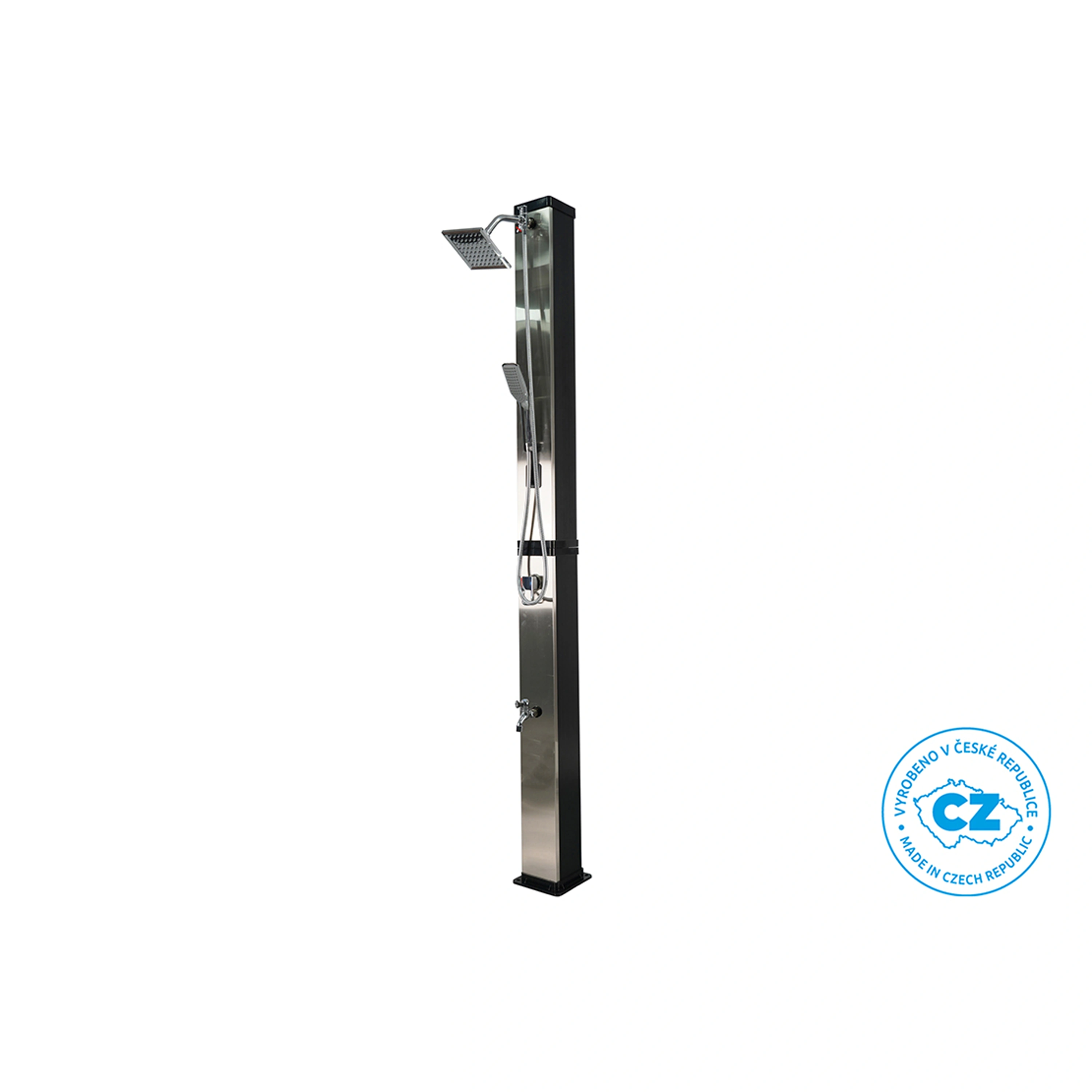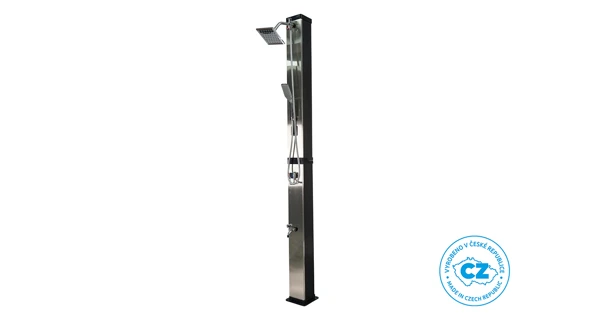 Záhradná dvojdielna a skladná sprcha DUO s objemom 40 l pre vonkajšie použitie zaistí ohrev vody privádzanej zo záhradnej hadice a tým perfektný pocit pohodlia pri sprchovaní teplou alebo vlažnou vodou. Sprcha má pákovú batériu, ručnú sprchu aj kohútik na oplach nôh. Ohrev vody zaisťuje slnečné žiarenie a telo sprchy, ktoré funguje ako solárny kolektor. Na sprchovanie musí byť záhradná sprcha stále napojená na vodovodný rad. Ak nie je napojená, nie je možné sa sprchovať. Sprcha sa kotví pomocou 4 skrutiek (nie sú súčasťou balenia) pevne k zemi, čím je zaistená jej perfektná stabilita.