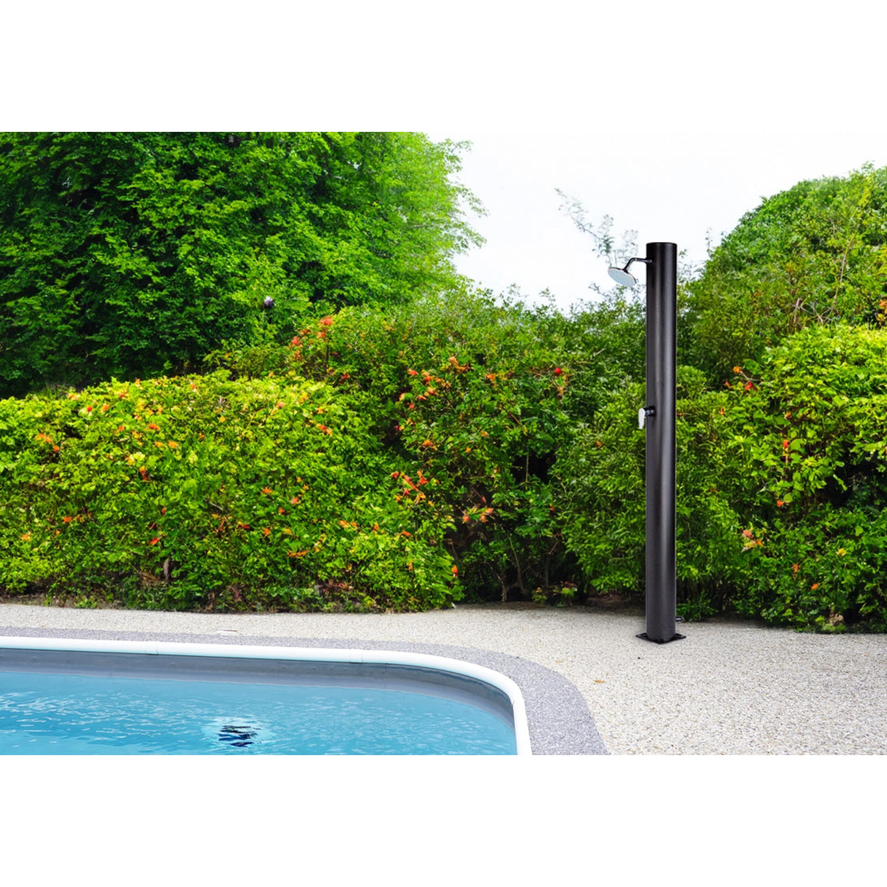 Doplnok bazénaSolárne sprchy sa dajú využívať samostatne, ale môžu tvoriť aj doplnok k bazénom. Pomáhajú tak pred zbytočným znečistením bazénovej vody napríklad od trávy či hliny. |