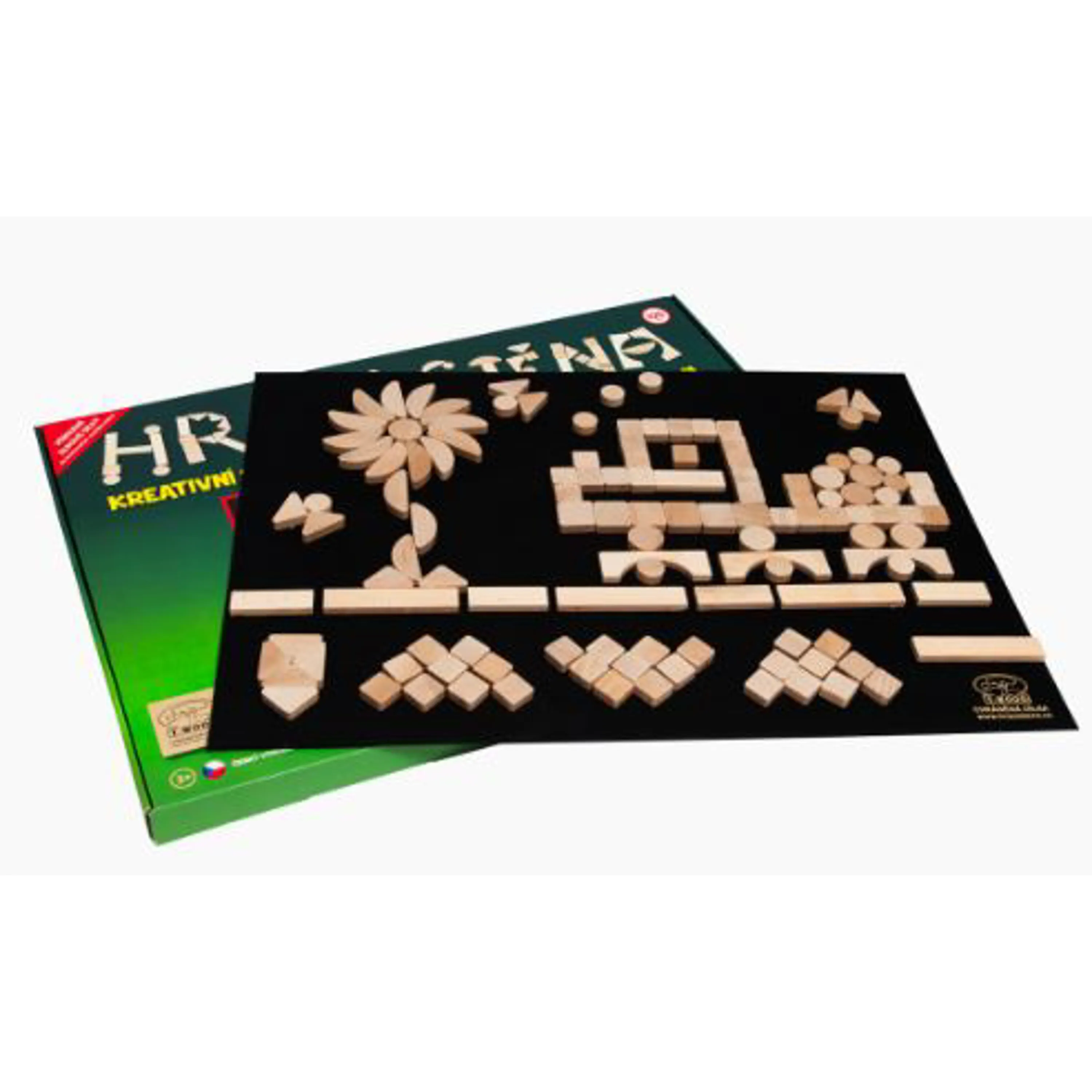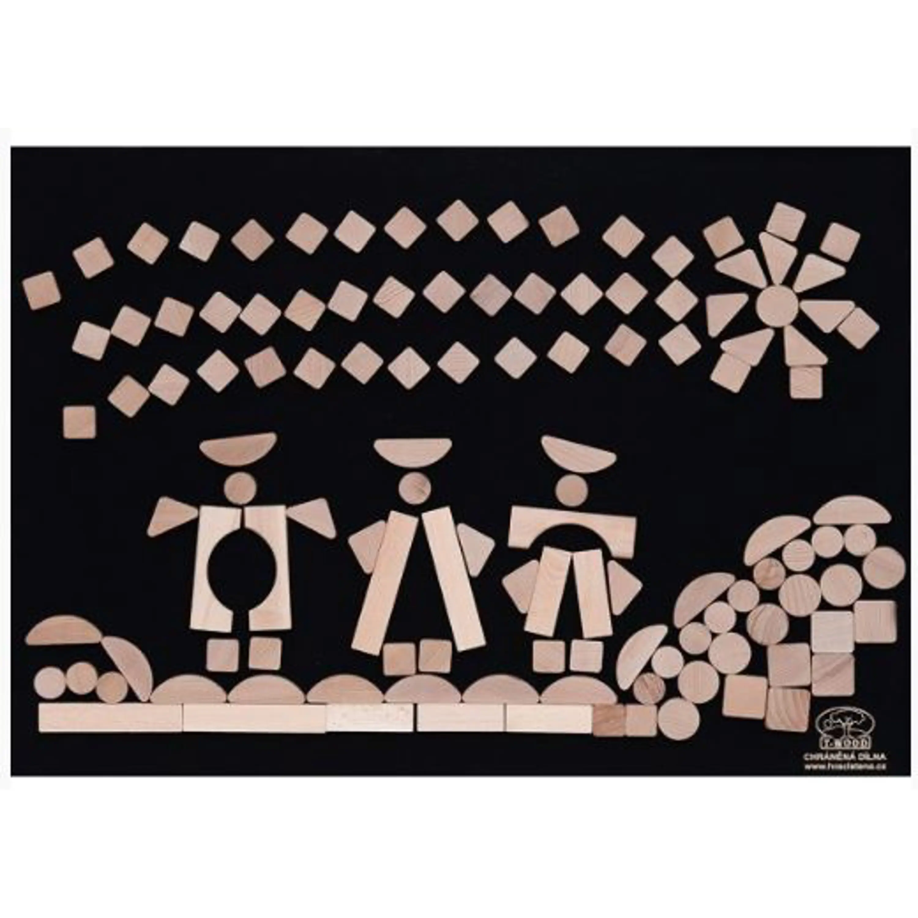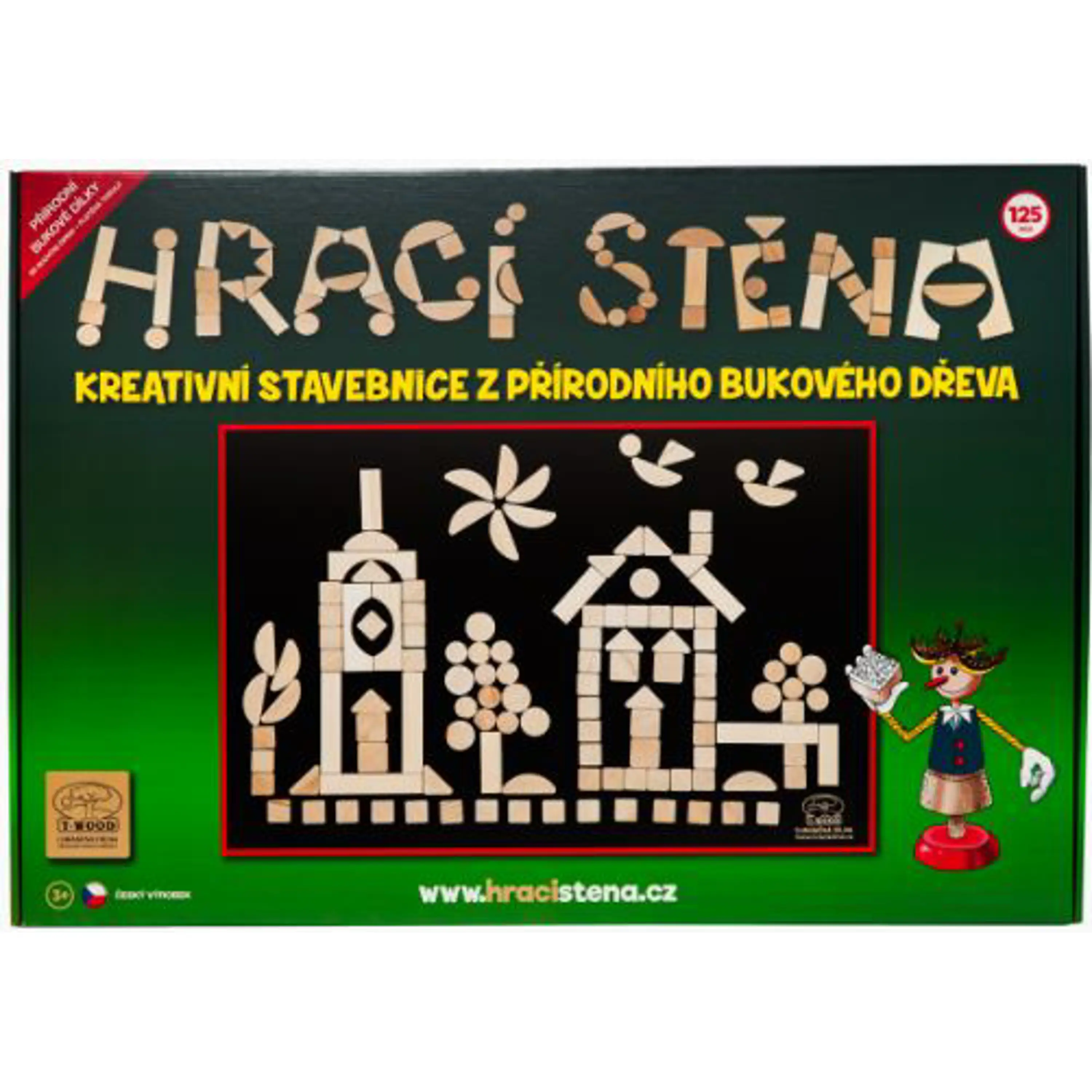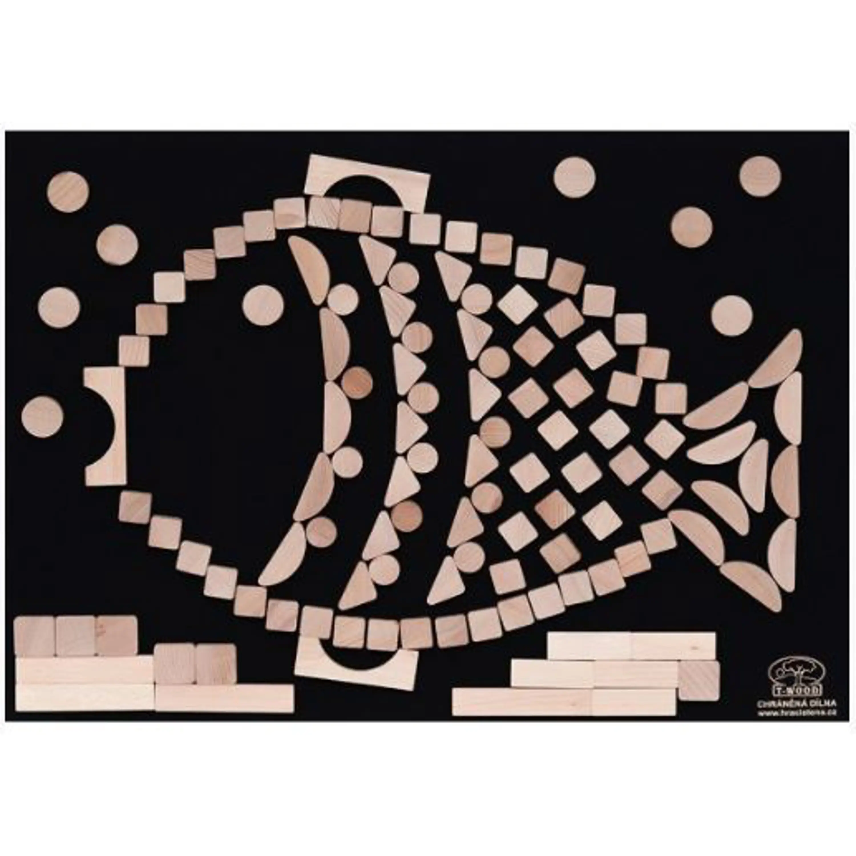 • Hracia stena sa skladá z plstenej tabule s rozmermi 70 x 50 centimetrov a 125 skladacích dielikov rôznych tvarov z kvalitného bukového dreva.