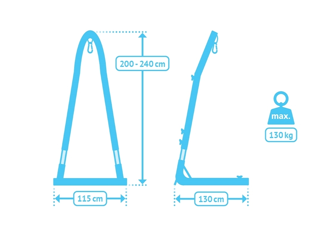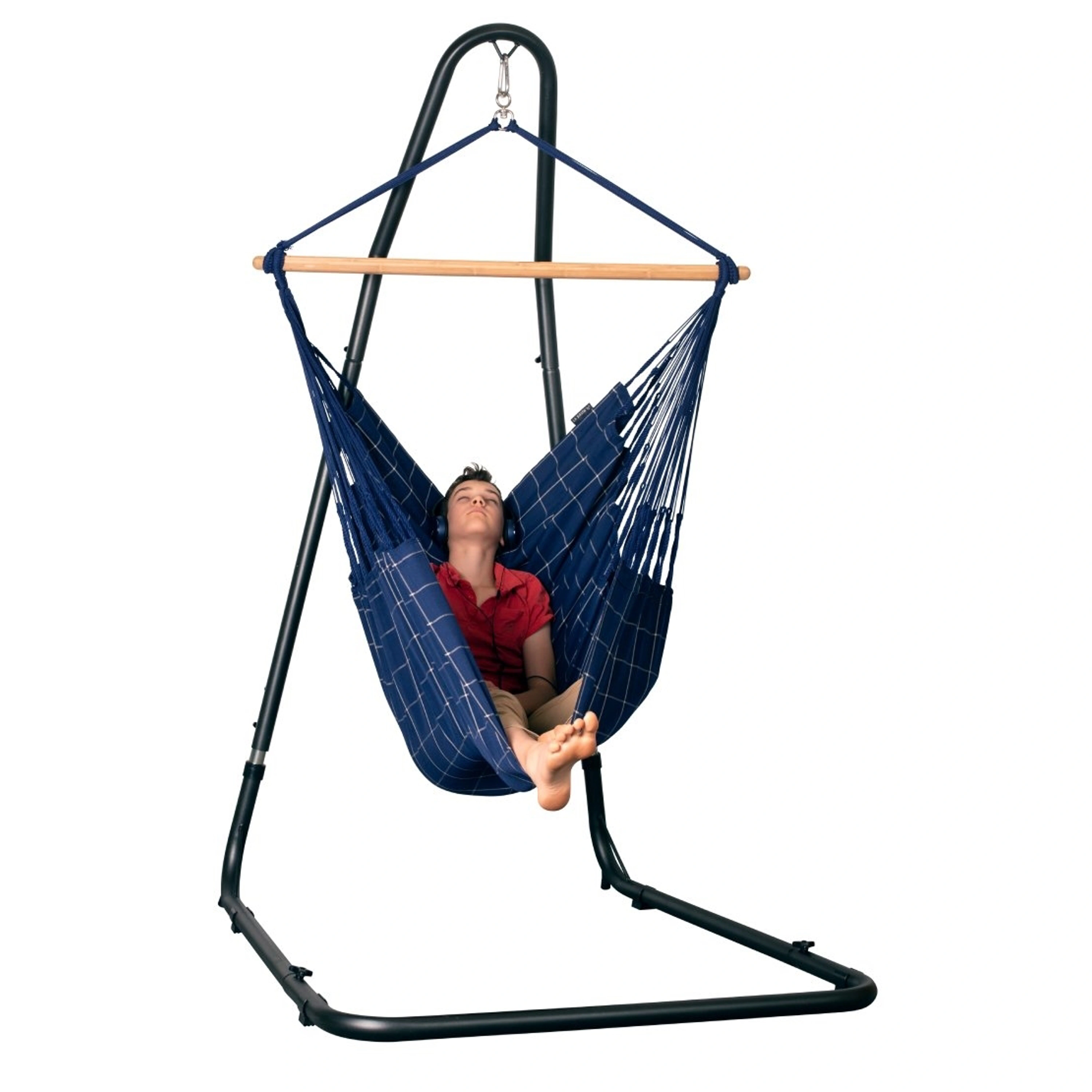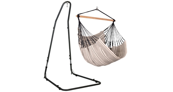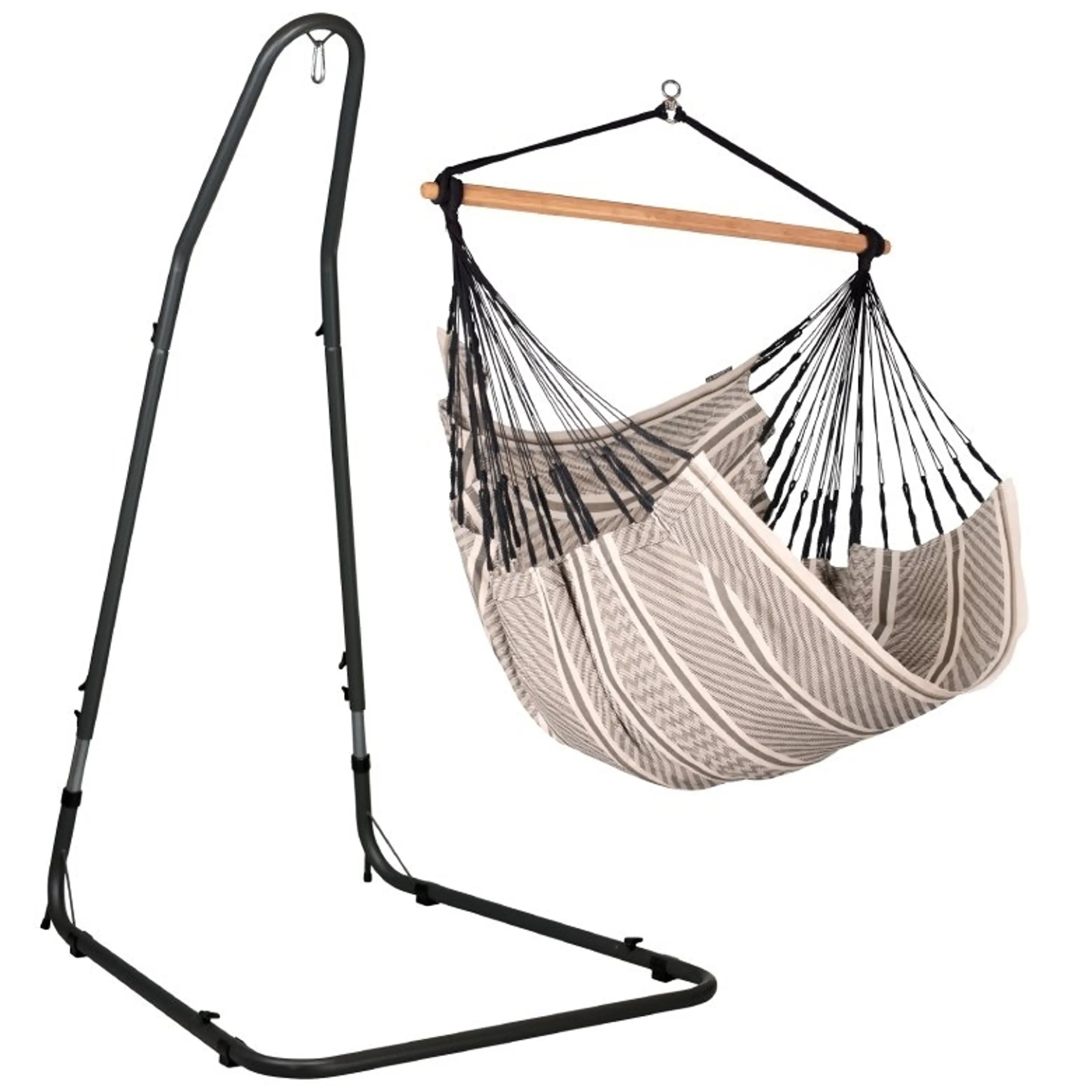 Priestorovo úsporný a výškovo nastaviteľný stojan La Siesta Mediterráneo z lakovanej ocele pre hojdacie sedačky Basic a Comfort.