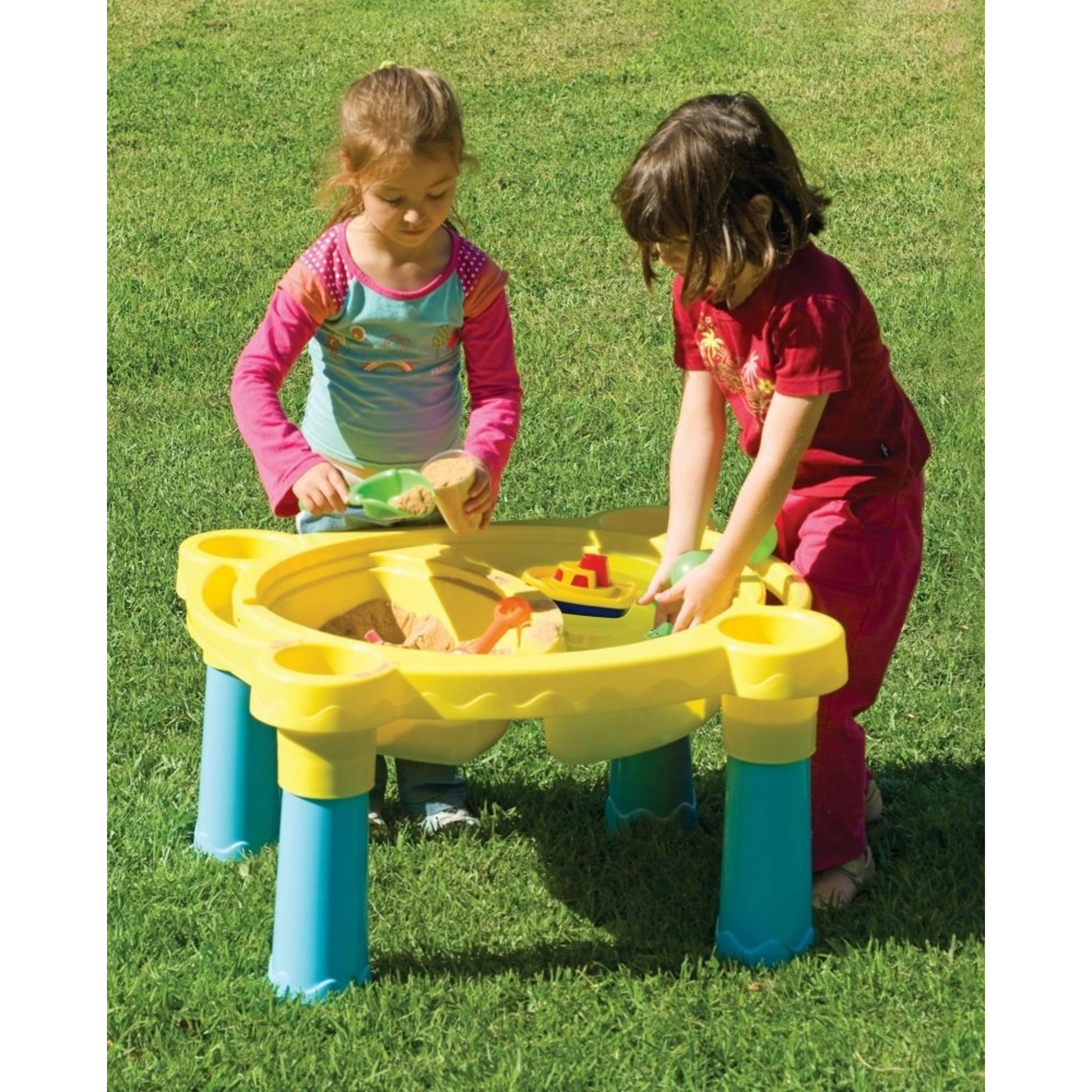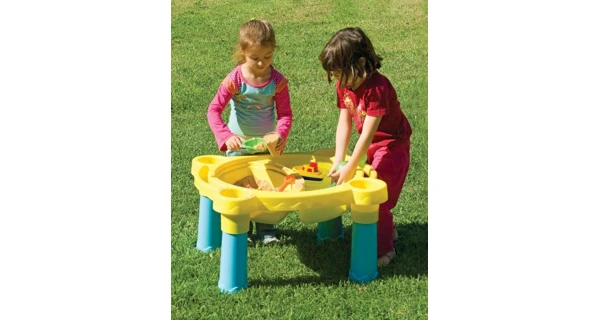 Plastový stolček na záhradu s krytom. Po odkrytí sa stolček premení v pieskovisko. Rodičia môžu deťom stolček premiestniť a oni tak môžu mať pieskovisko vždy na inom mieste. Kryt chráni pieskovisko pred nepriaznivým počasím.