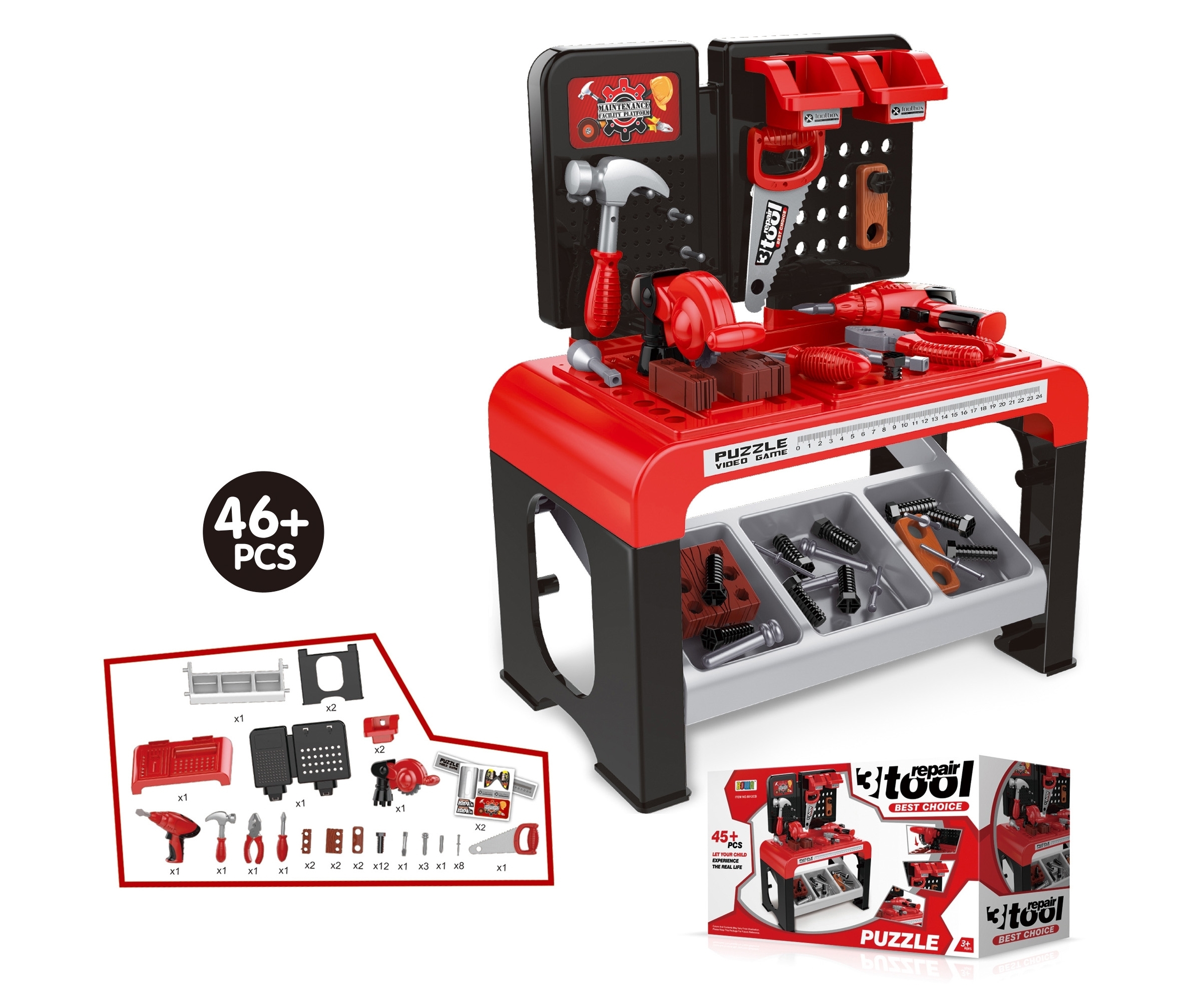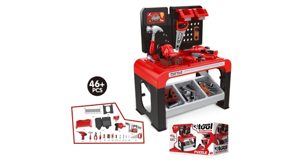 Stolík s náradím. Rozmery 47x28x57,5 cm. 46 ks náradia - skrutky, klince, kladivo, skrutkovač, kliešte, ručná píla, okružná píla. Vrátane vešiakov a priehradiek na náradie.