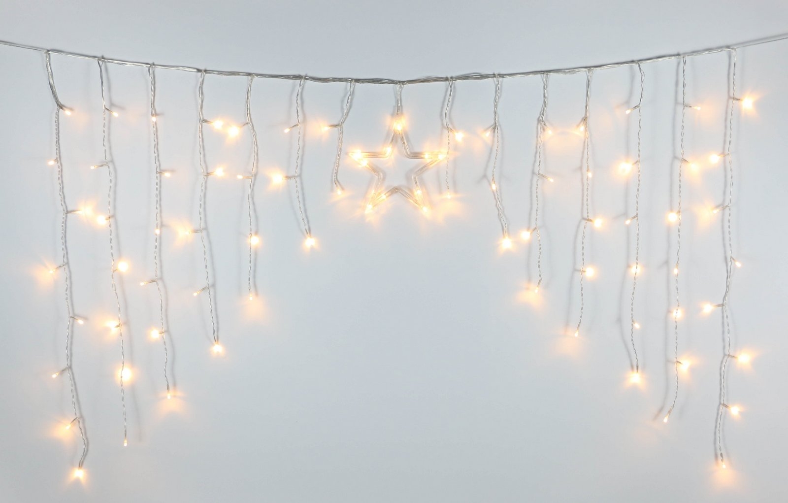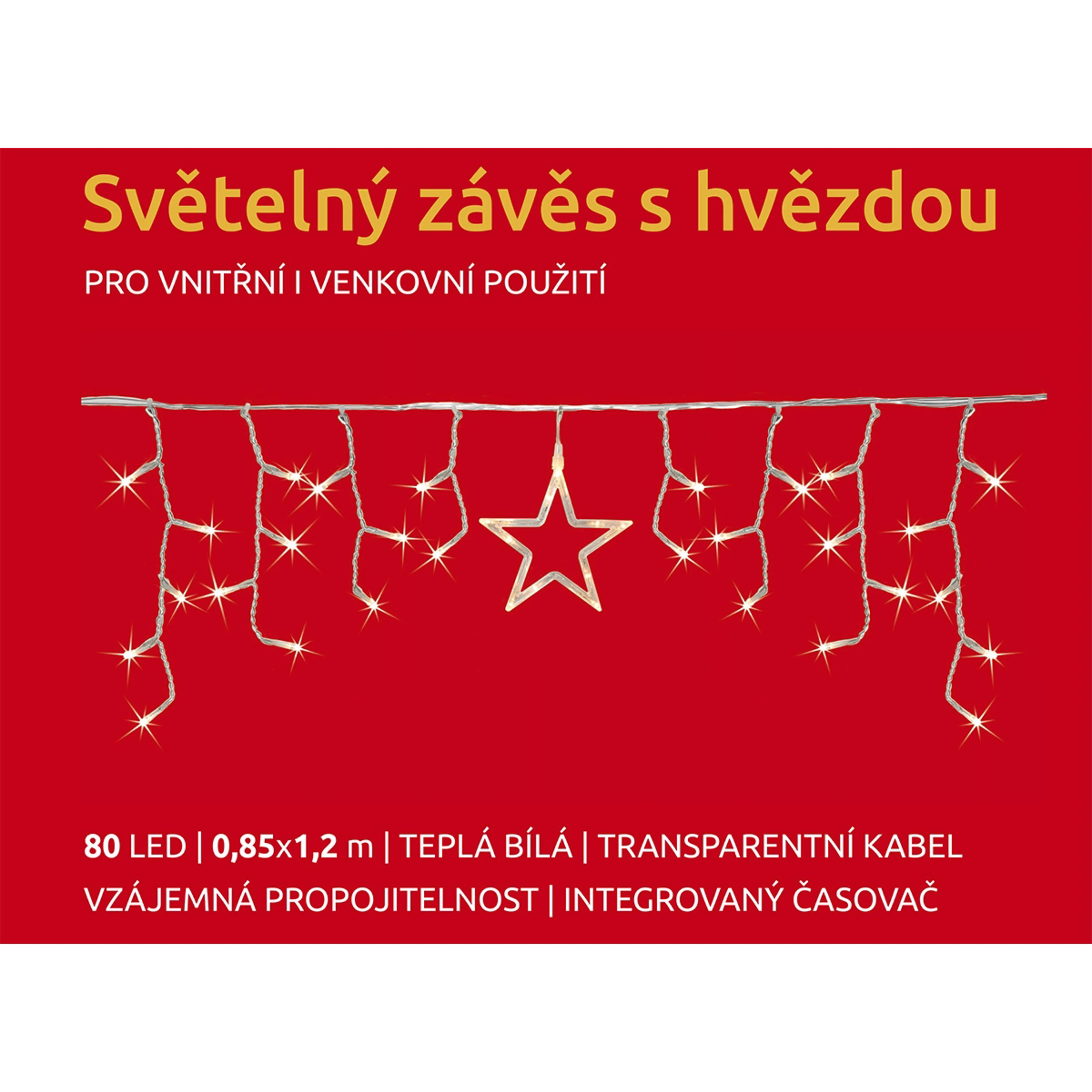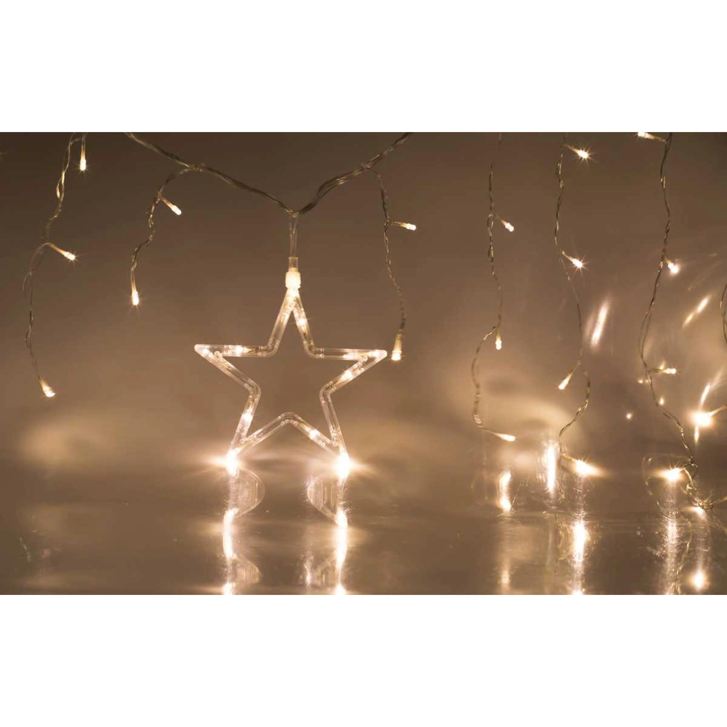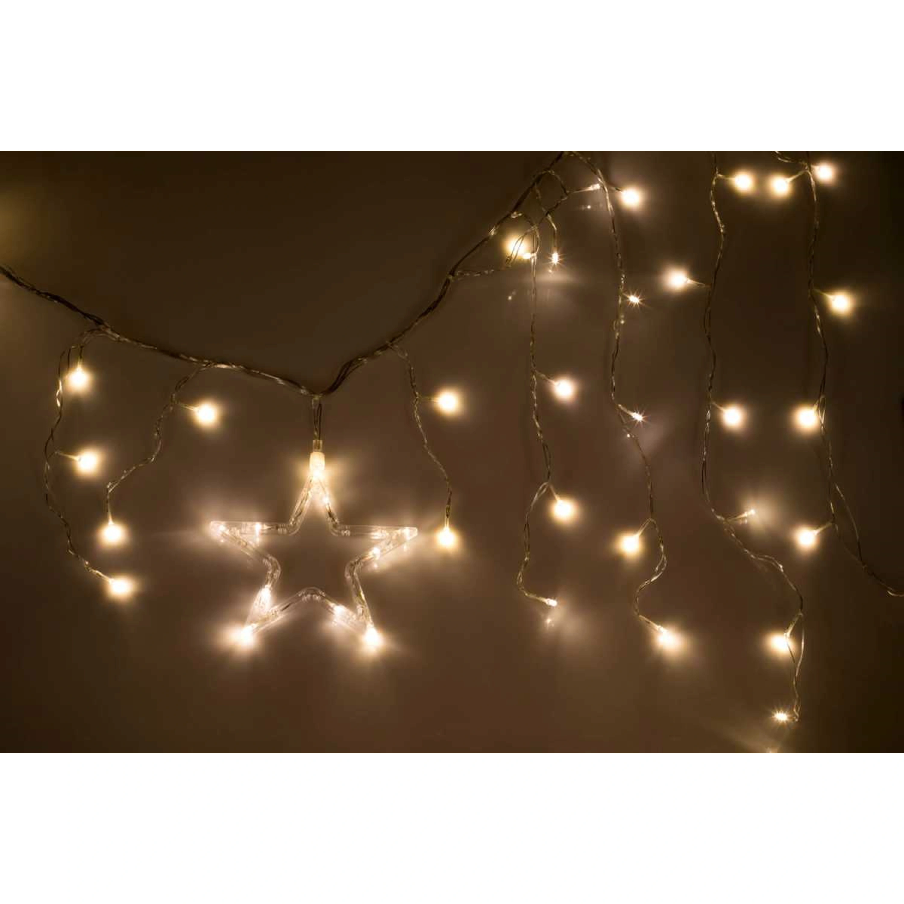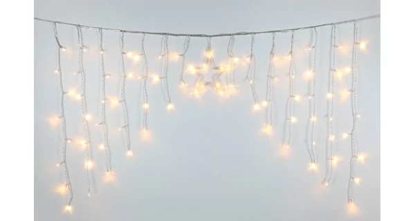 Svetelný záves s dekoračnou hviezdou je vhodný na zavesenie do okna alebo na stenu domu. Dekorácia je vybavená 80 LED, ktoré žiaria teplou bielou farbou.