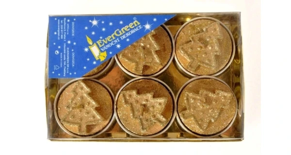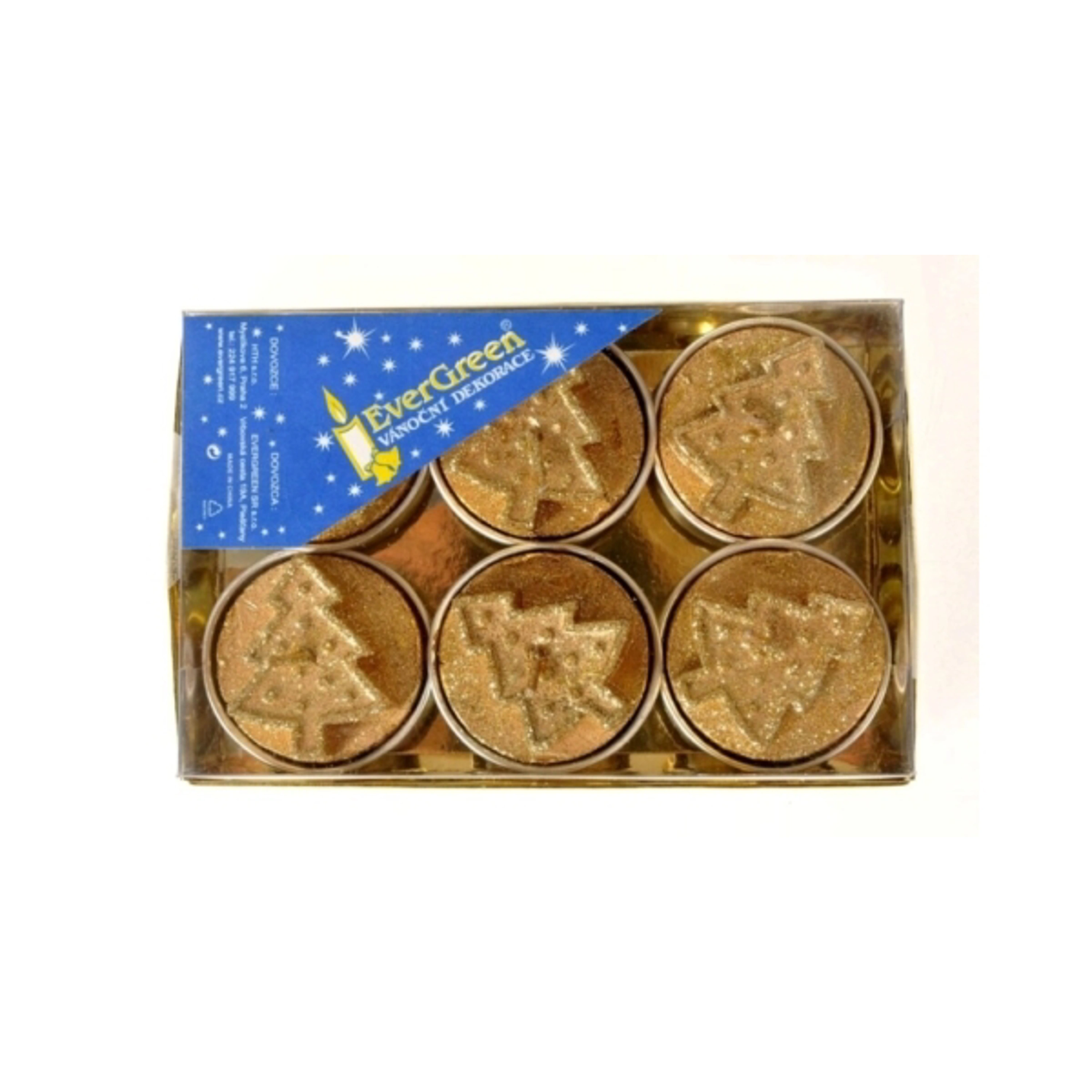 Sviečka čajová so stromčekom gl. x 6, Lux D. Box pr. 4 cm, zlatá