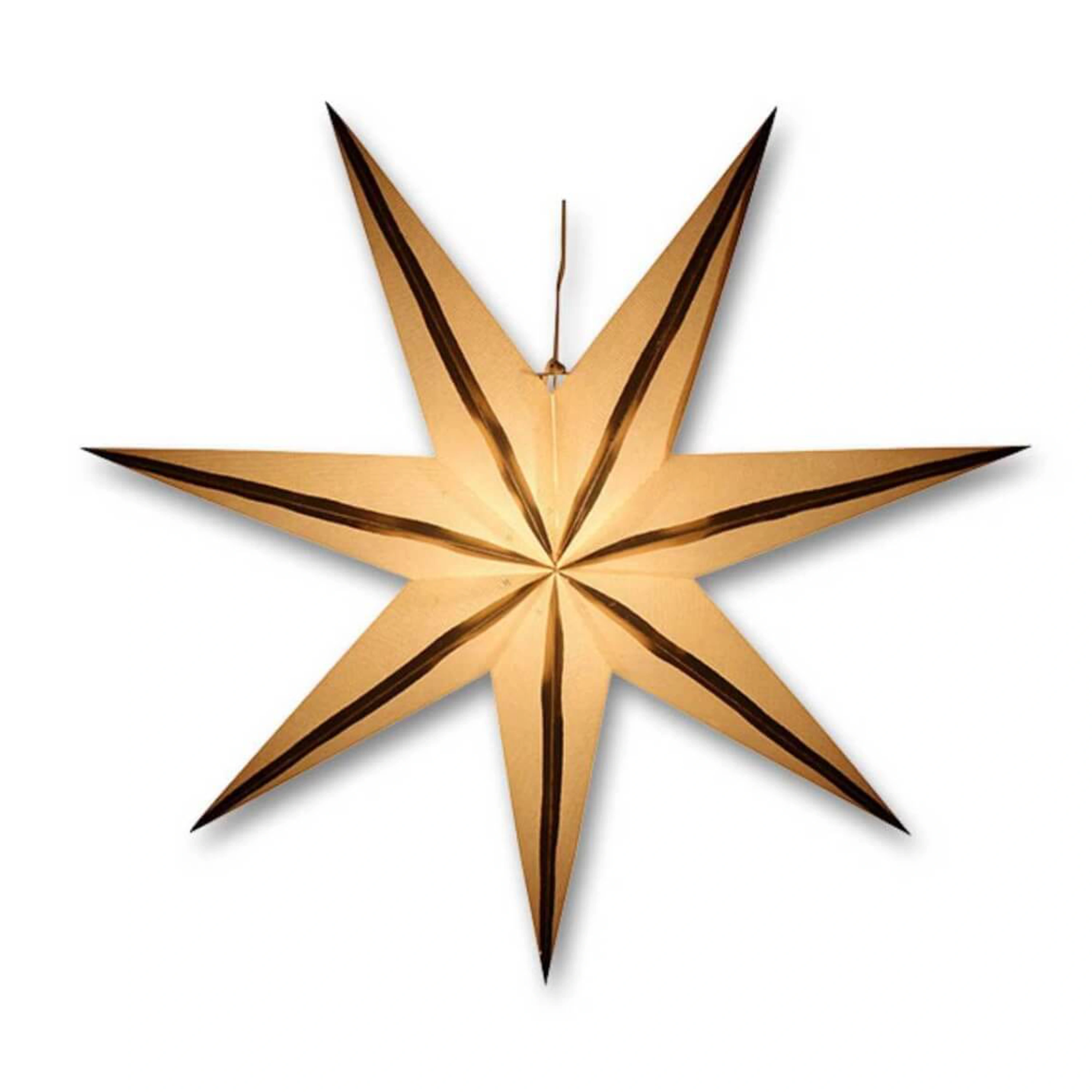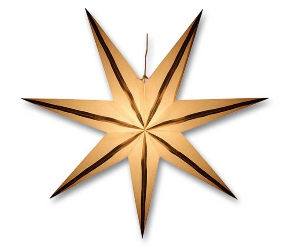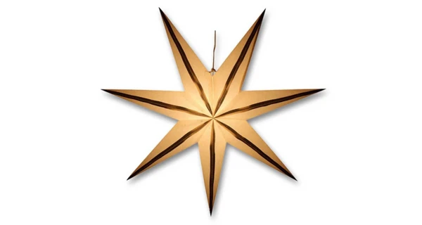 Originálna vianočná dekorácia v podobe papierovej hviezdy so zlatými prúžkami so zabudovanou svetelnou inštaláciou.