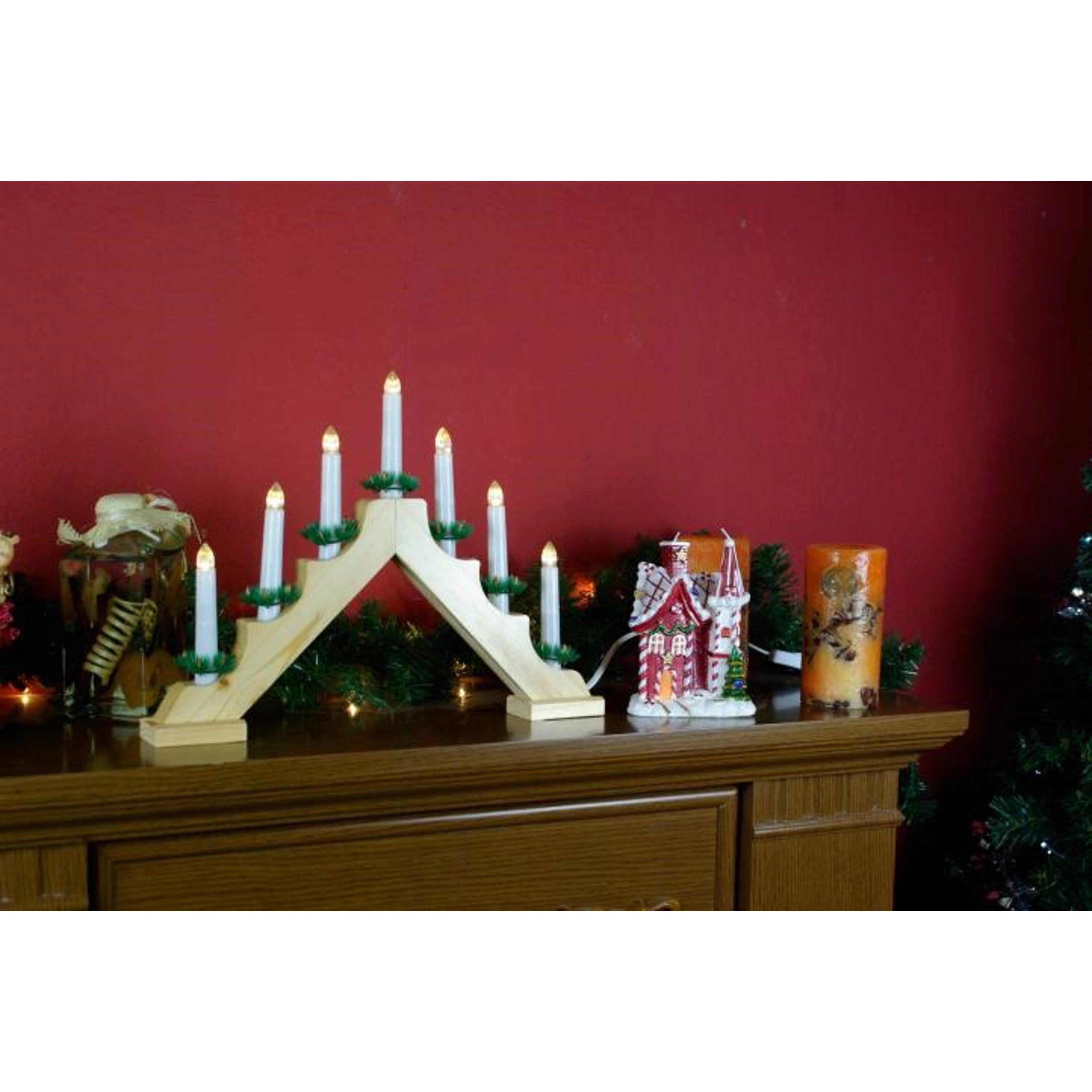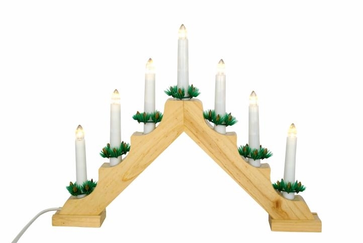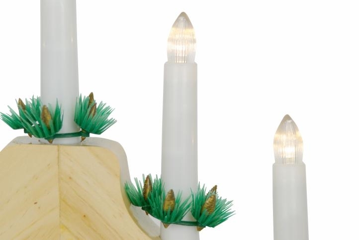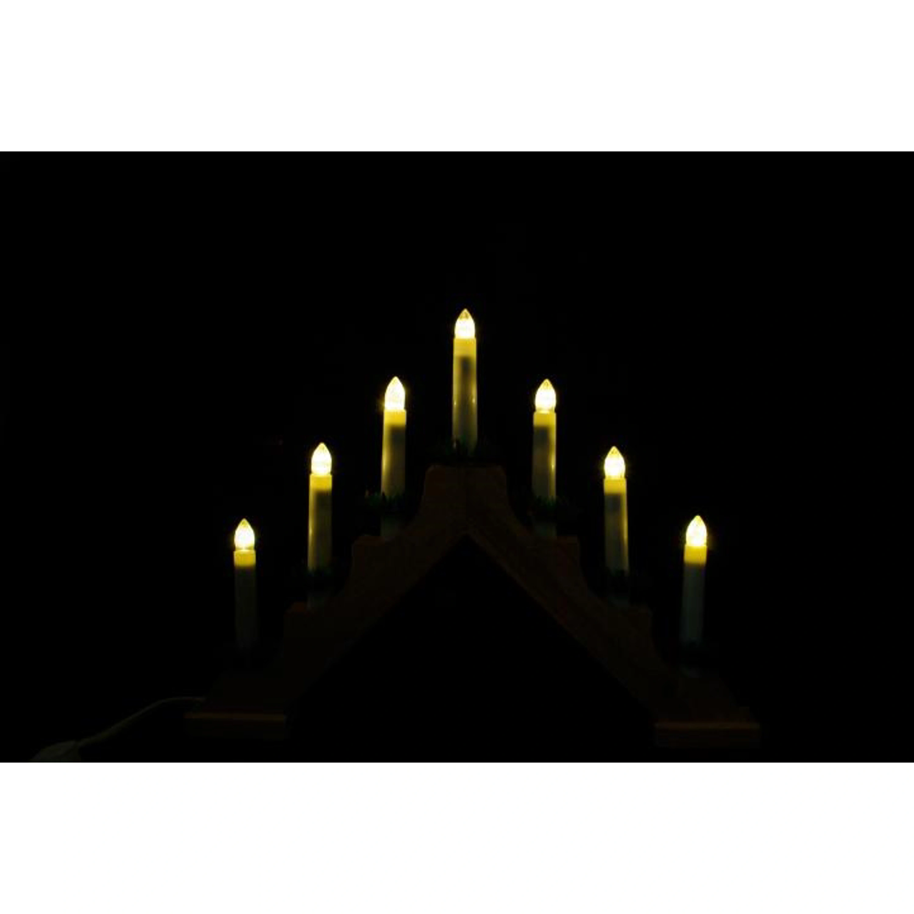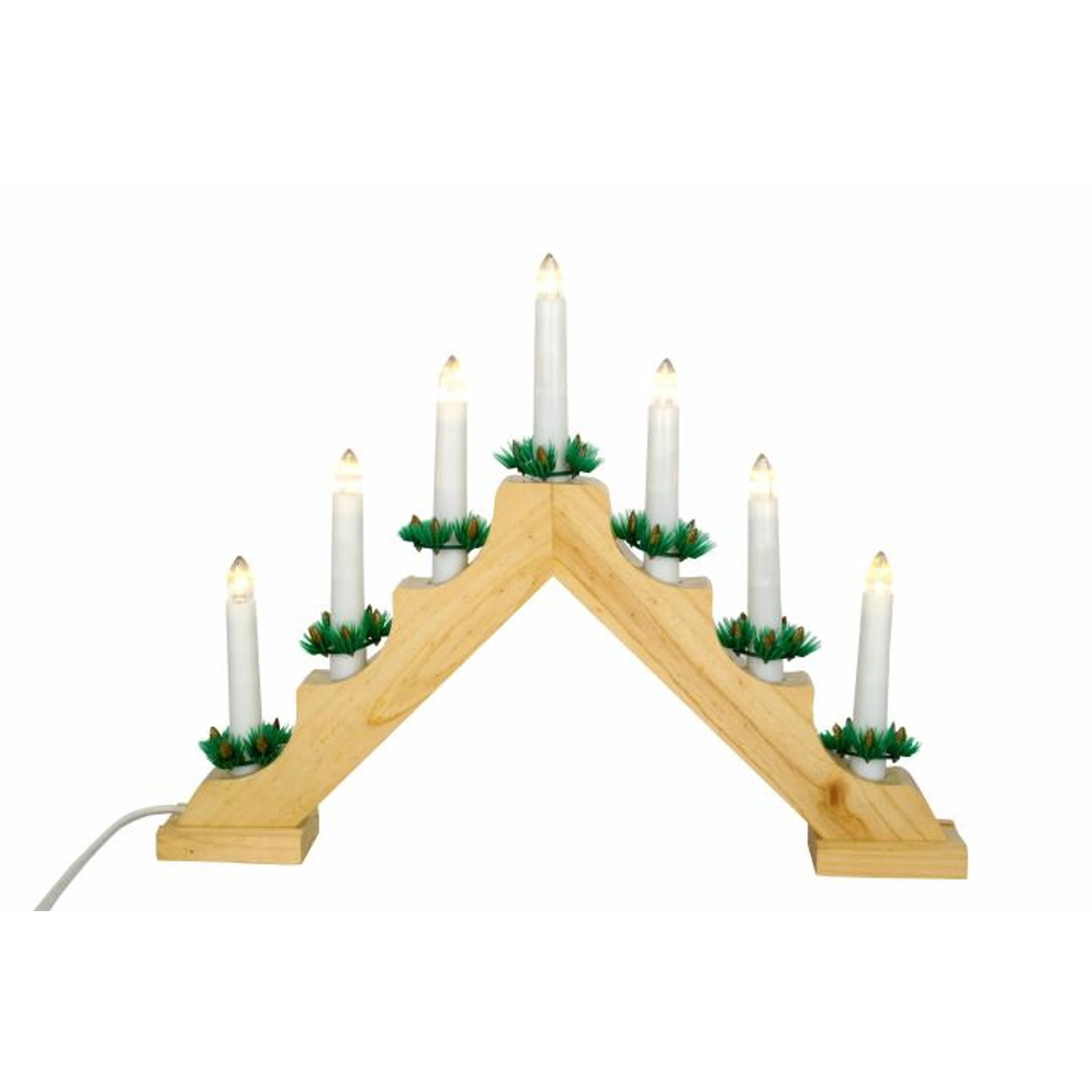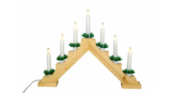 Štýlová vianočná izbová dekorácia - klasický svietnik. Svietnik obsahuje 7 LED diód vyžarujúcich teplé biele svetlo. Každá sviečka má na svojom konci umelú ihličnatú ozdobu. Svietnik je napájaný pomocou napájacieho kábla z elektrickej zásuvky.