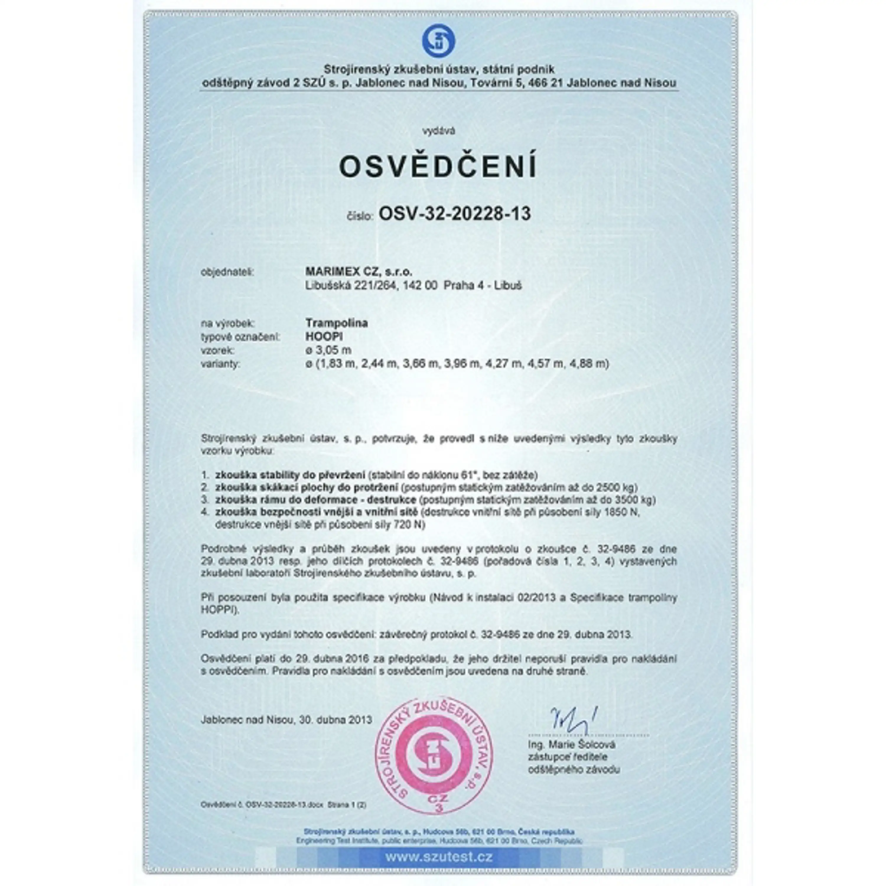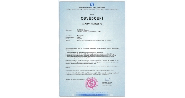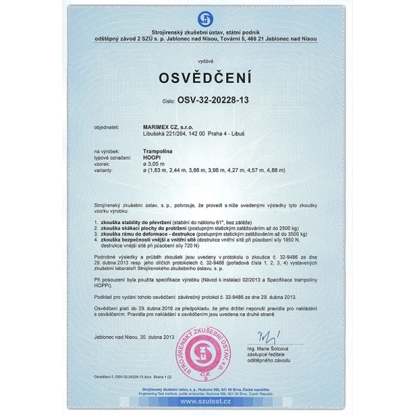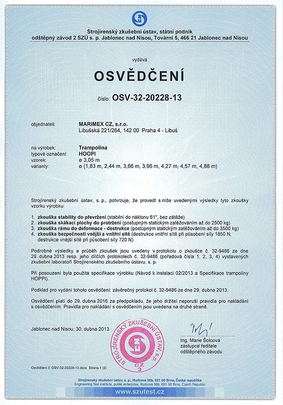 Ako všetky naše trampolíny spĺňa prísne bezpečnostné normy EN71 nemeckej skúšobne TÜV NORD a prešla testom PAHs.