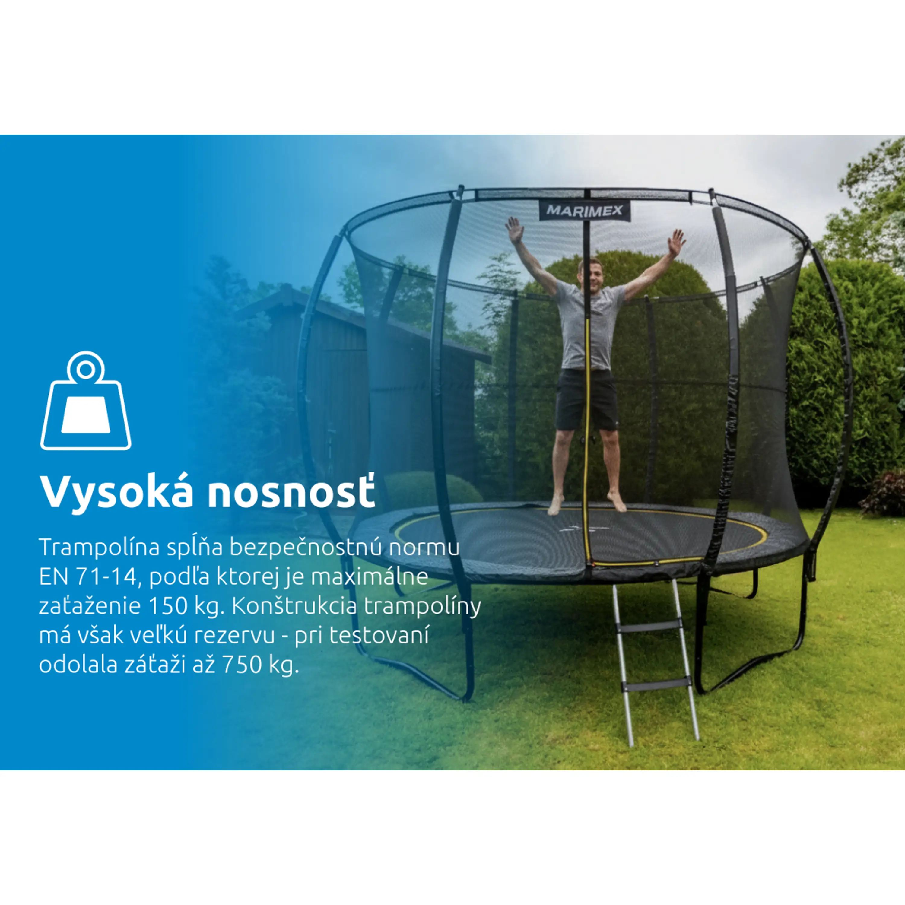 Bezpružinové trampolíny Marimex Comfort sú vyrobené z vysoko kvalitných materiálov a pomocou moderných technológií, vďaka čomu patria medzi najspoľahlivejšie na slovenskom trhu. Pevná a robustná konštrukcia zaisťuje dokonalú stabilitu. Pozinkovaná oceľ s čiernym dizajnovým náterom zaručuje dlhú životnosť a odolnosť voči poveternostným vplyvom. Vďaka nosnosti až 150 kg si môžu skákanie užiť aj dospelí, čo z trampolíny Comfort robí ideálnu voľbu pre aktívne rodiny.