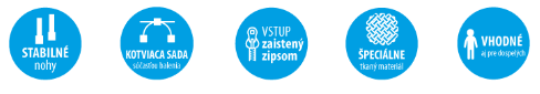- Unikátne konštrukčné riešenie umožňuje využiť 100 % priemeru trampolíny na skákanie, a to pri zachovaní vysokých nárokov na bezpečnosť a stabilitu