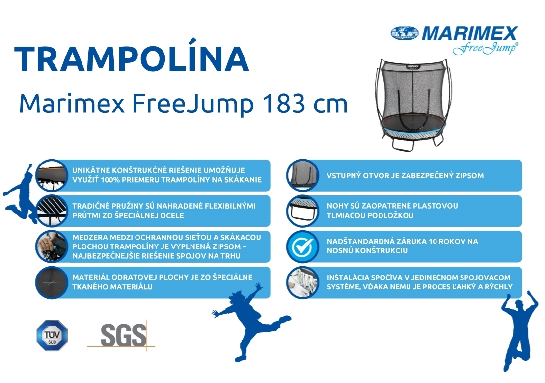 Trampolína Marimex FreeJump je nový prémiový rad. Bezpečnostná sieť je pevne spojená so skákacou plochou. Tradičné pružiny sú nahradené flexibilnými prútmi zo špeciálnej ocele, ktorá vyniká vysokou mierou húževnatosti. Výhodou je aj nadštandardná záruka 10 rokov na nosnú konštrukciu a 3 roky na odrazovú plochu a sieť.