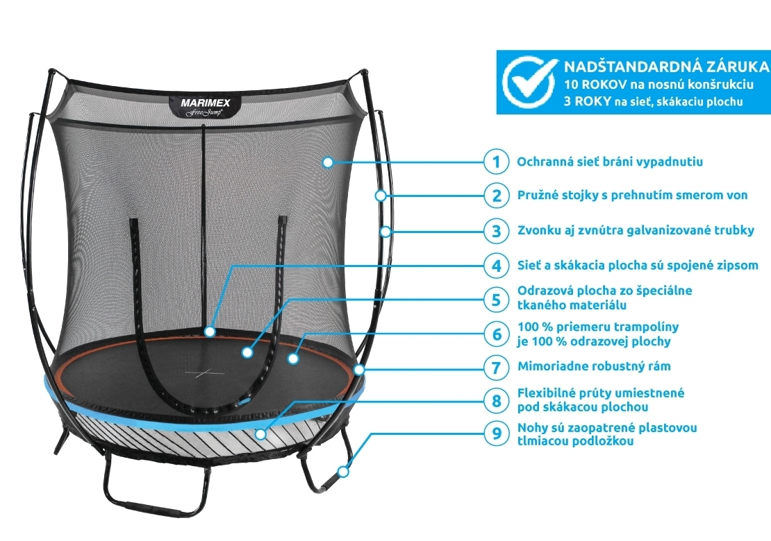 - Nadštandardná záruka 10 rokov na nosnú konštrukciu a 3 roky na odrazovú plochu a sieť