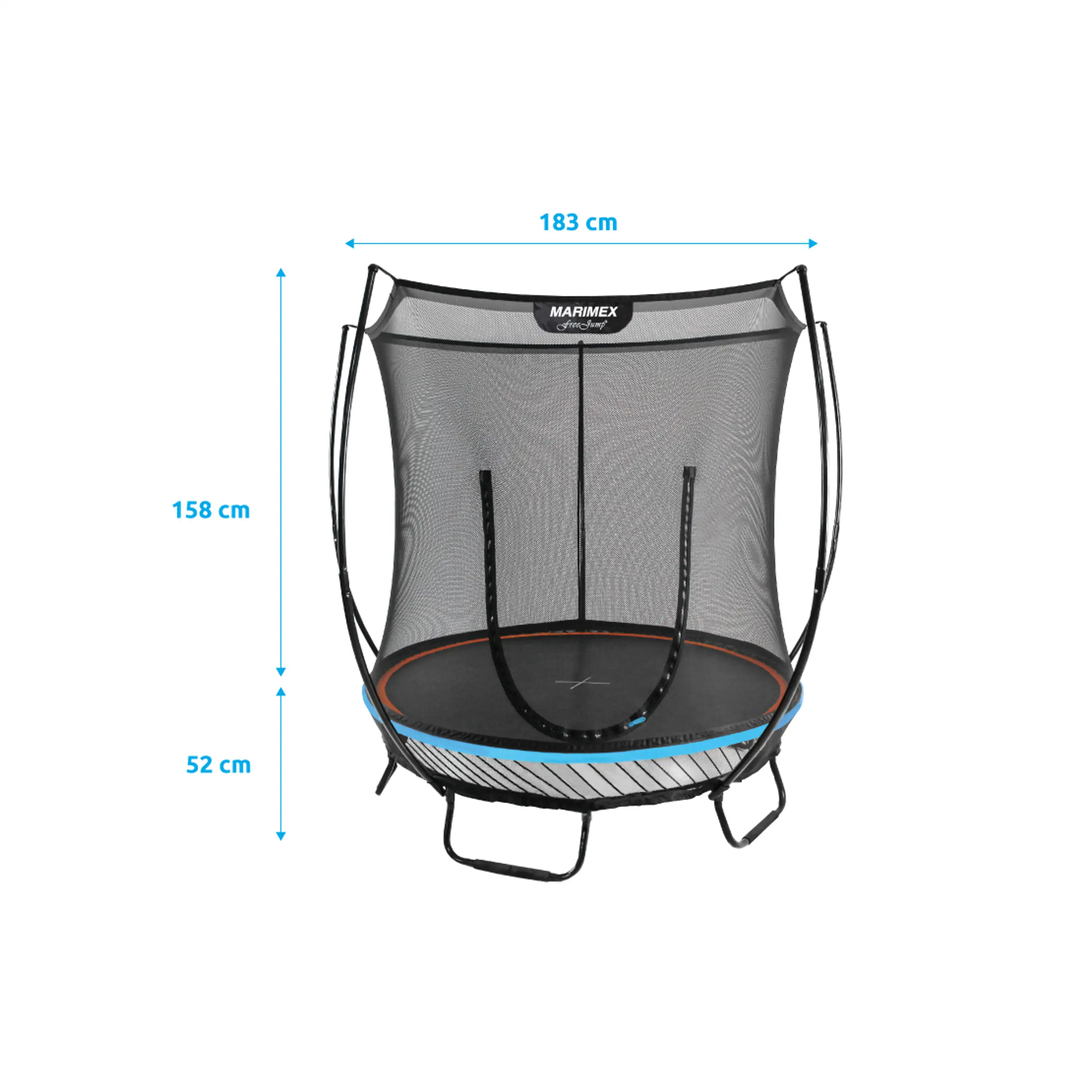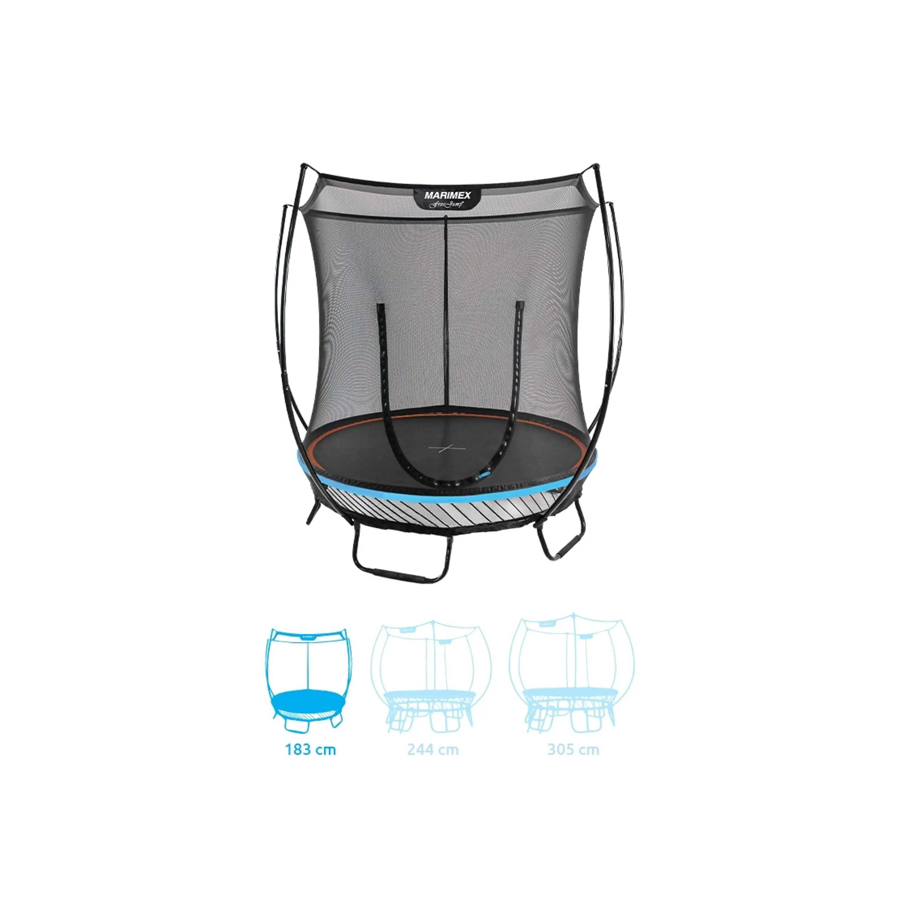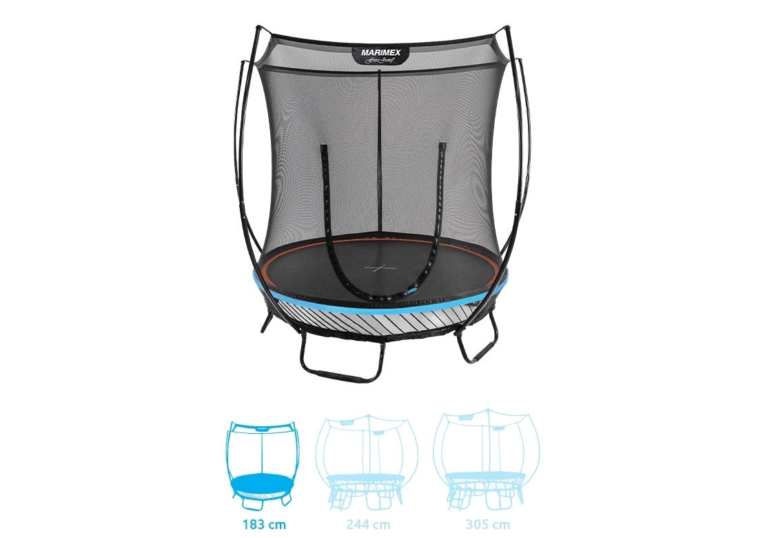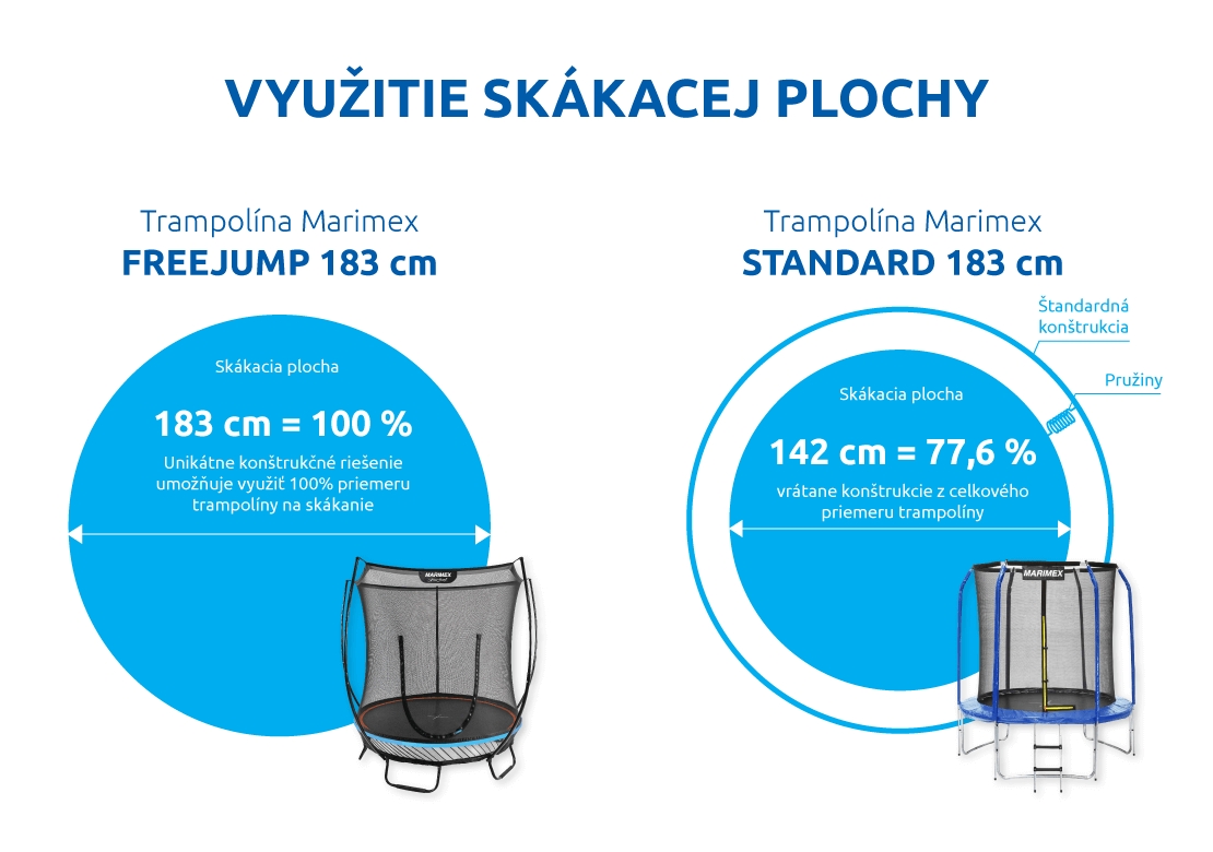 Trampolína Marimex FreeJump ponúka aktuálne najbezpečnejšie riešenie spoja na trhu, pretože medzera medzi ochrannou sieťou a skákacou plochou trampolíny je vyplnená zipsom. Tradičné pružiny sú nahradené flexibilnými prútmi zo špeciálnej ocele, ktorá vyniká vysokou mierou húževnatosti. Výhodou je aj nadštandardná záruka 5 rokov na nosnú konštrukciu a 3 roky na odrazovú plochu a sieť.