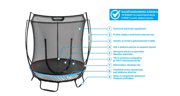 - Nadštandardná záruka 5 rokov na nosnú konštrukciu a 3 roky na odrazovú plochu a sieť