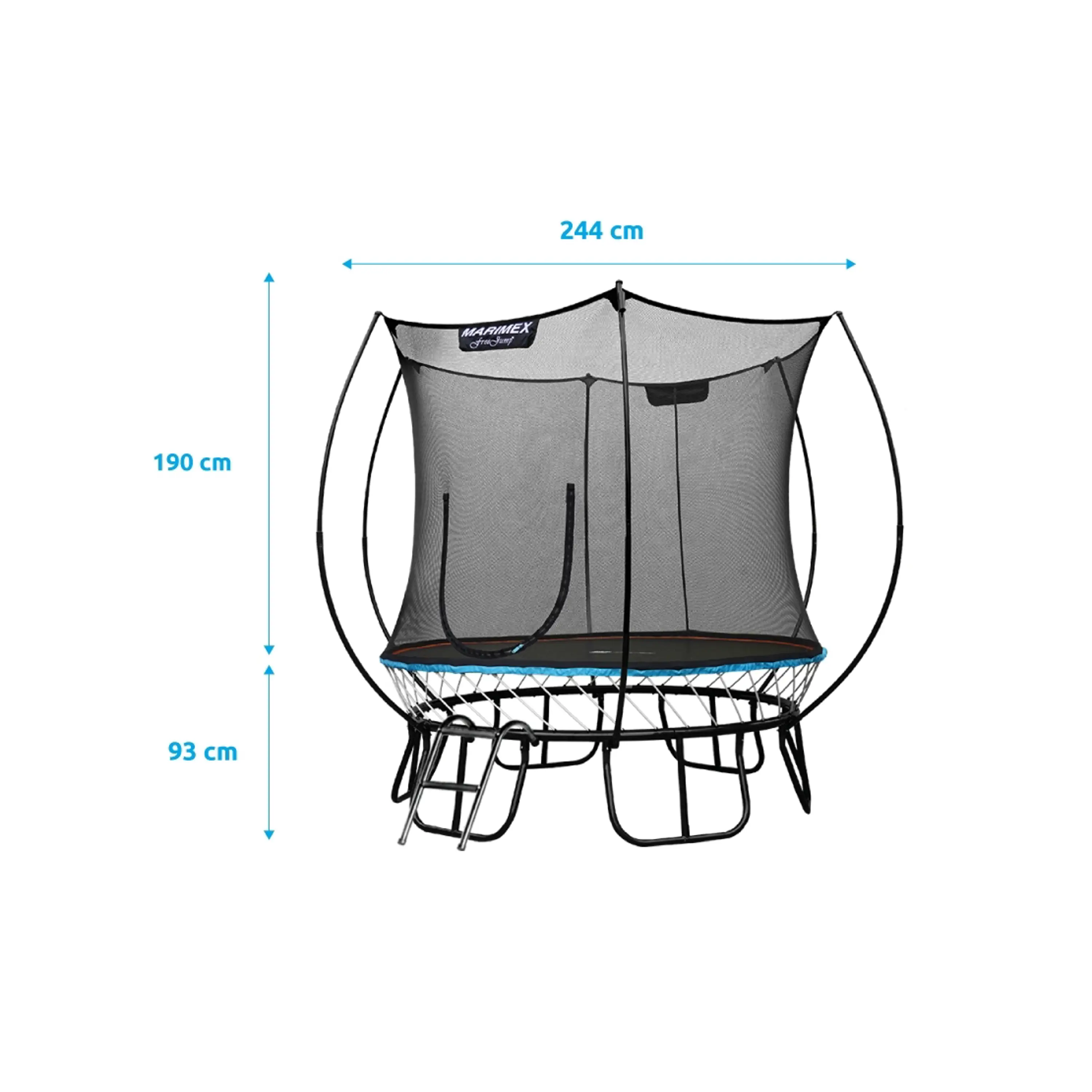 Trampolína Marimex FreeJump ponúka aktuálne najbezpečnejšie riešenie spoja na trhu, pretože medzera medzi ochrannou sieťou a skákacou plochou trampolíny je vyplnená zipsom. Tradičné pružiny sú nahradené flexibilnými prútmi zo špeciálnej ocele, ktorá vyniká vysokou mierou húževnatosti. Výhodou je aj nadštandardná záruka 10 rokov na nosnú konštrukciu a 3 roky na odrazovú plochu, sieť a rebrík.