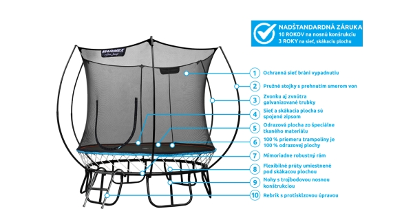 - Nadštandardná záruka 5 rokov na nosnú konštrukciu a 3 roky na odrazovú plochu a sieť