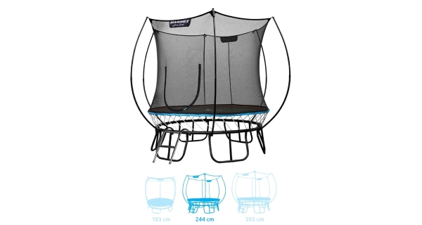 - Unikátne konštrukčné riešenie umožňuje využiť 100% priemeru trampolíny na skákanie, a to pri zachovaní vysokých nárokov na bezpečnosť a stabilitu