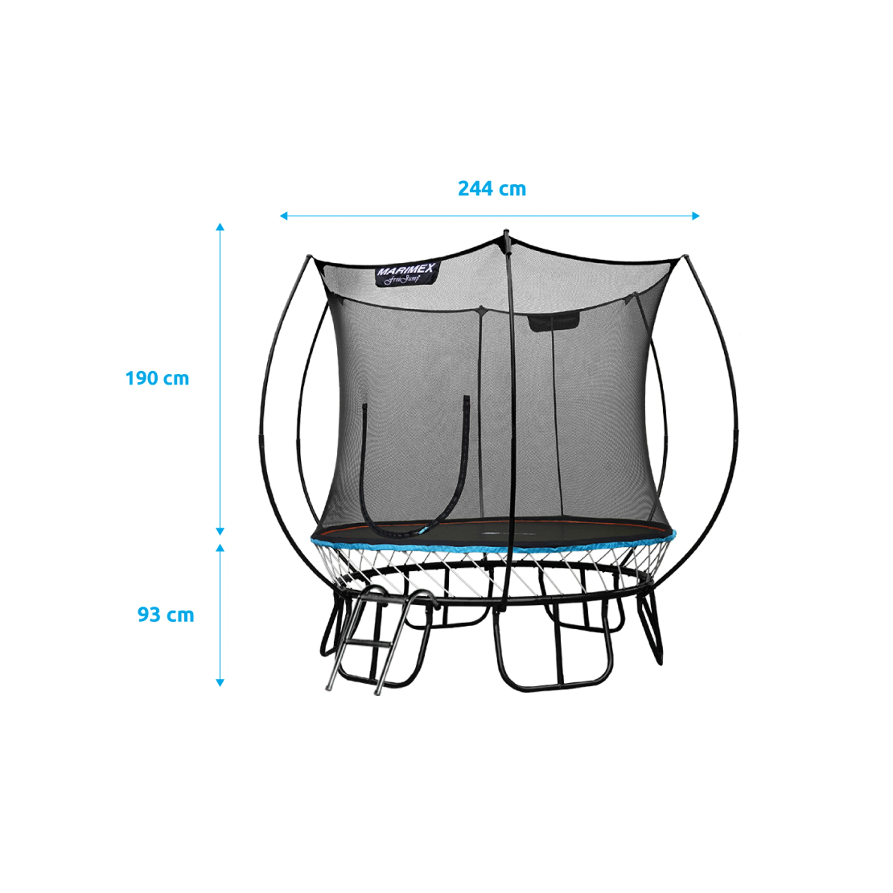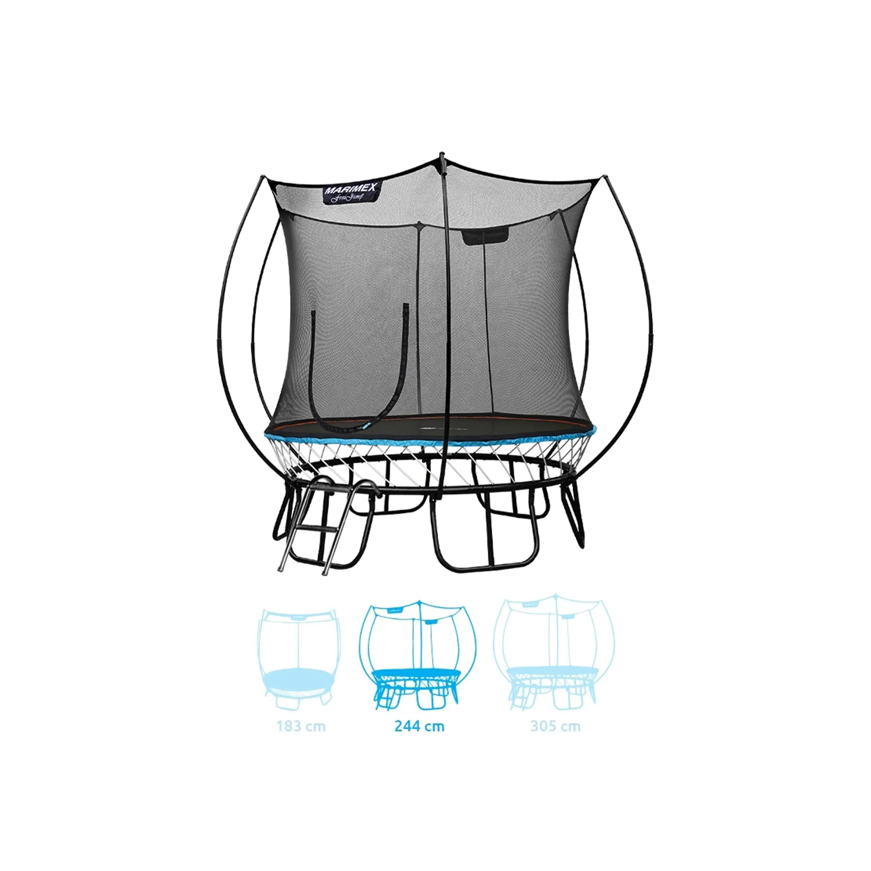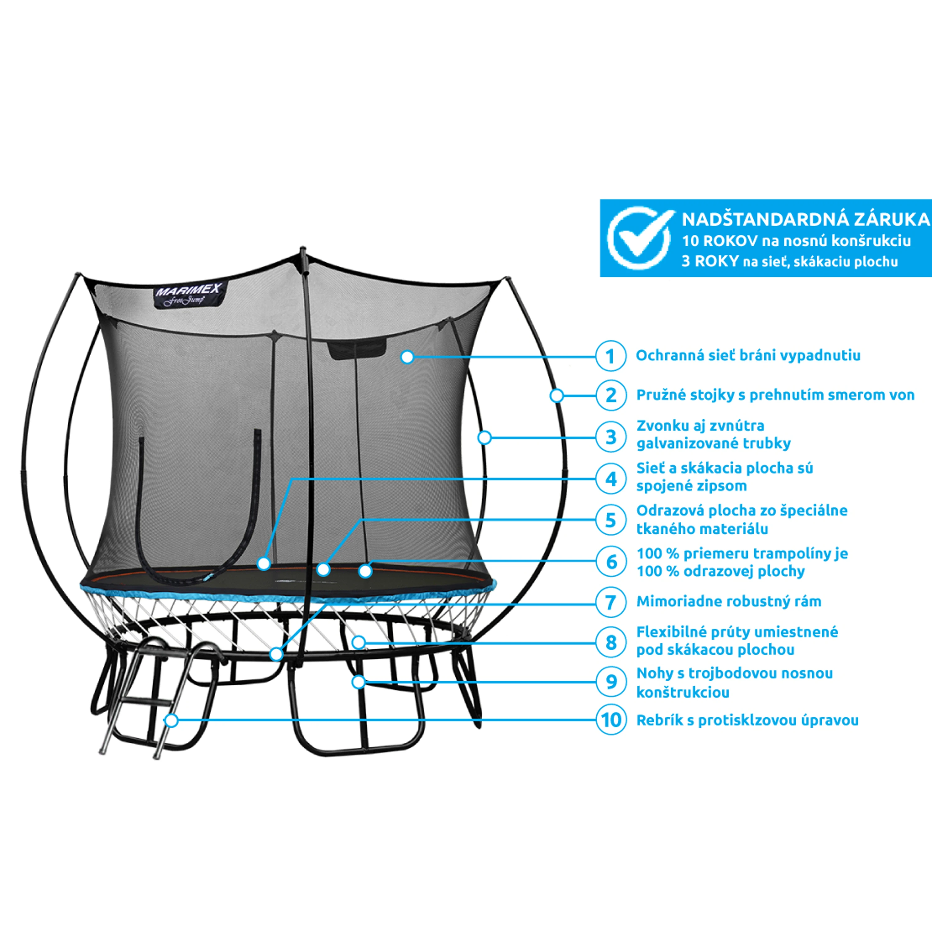 Trampolína Marimex FreeJumpponúka aktuálne najbezpečnejšie riešenie spoja na trhu, pretože medzera medzi ochrannou sieťou a skákacou plochou trampolíny je vyplnená zipsom. Tradičné pružiny sú nahradené flexibilnými prútmi zo špeciálnej ocele, ktorá vyniká vysokou mierou húževnatosti. Výhodou je aj nadštandardná záruka 5 rokov na nosnú konštrukciu a 3 roky na odrazovú plochu a sieť.