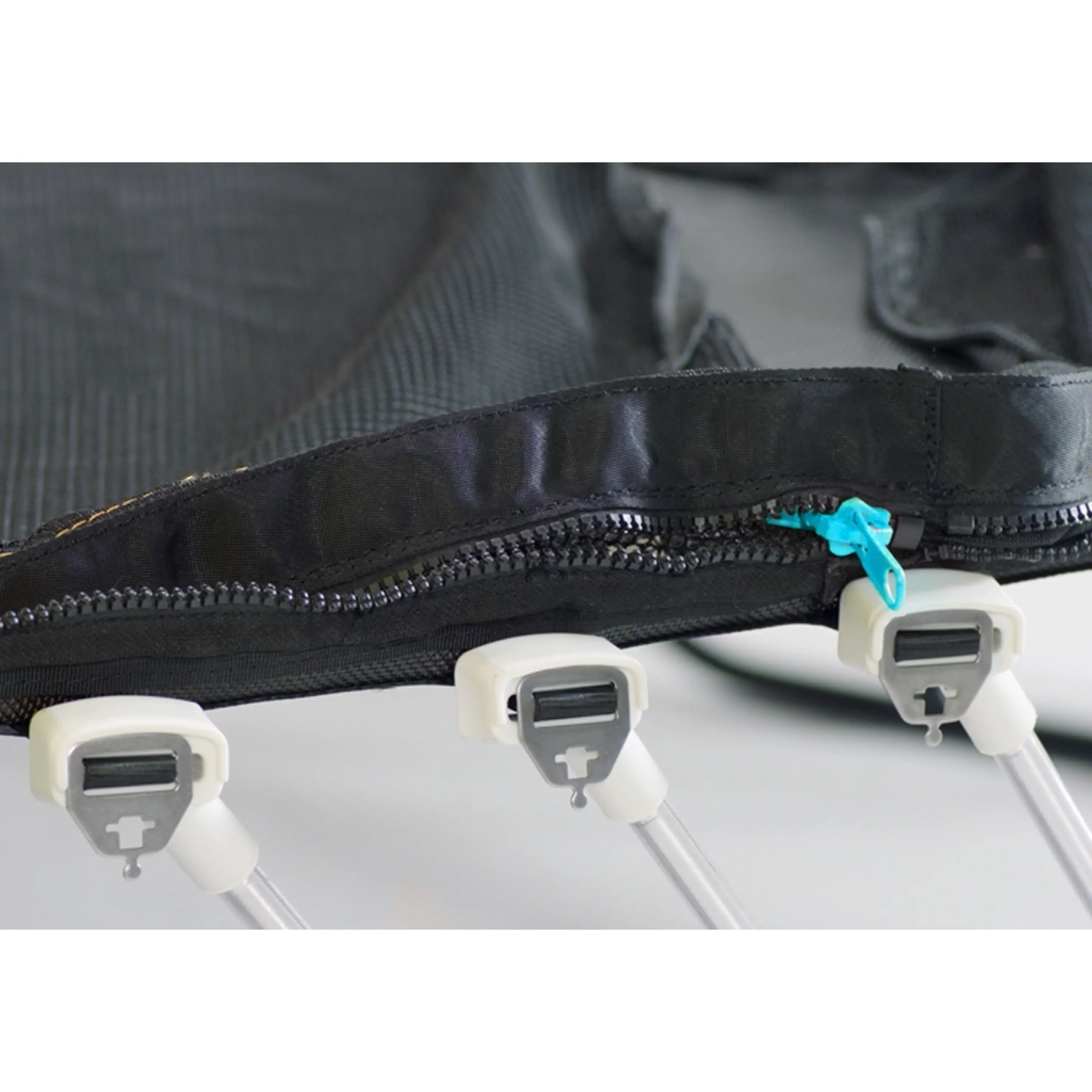 - Medzera medzi ochrannou sieťou a skákacou plochou trampolíny je vyplnená zipsom. Aktuálne je to najbezpečnejšie riešenie spoja na trhu
