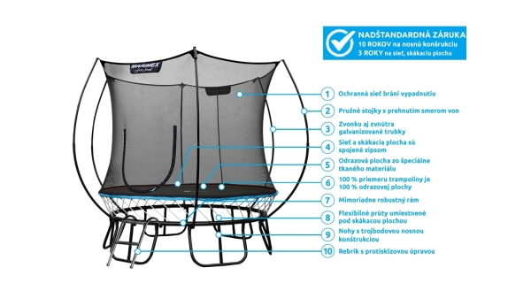 - Nadštandardná záruka 10 rokov na nosnú konštrukciu a 3 roky na odrazovú plochu, sieť a rebrík
