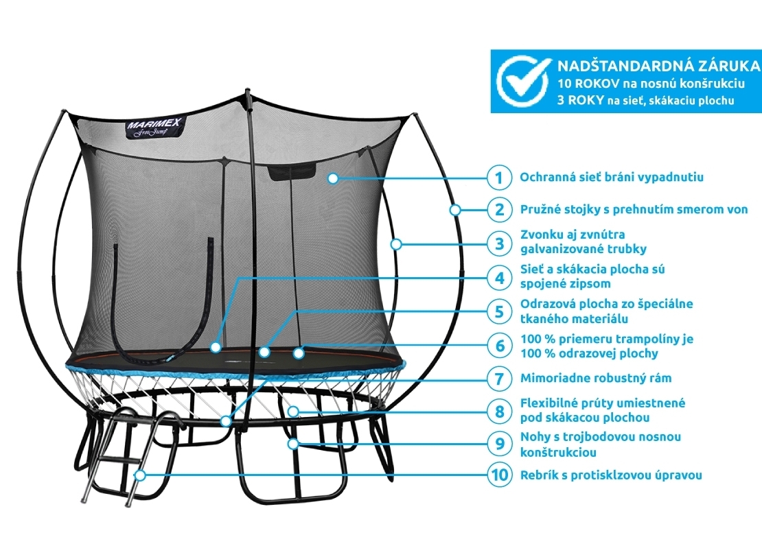 Trampolína Marimex FreeJump ponúka aktuálne najbezpečnejšie riešenie spoja na trhu, pretože medzera medzi ochrannou sieťou a skákacou plochou trampolíny je vyplnená zipsom. Tradičné pružiny sú nahradené flexibilnými prútmi zo špeciálnej ocele, ktorá vyniká vysokou mierou húževnatosti. Výhodou je aj nadštandardná záruka 10 rokov na nosnú konštrukciu a 3 roky na odrazovú plochu, sieť a rebrík.
