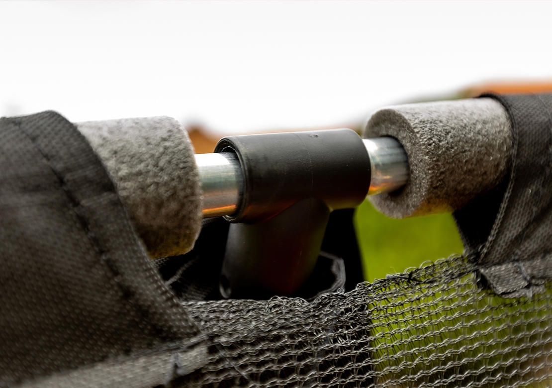 - Horná obruč trampolíny spojená so stojkami pomocou T-spojov, T-spoje prispievajú k stabilite trampolín a ľahšej montáži