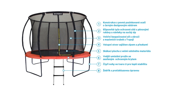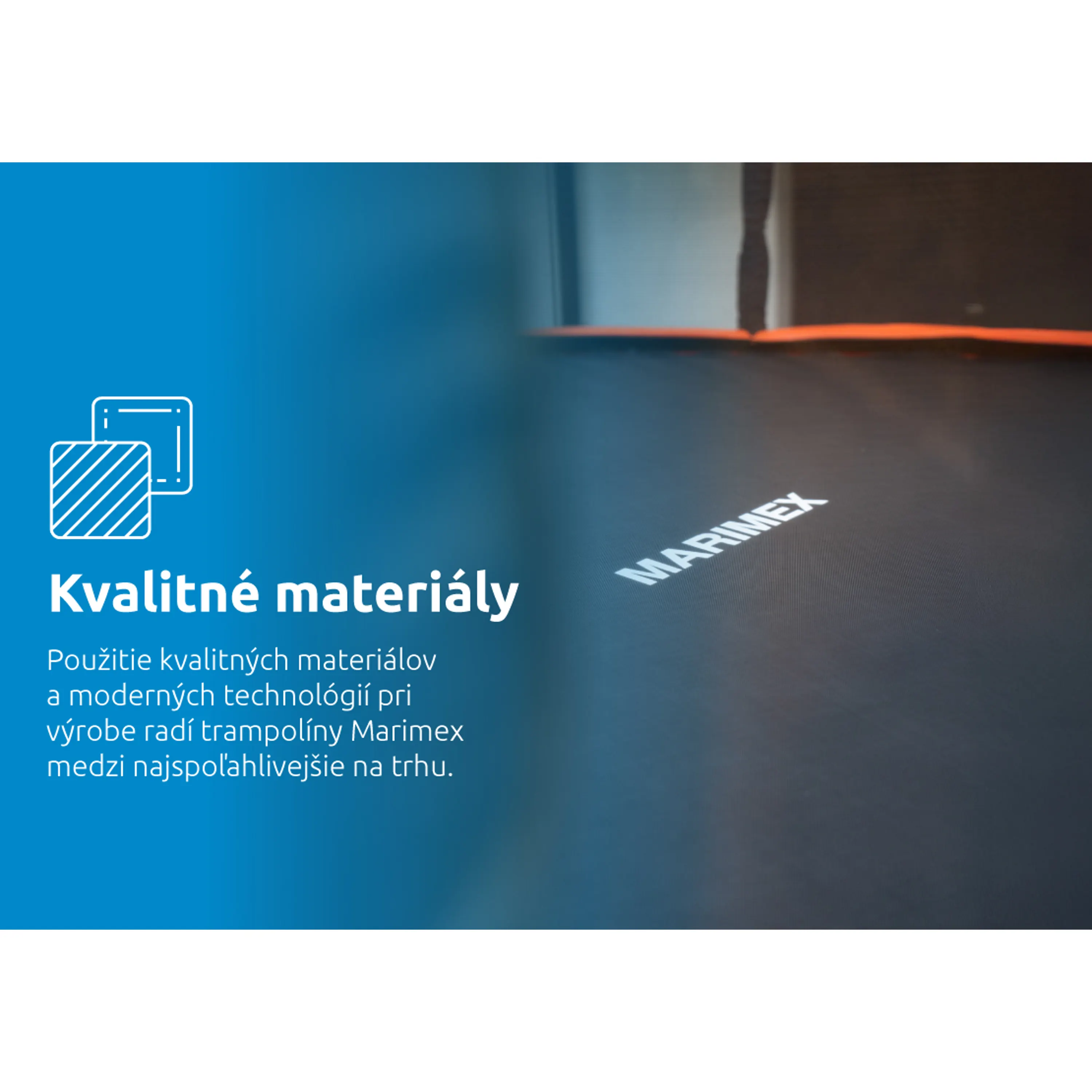 Trampolíny Marimex Premium nevynikajú iba novým dizajnom a farebnosťou, ale aj väčšou stabilitou, pevnosťou a bezpečnosťou. Bezpečnosť zaisťujú zosilnené ochranné kryty pružín a nová technológia T-spojov. Vnútornú ochrannú sieť podopiera osem dynamicky prehnutých tyčí a napnutú ju drží spevnená horná obruč. Skákacia plocha je vyrobená z veľmi odolného a neabrazívneho materiálu s vysokou životnosťou.