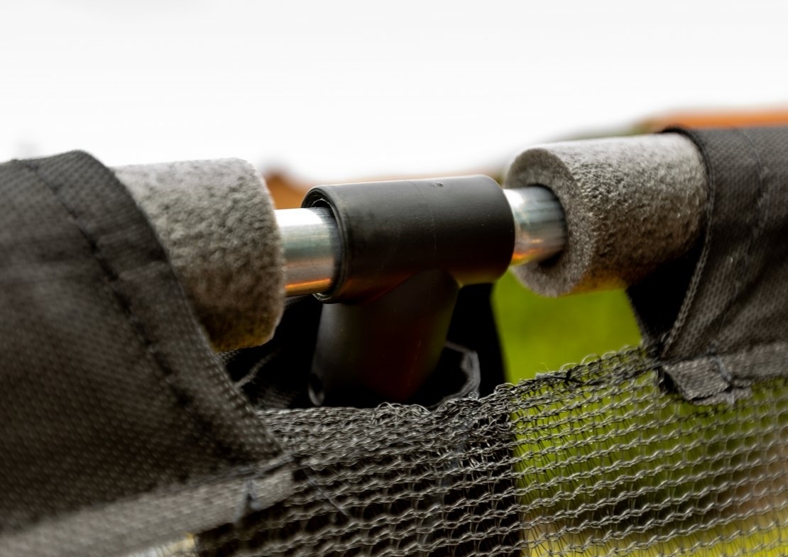- Horný obruč trampolíny spojená so stojnami pomocou T-spojov; T-spoje prispievajú k stabilite trampolíny a jednoduchšej montáži