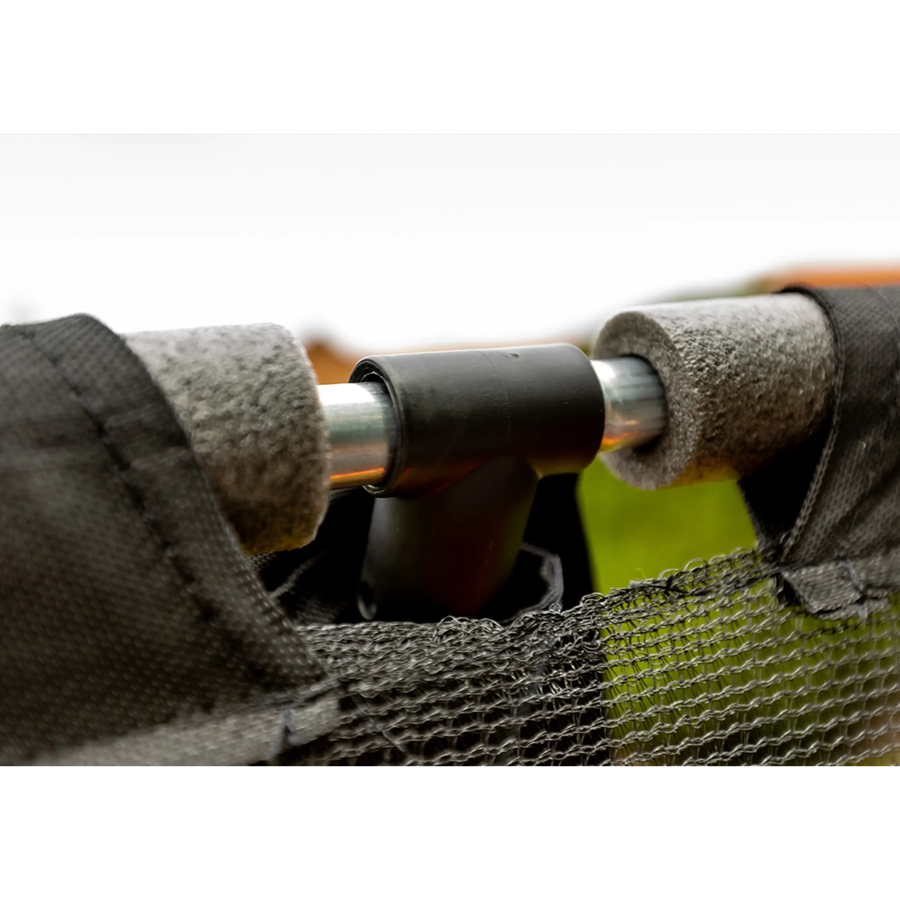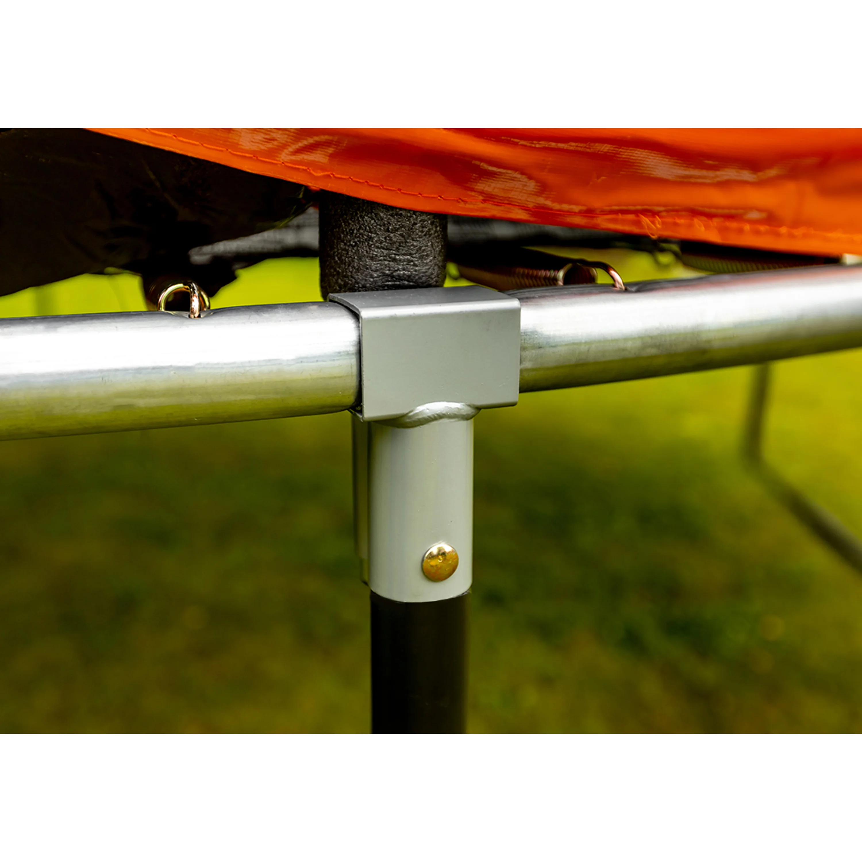 - Horná obruč trampolíny spojená so stojkami pomocou T-spojov, T-spoje prispievajú k stabilite trampolín a ľahšej montáže