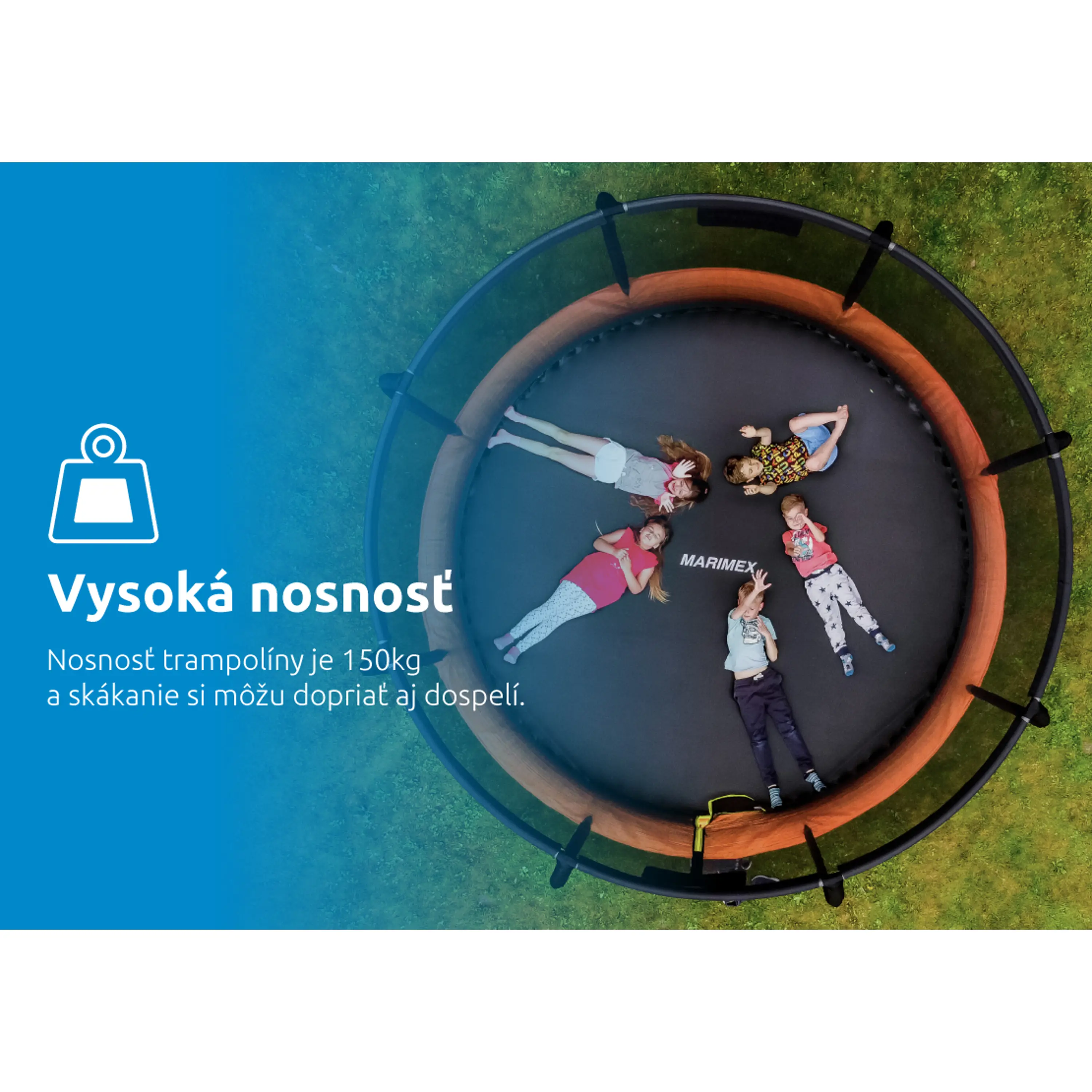 Trampolína Marimex Premium je skvelým doplnkom každej záhrady. Deti skákanie na trampolíne milujú a pri skákaní si ľahko zacvičia aj dospelí – nosnosť je až 150 kg. Dokonalú stabilitu zaisťujú štyri nohy v tvare písmena U.