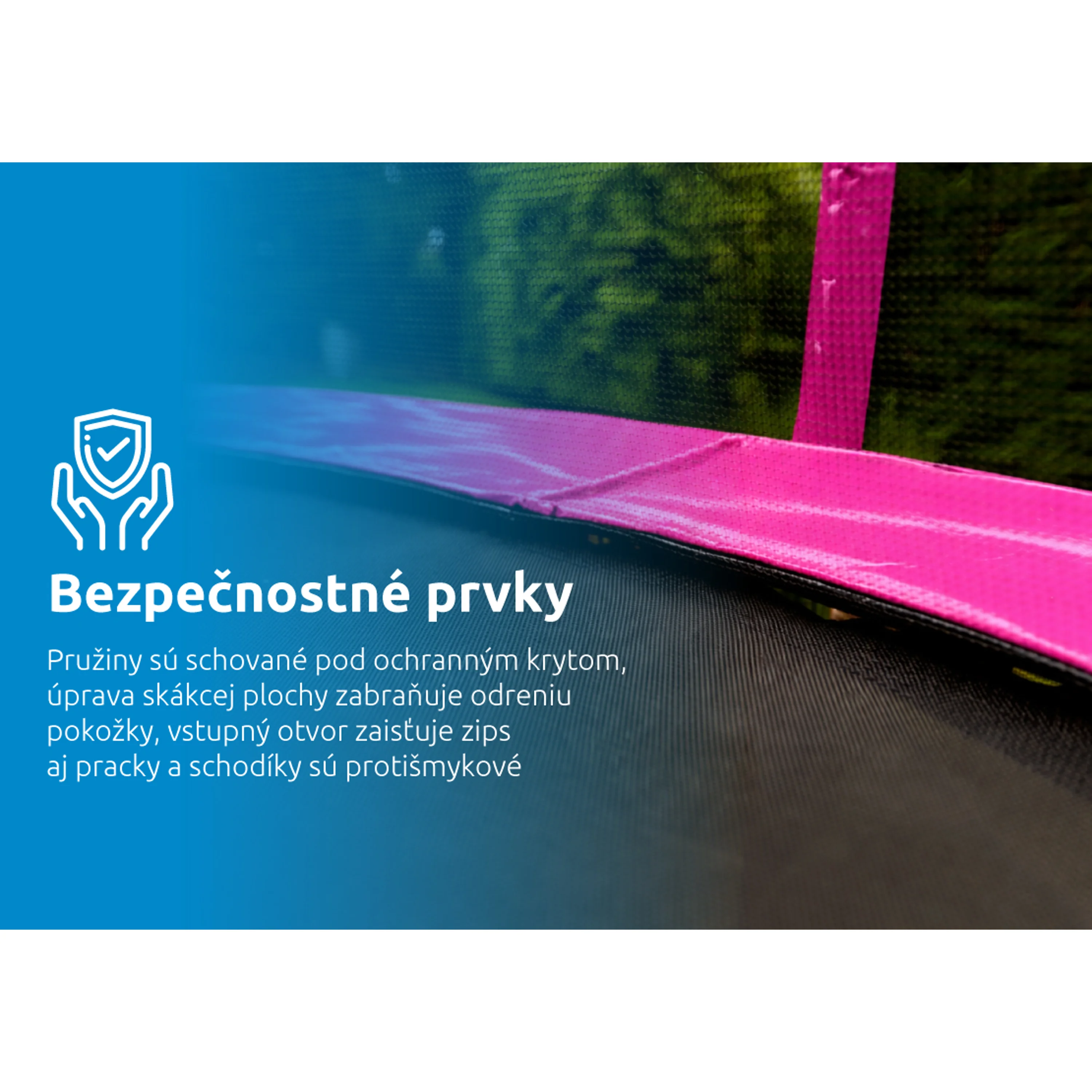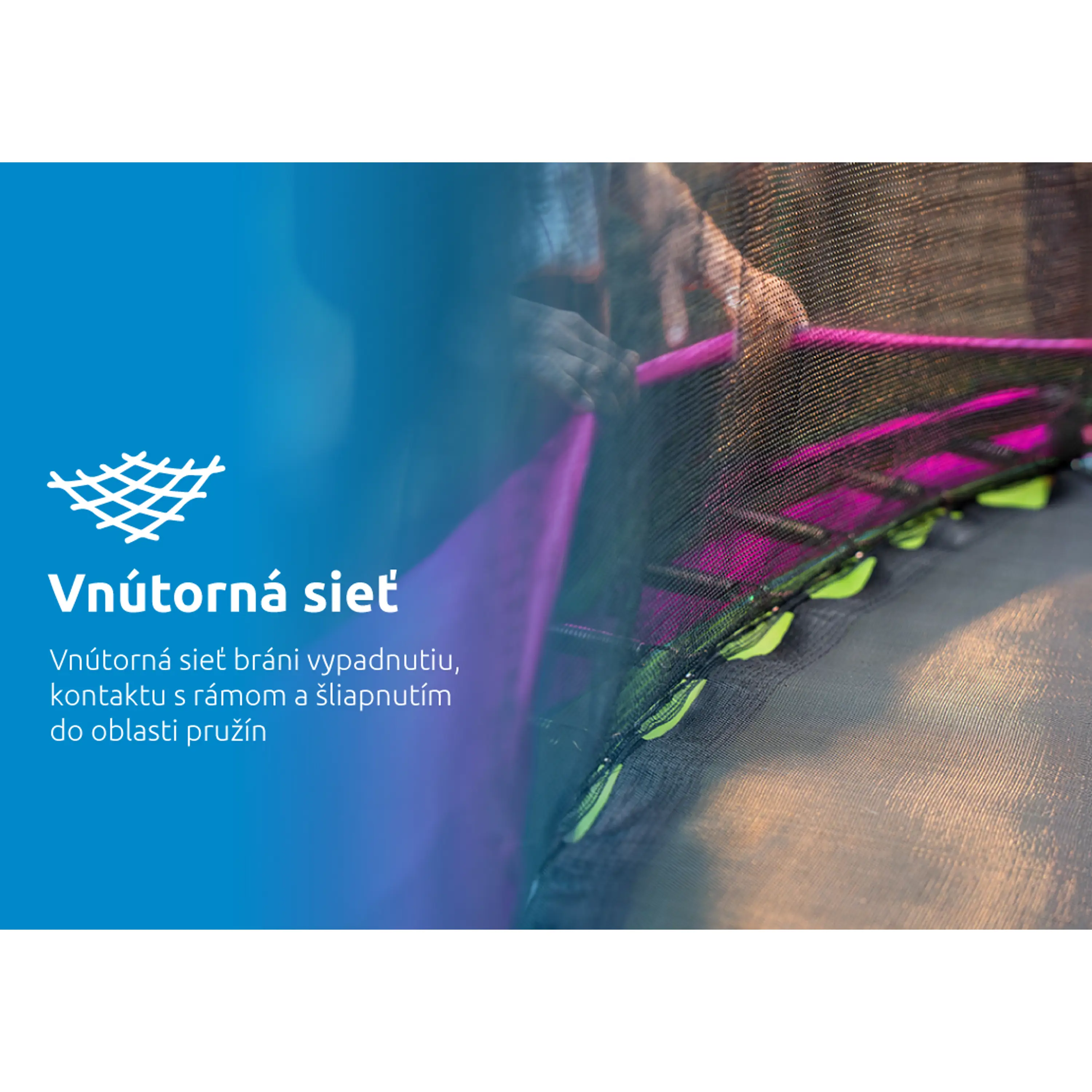 Vnútorná ochranná sieťvýnimočnosť vnútornej ochrannej siete spočíva v umiestnení v tesnej blízkosti skákacej plochy. Bráni vypadnutiu, kontaktu s rámom a šliapnutiu do oblasti pružín. |