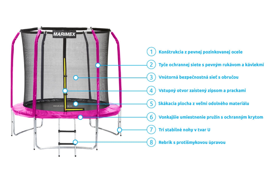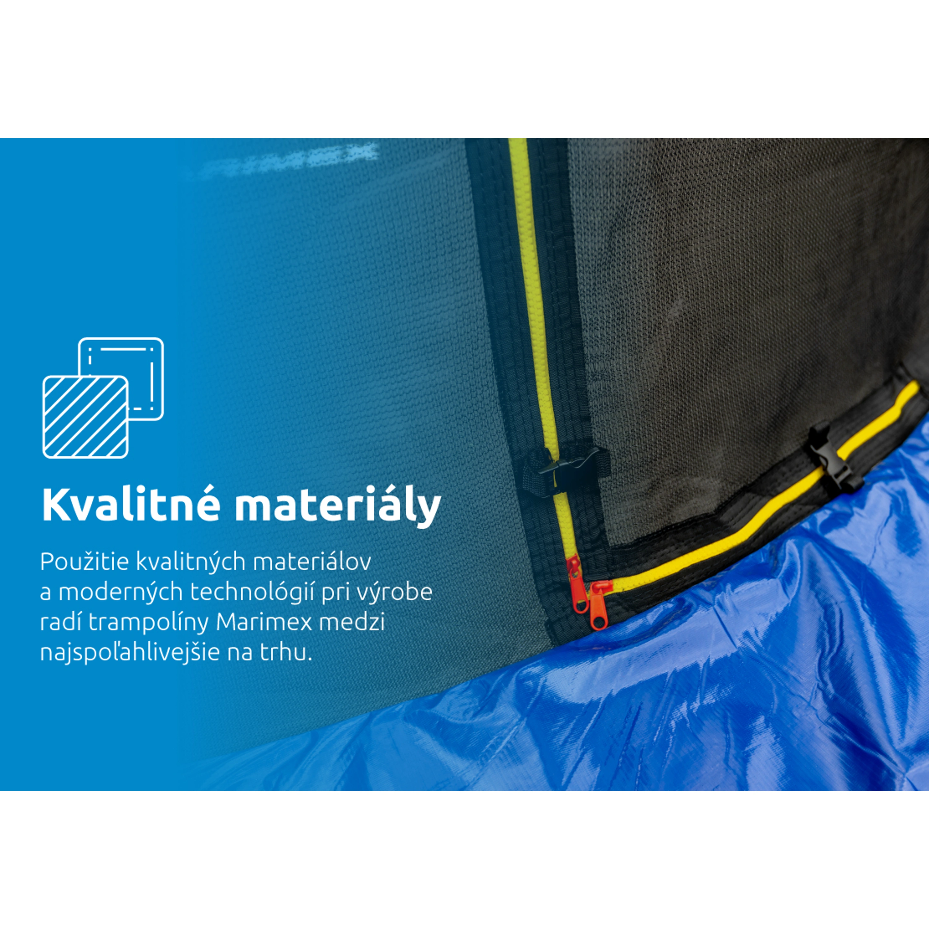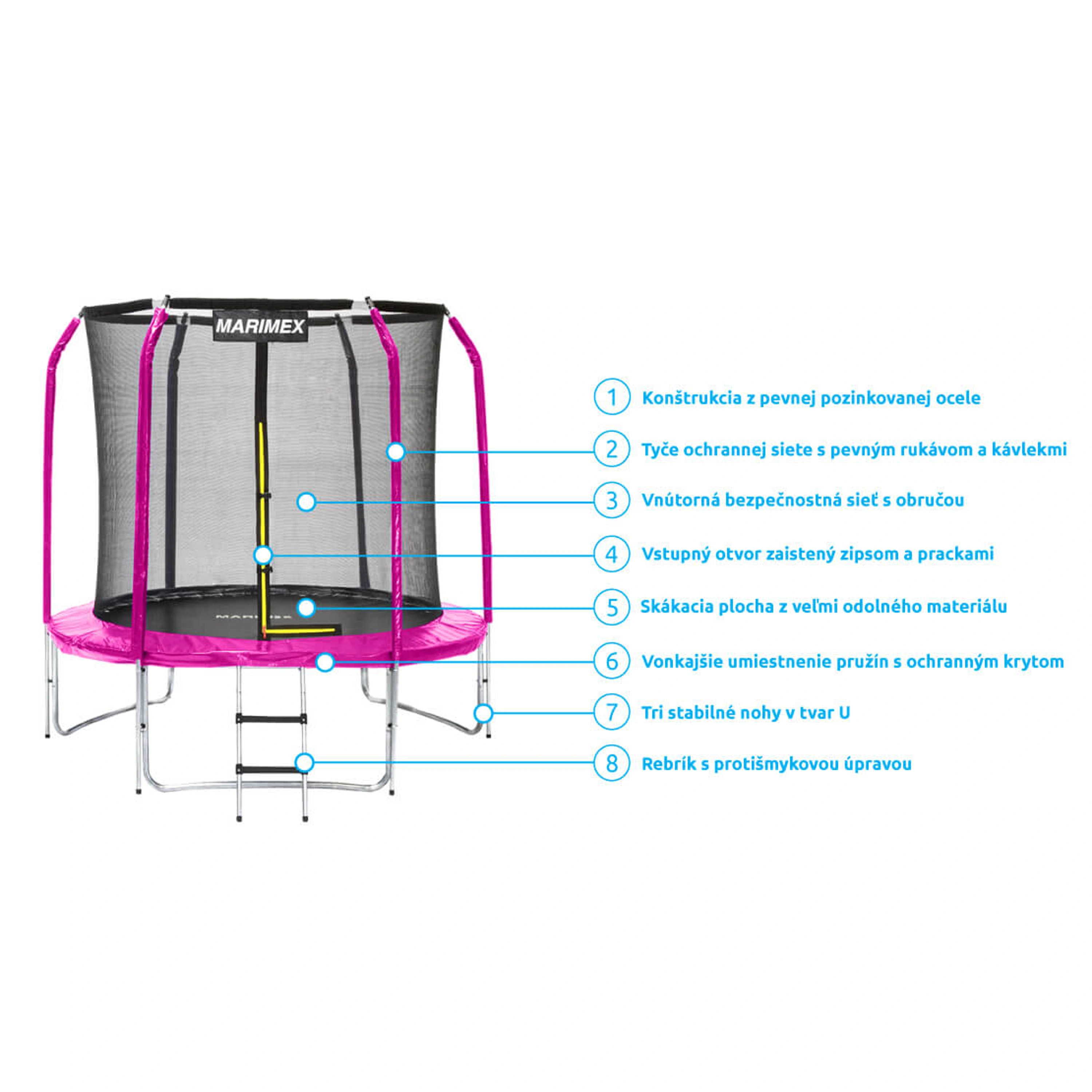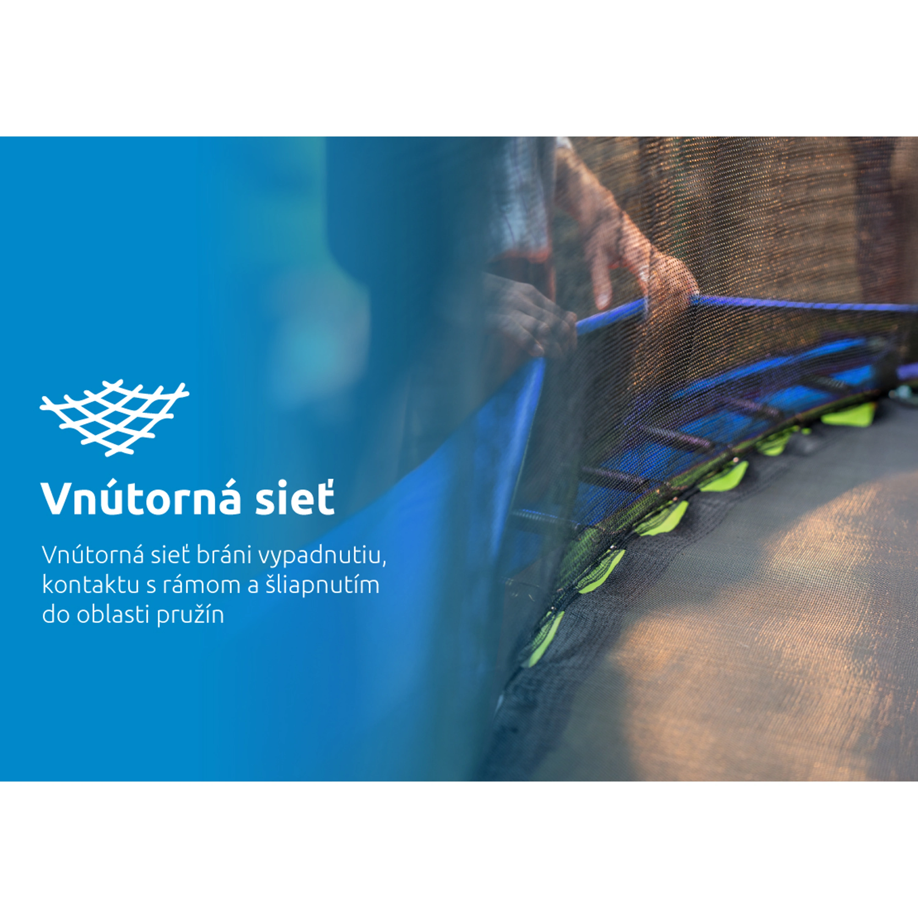 Vnútornú ochrannú sieť nájdete priamo v balení, nemusíte si ju dokupovať zvlášť. Vnútorná ochranná sieť je bezpečnejšia než vonkajšia sieť - bráni prístupu skákajúceho do časti s pružinami. Vstupný priestor je zaistený tromi prackami a bráni vypadnutiu. Tyče sú obalené ochranným návlekom z mäkčenej peny. Nohy trampolíny sú samostatné a zvyšujú stabilitu celej trampolíny. Spojenie tyčí nôh trampolíny a siete je istené špeciálnymi sponami.