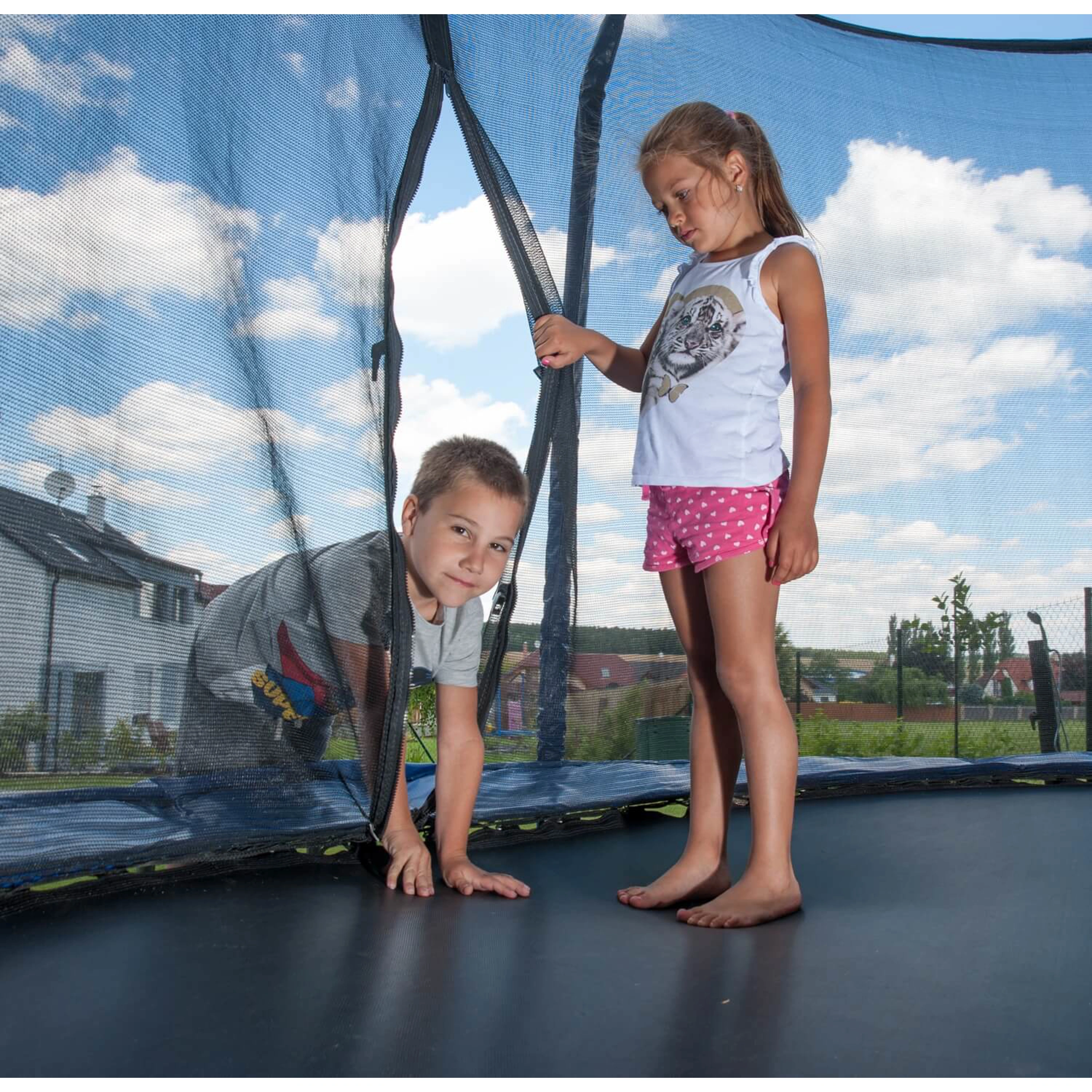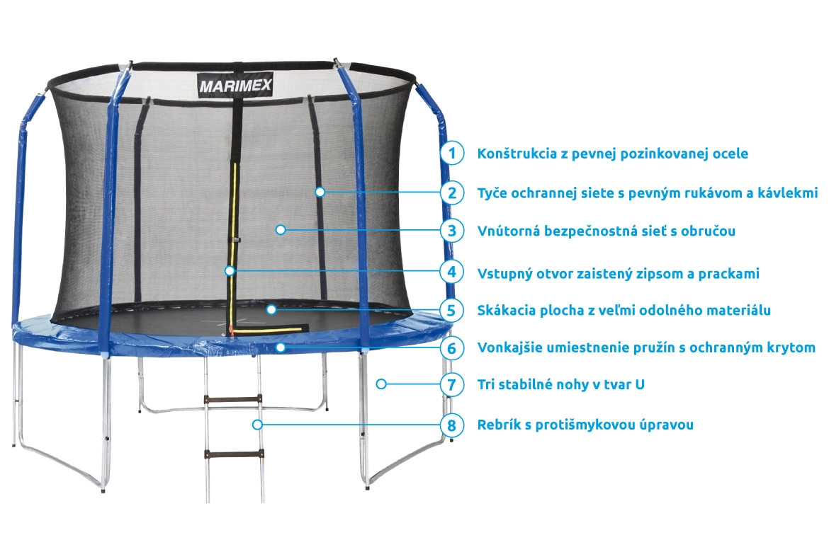Vnútornú ochrannú sieť nájdete priamo v balení, nemusíte si ju dokupovať zvlášť. Vnútorná ochranná sieť je bezpečnejšia ako vonkajšia sieť - bráni prístupu skákajúceho do časti s pružinami. Vstupný priestor je zaistený tromi prackami a bráni vypadnutiu. Tyče sú obalené ochranným návlekom z mäkčenej peny. Nohy trampolíny sú samostatné a zvyšujú stabilitu celej trampolíny. Spojenie tyčí nôh trampolíny a siete je istené špeciálnymi sponami.