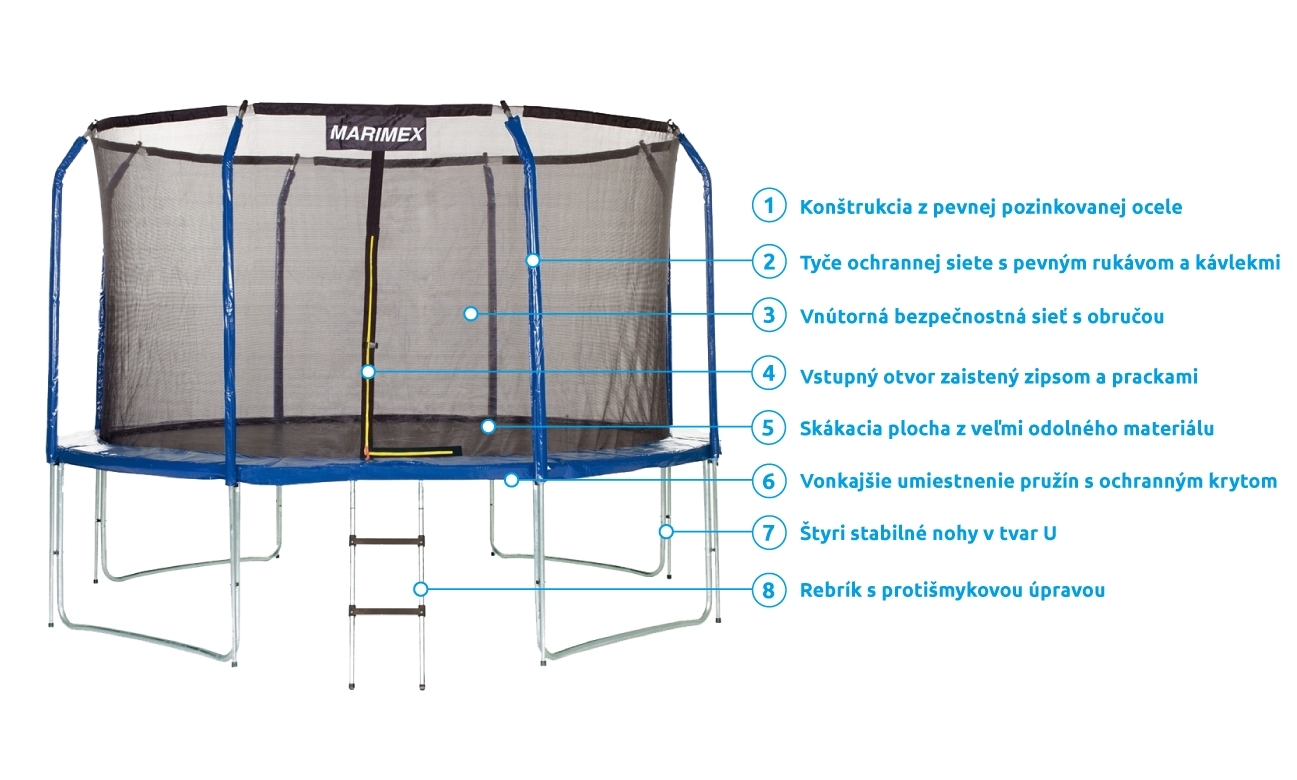 Vnútornú ochrannú sieť nájdete priamo v balení, nemusíte si ju dokupovať zvlášť. Vnútorná ochranná sieť je bezpečnejšia ako vonkajšia sieť - bráni prístupu skákajúceho do časti s pružinami. Vstupný priestor je zaistený tromi prackami a bráni vypadnutiu. Tyče sú obalené ochranným návlekom z mäkčenej peny. Nohy trampolíny sú samostatné a zvyšujú stabilitu celej trampolíny. Spojenie tyčí nôh trampolíny a siete je istené špeciálnymi sponami.