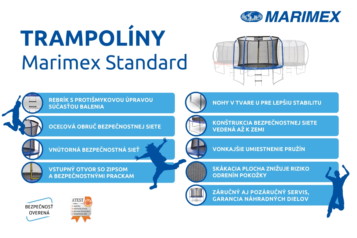 Trampolína Marimex Standard je skvelým doplnkom každej záhrady. Deti skákanie na trampolíne milujú a pri skákaní si ľahko zacvičia aj dospelí - nosnosť je až 150 kg. Dokonalú stabilitu zaisťuje päť nôh v tvare písmena U. Táto trampolína je z našej ponuky najväčšia.